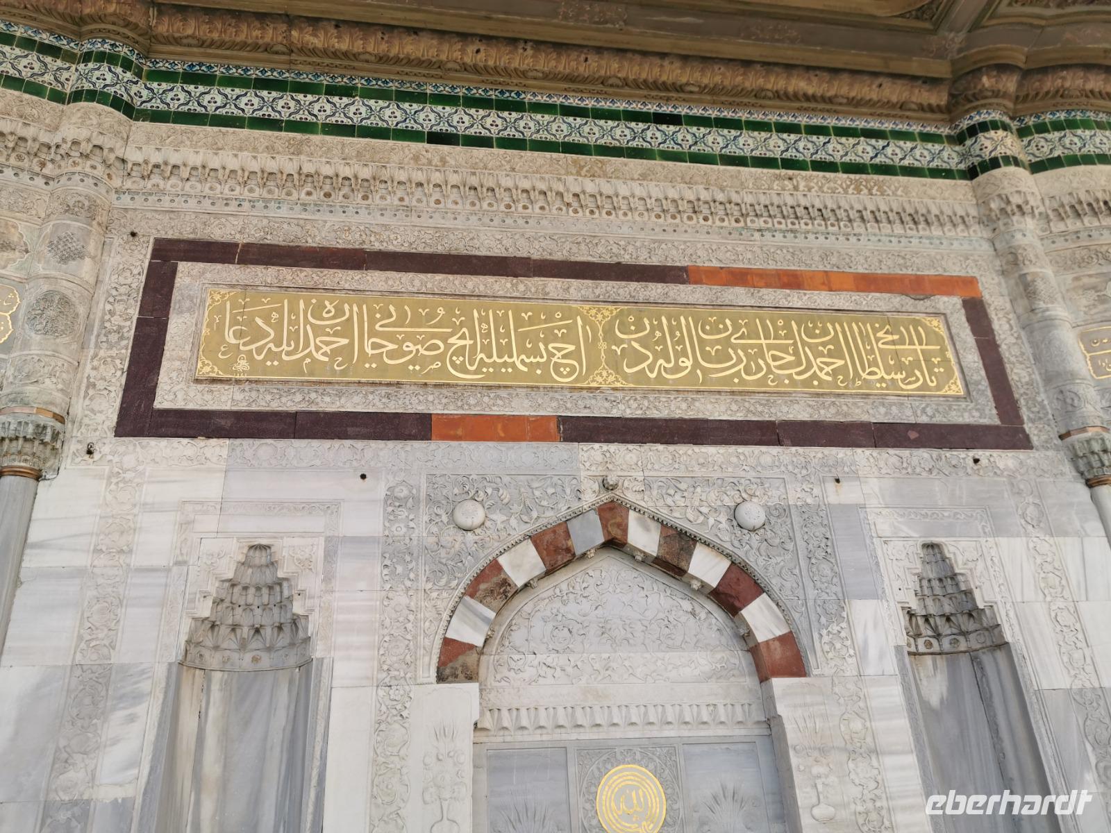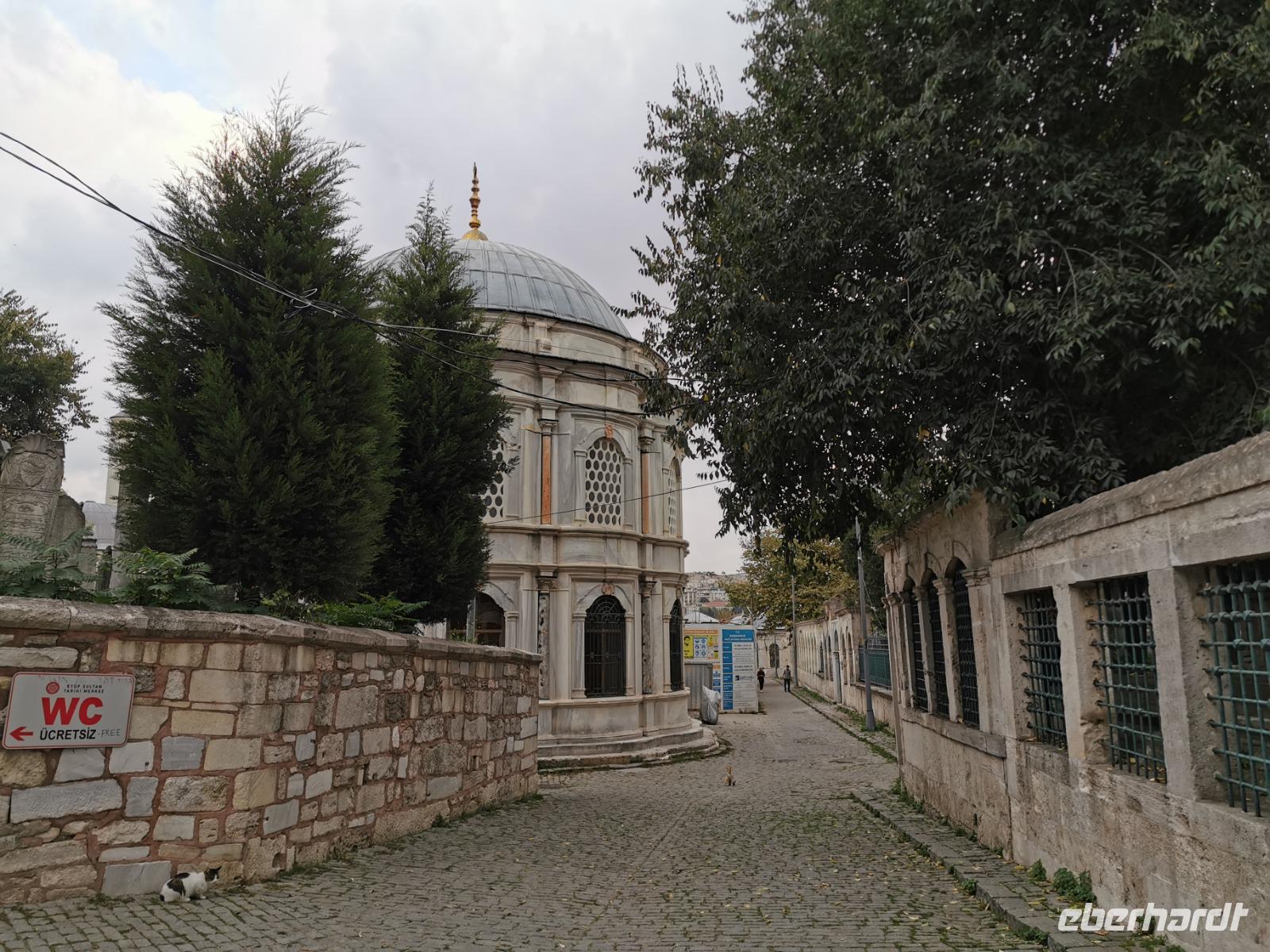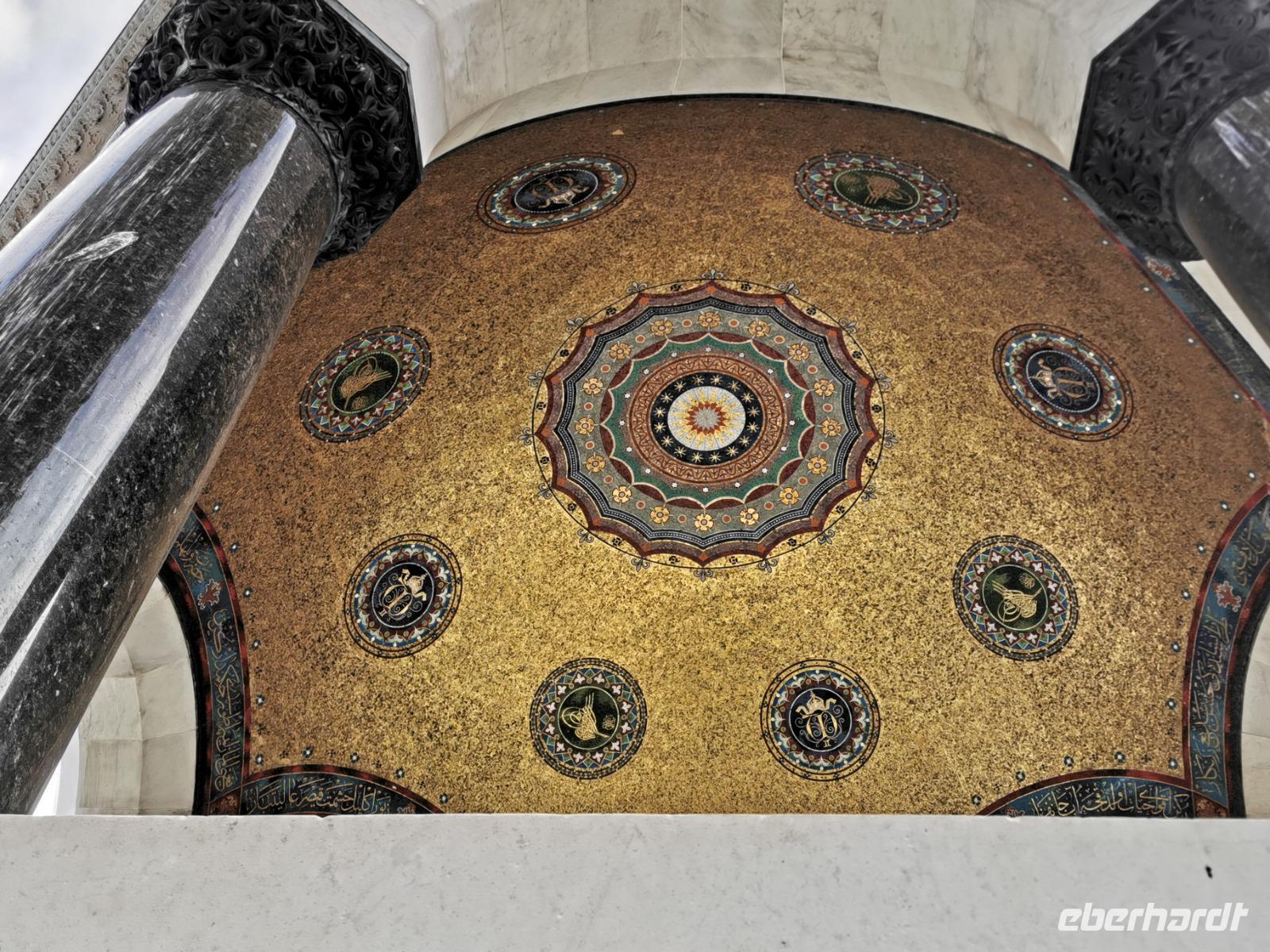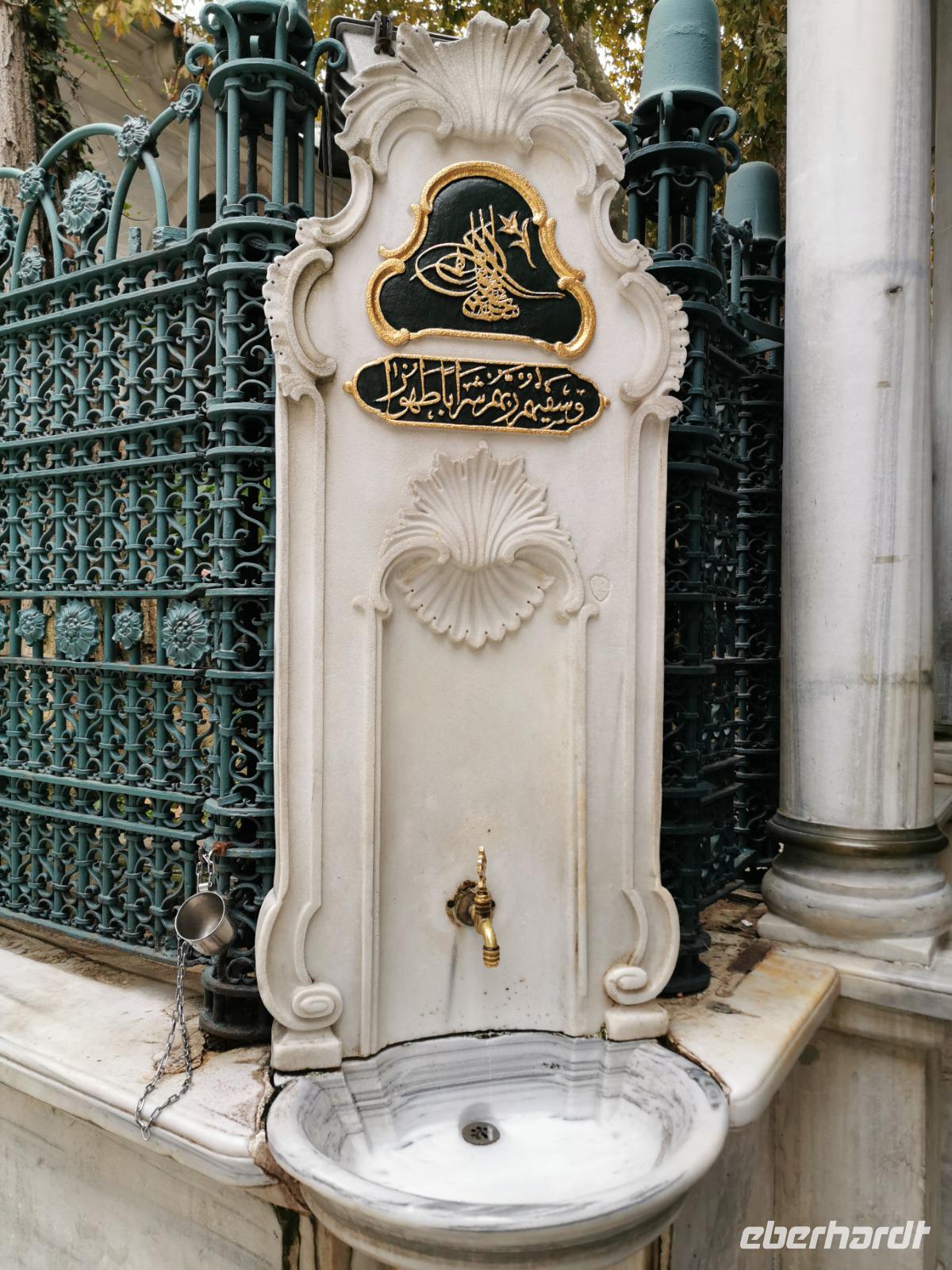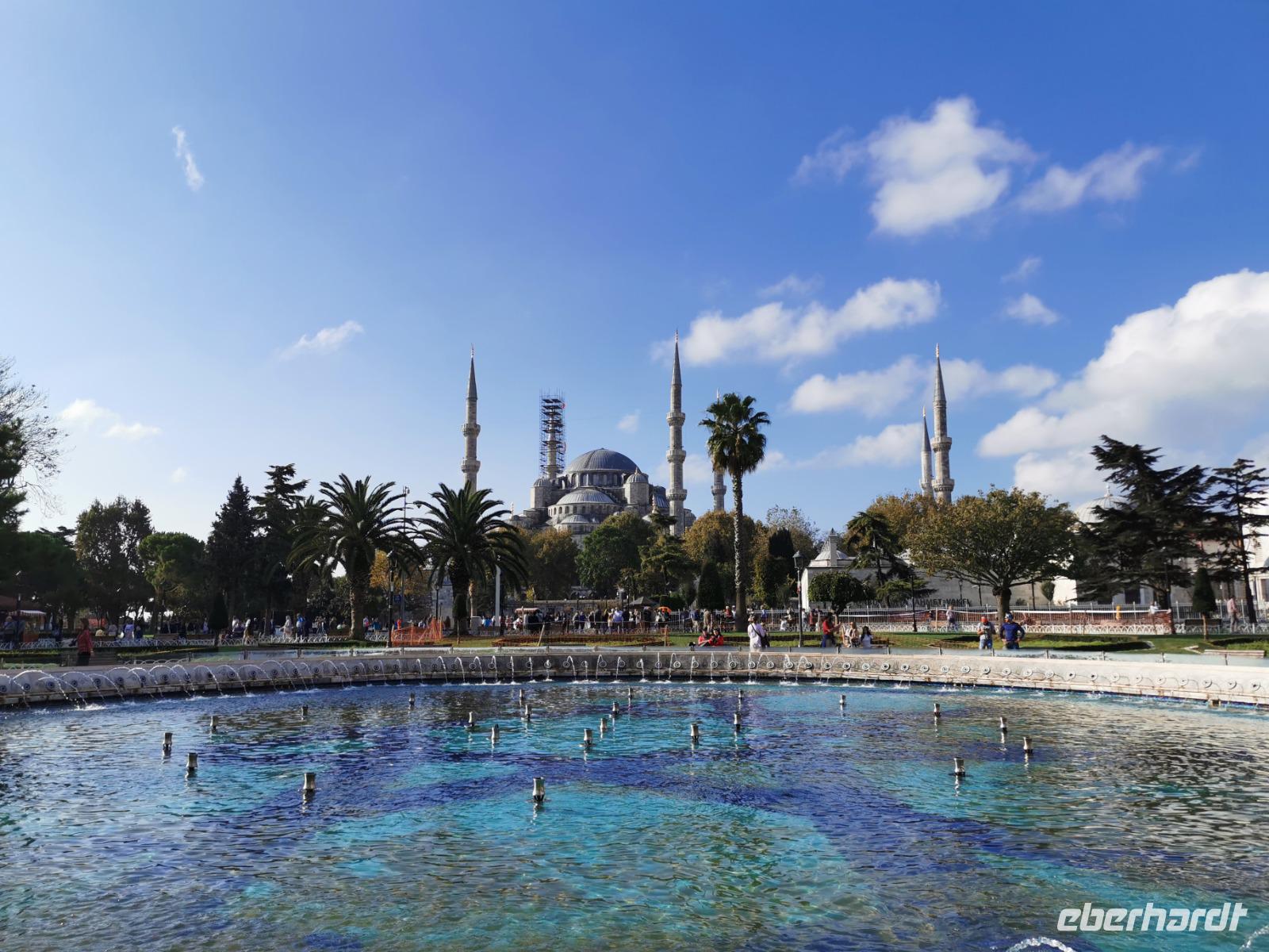 Zu Fuß machten wir uns nach dem Frühstück auf den Weg zum ersten Highlight des Tages: der Sultan Ahmet Camii (Blaue Mosche), die nur etwa zehn Gehminuten vom Hotel entfernt liegt. Auf dem Weg legten wir eine kleine Pause am Alman Cesmesi (dem Deutschen Brunnen) ein, der am nördlichen Ende des Hippodroms liegt und ein Geschenk für Sultan Abdülhamid II. war. Im Jahre 1900 wurde er im Gedenken an den Besuch des deutschen Kaisers Wilhelm II. in Istanbul errichtet. In Einzelteilen hatte man das kleine Schmuckstück hierher verschickt, um es vor Ort zusammenzusetzen. Die achteckige Kuppel wird von acht Marmorsäulen getragen und ist innen mit wunderschönen goldenen Mosaiken ausgeschmückt worden.