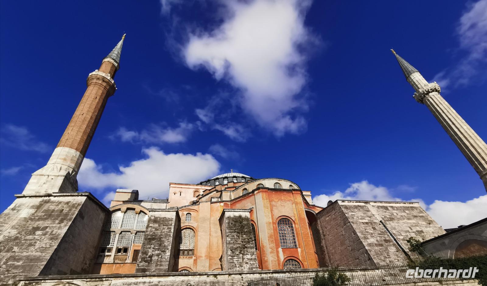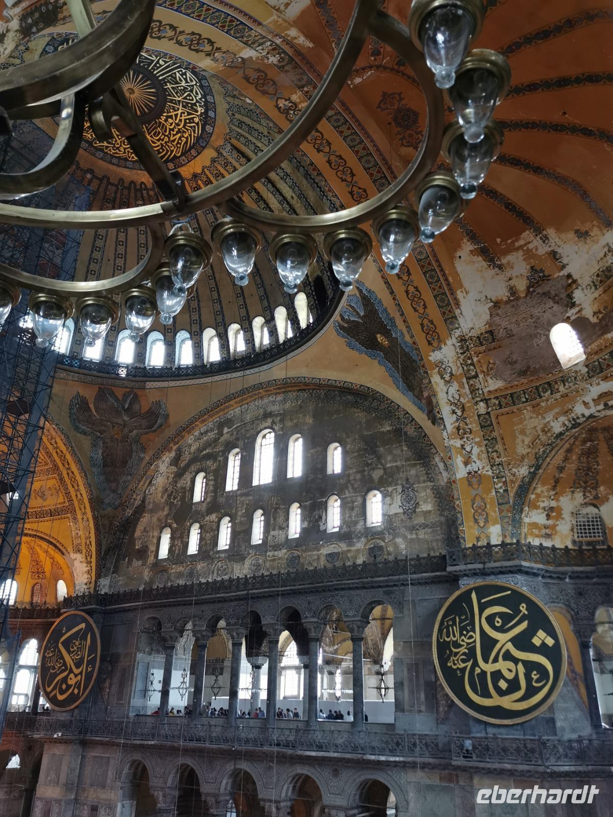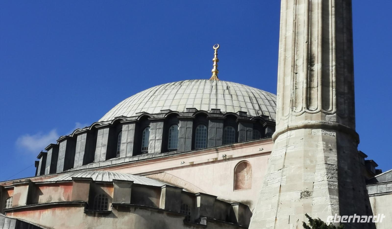Errichtet wurde sie im Auftrag des Kaisers Justinian in den Jahren 532 bis 537, nachdem zwei Vorgängerbauten an derselben Stelle durch Brände zerstört worden waren. Die frei schwebende 56 Meter hohe Kuppel von 31 Metern Durchmesser, die auf nur 4 Pfeilern ruht, ist einfach unglaublich.