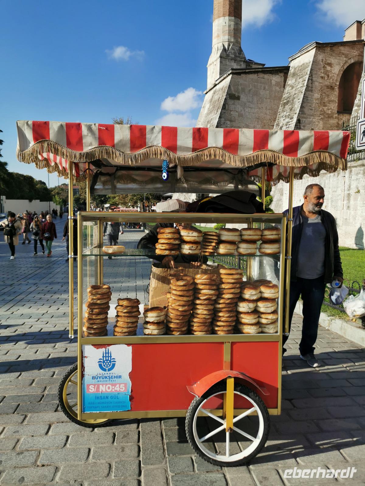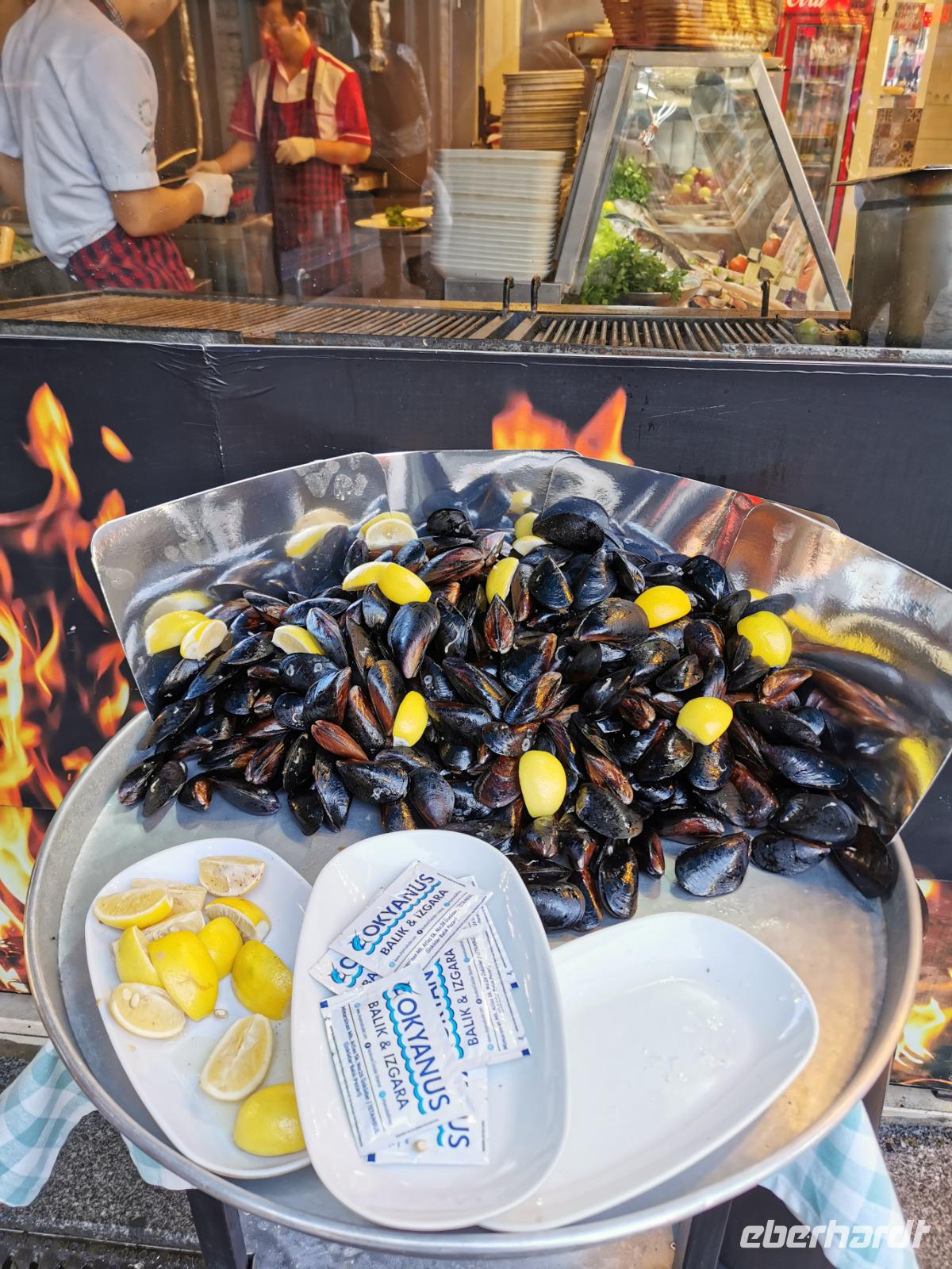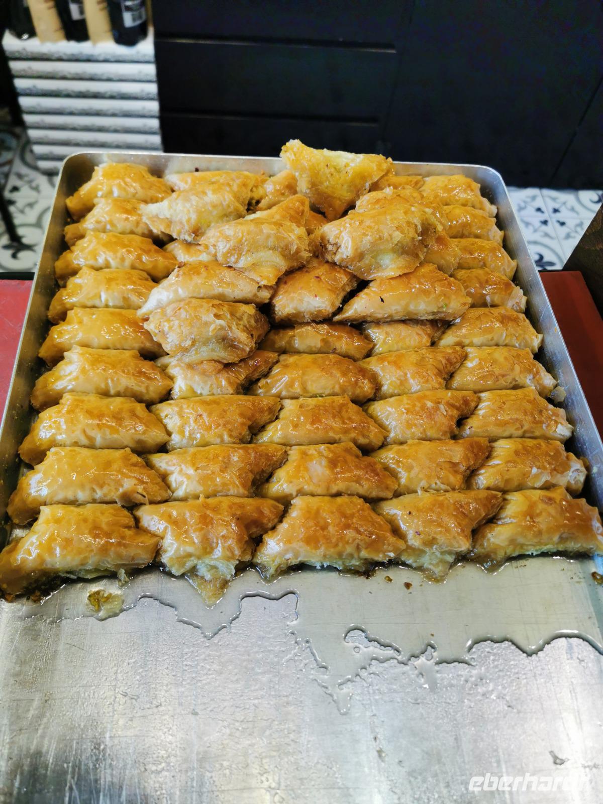 Förmlich erschlagen von der Farbenpracht und dem üppigen Angebot spazierten wir noch ein kleines Stück weiter zum Ufer, um auf Serdars Boot eine Fahrt auf dem Bosporus, der Meeresenge die das Marmarameer mit dem Schwarzem Meer verbindet, zu genießen. Das Wetter bescherte uns prallen Sonnenschein und azurblauen Himmel, Serdar spendierte türkische Gebäckspezialitäten und wir fühlten uns wie im Paradies, als wir auf dem in der Sonne glitzernden Bosporus an der malerischen Stadtkulisse vorbeigleiten durften.