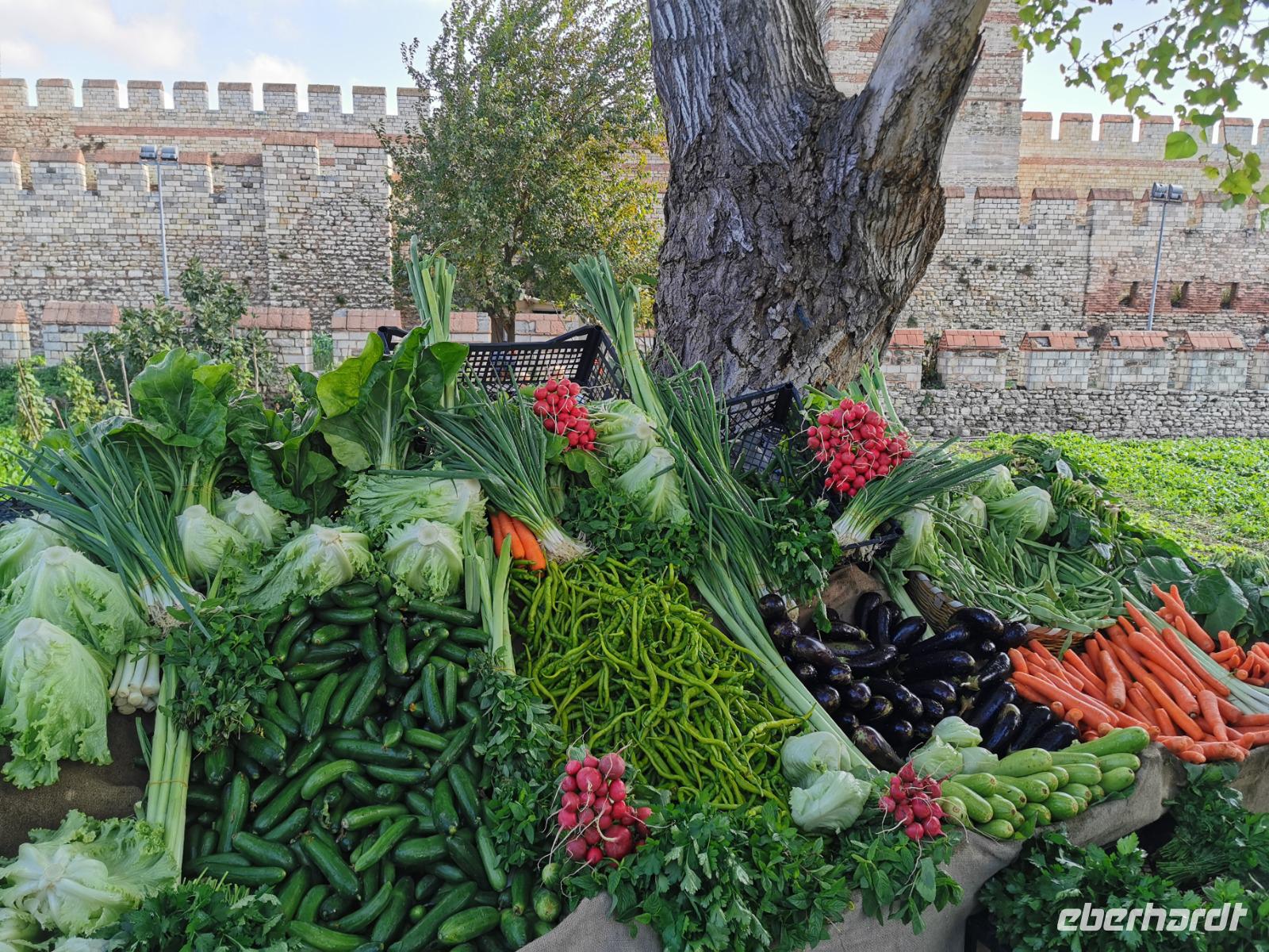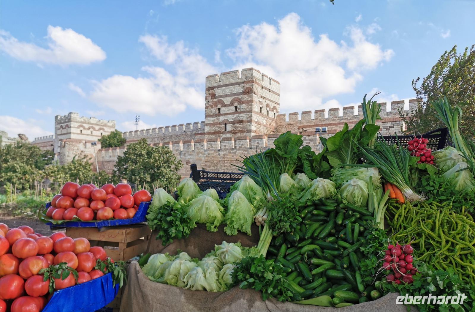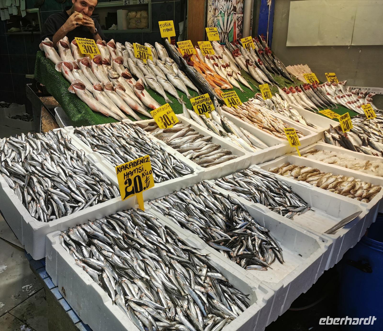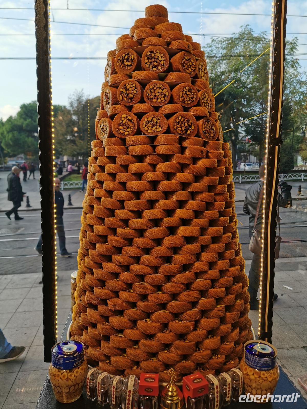 Förmlich erschlagen von der Farbenpracht und dem üppigen Angebot spazierten wir noch ein kleines Stück weiter zum Ufer, um auf Serdars Boot eine Fahrt auf dem Bosporus, der Meeresenge die das Marmarameer mit dem Schwarzem Meer verbindet, zu genießen. Das Wetter bescherte uns prallen Sonnenschein und azurblauen Himmel, Serdar spendierte türkische Gebäckspezialitäten und wir fühlten uns wie im Paradies, als wir auf dem in der Sonne glitzernden Bosporus an der malerischen Stadtkulisse vorbeigleiten durften.