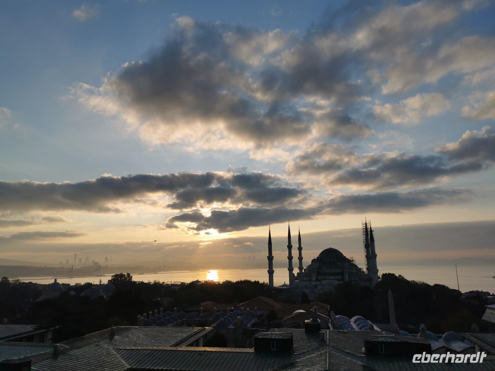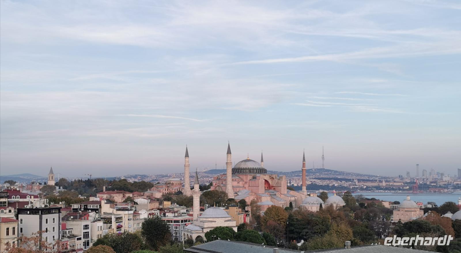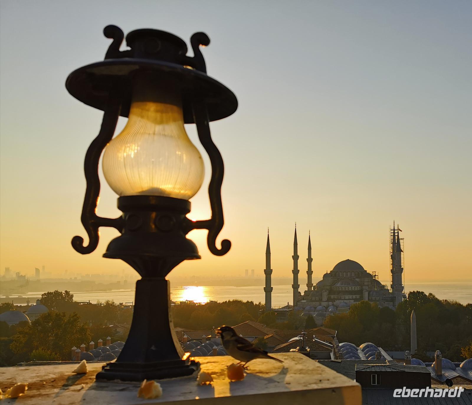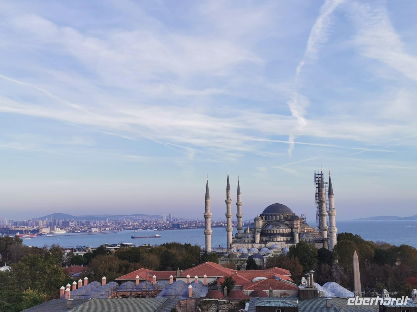 Beim Frühstück in unserem schönen Hotel in der Nähe der Aya Sofia (Hagia Sophia) stellten wir begeistert fest, was man für eine grandiose Aussicht auf die Silhouette der Stadt von der Dachterrasse aus hat. Von hier oben überblickte man die Kuppeln des Topkapi-Sarayi (des alten Sultanspalastes), die Minarette der Sultan Ahmet Camii (der Blauen Moschee), die gegenüber liegende Aya Sofia (Hagia Sophia), das Halic (das Goldene Horn), den Bosporus und die Adalar (die Prinzeninseln), die bereits im Marmarameer liegen. Atemberaubend! Diesen Ausblick werden wir nicht so schnell vergessen und währenddessen zu frühstücken ist ein Privileg, was sicher nicht viele Istanbulreisende erleben dürfen. Ein großes Dankeschön an Serdar für die Auswahl dieser Perle.