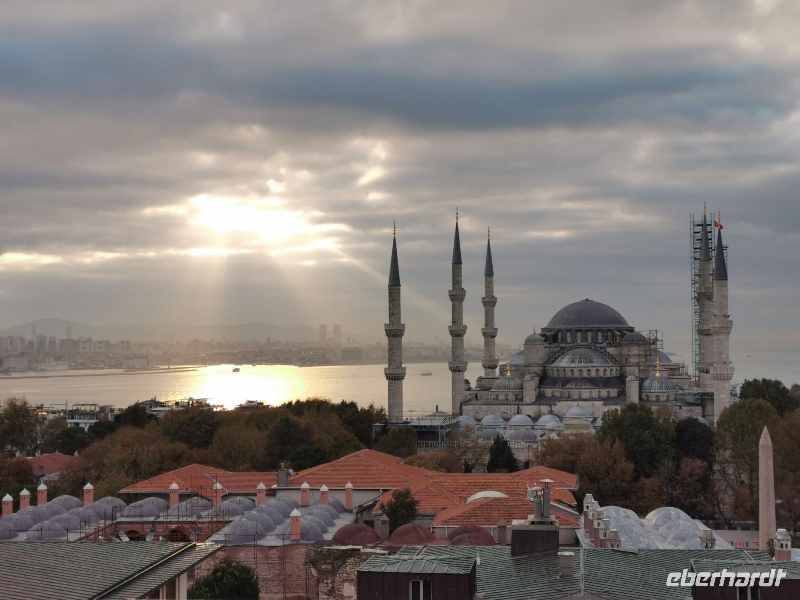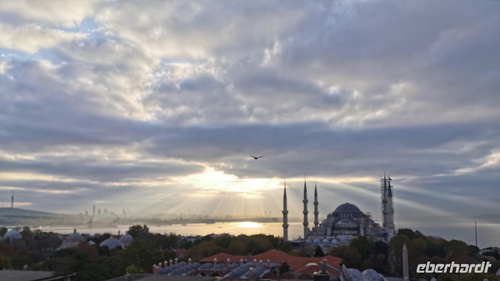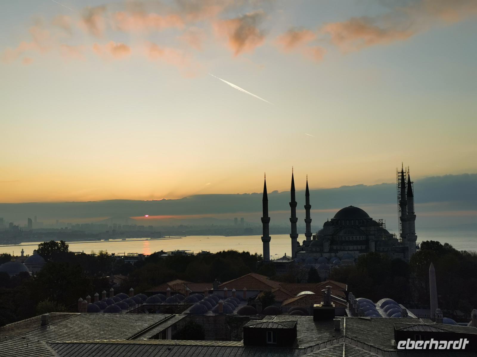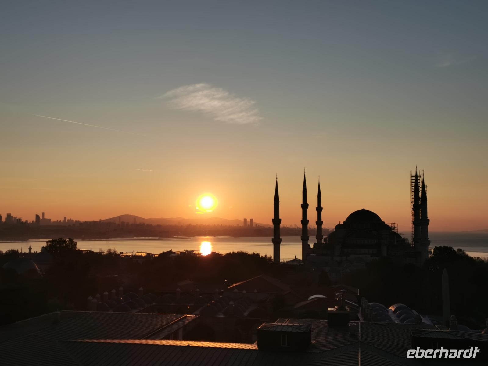 Beim Frühstück in unserem schönen Hotel in der Nähe der Aya Sofia (Hagia Sophia) stellten wir begeistert fest, was man für eine grandiose Aussicht auf die Silhouette der Stadt von der Dachterrasse aus hat. Von hier oben überblickte man die Kuppeln des Topkapi-Sarayi (des alten Sultanspalastes), die Minarette der Sultan Ahmet Camii (der Blauen Moschee), die gegenüber liegende Aya Sofia (Hagia Sophia), das Halic (das Goldene Horn), den Bosporus und die Adalar (die Prinzeninseln), die bereits im Marmarameer liegen. Atemberaubend! Diesen Ausblick werden wir nicht so schnell vergessen und währenddessen zu frühstücken ist ein Privileg, was sicher nicht viele Istanbulreisende erleben dürfen. Ein großes Dankeschön an Serdar für die Auswahl dieser Perle.