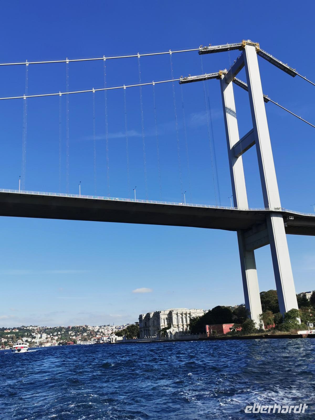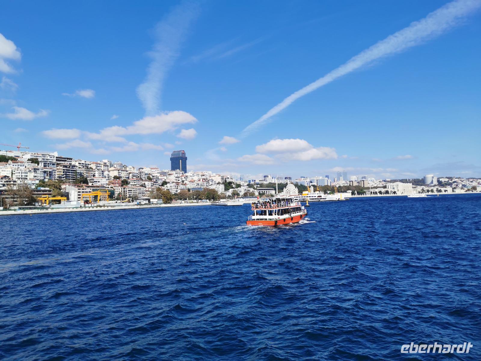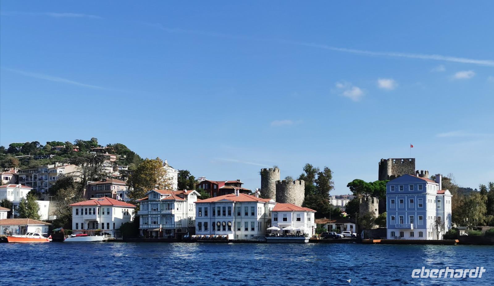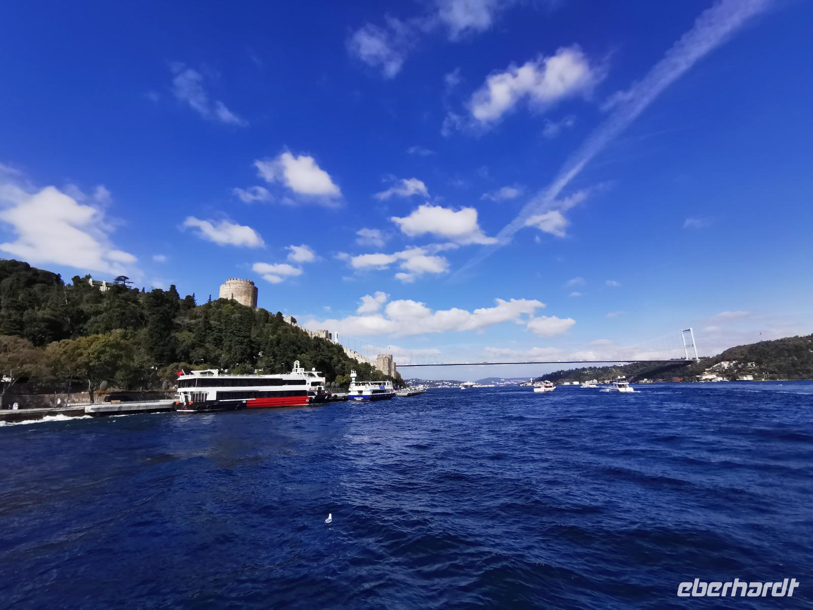 Vom Wasser aus sahen wir den Dolmabahce Sarayi (den neuen Sultanspalast), die Stadtviertel Besiktas, Ortaköy und Sariyer. Am Rumeli Hisari (einer osmanischen Festungsanlage) passierten wir die schmalste Stelle des Bosporus, der hier nur 700 Meter breit ist. Heute finden in der Burganlage im Sommer Open-Air-Konzerte statt. Unter der Fatih Sultan Mehmet Brücke (der zweiten Bosporusbrücke) wendeten wir und fuhren entlang der asiatischen Küstenseite zurück. Am asiatischen Ufer stehen zahlreiche alte aber liebevoll sanierte Holzvillen und solch eine exklusive Wohnlage können sich nur Millionäre leisten, meist liegt die familieneigene Yacht gleich vor der Villa.