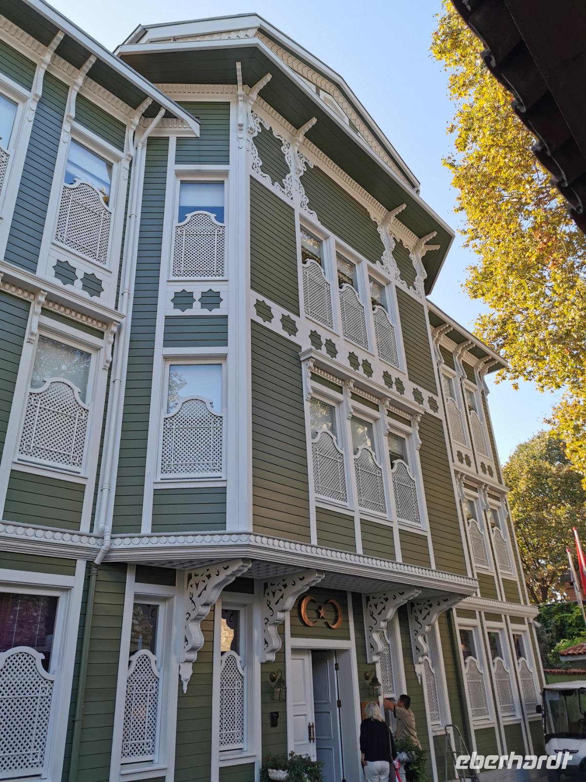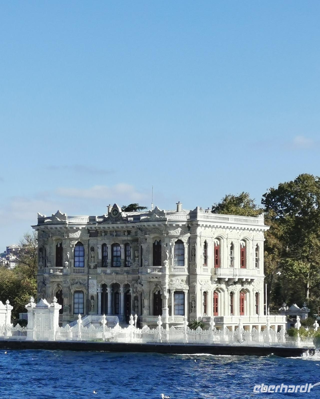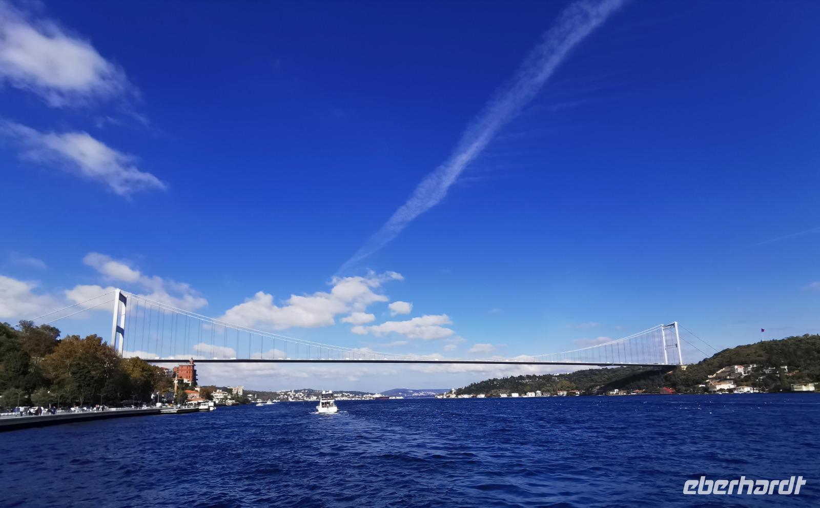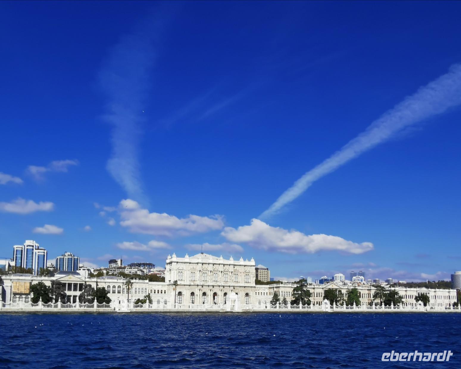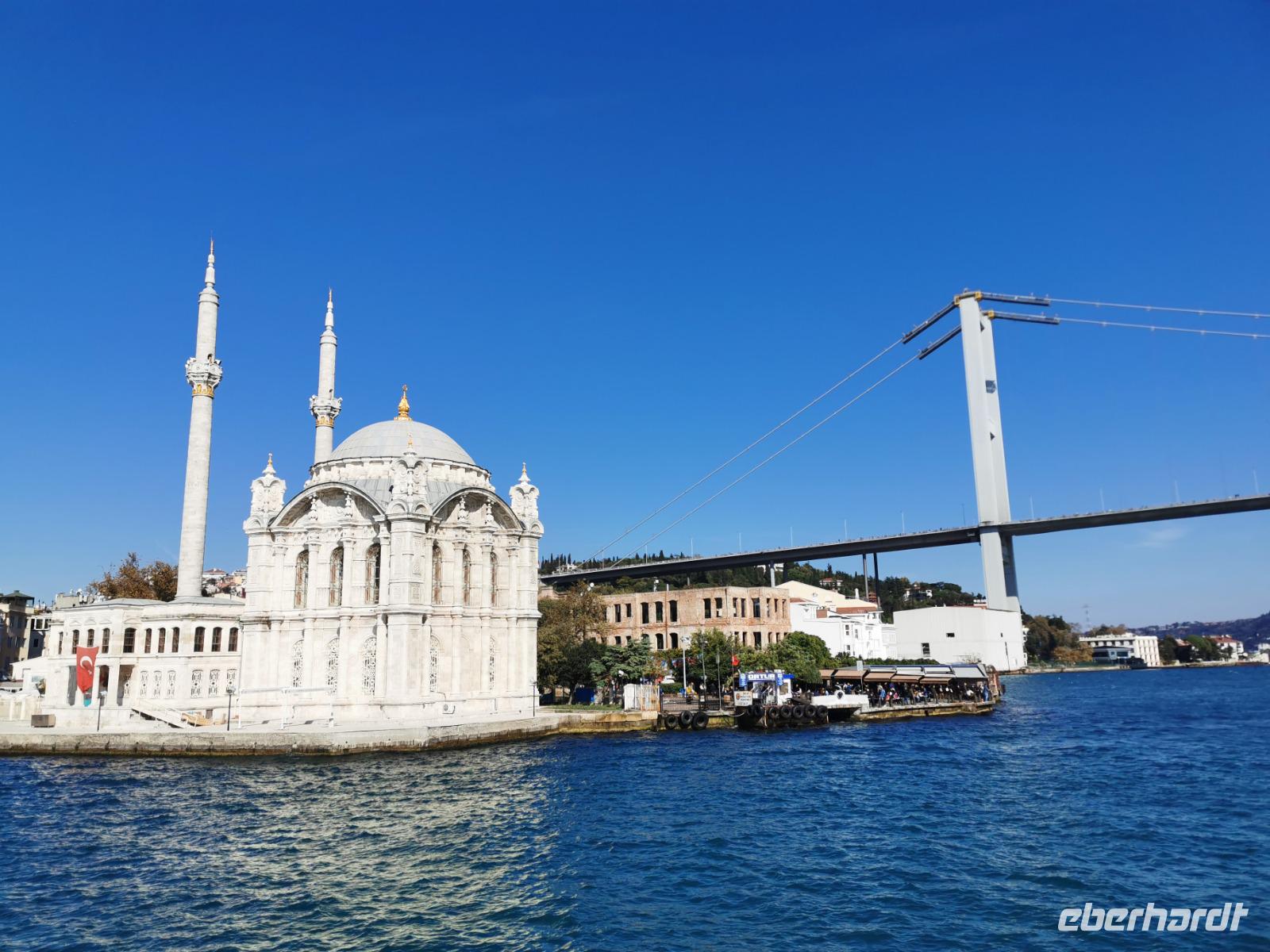 Vom Wasser aus sahen wir den Dolmabahce Sarayi (den neuen Sultanspalast), die Stadtviertel Besiktas, Ortaköy und Sariyer. Am Rumeli Hisari (einer osmanischen Festungsanlage) passierten wir die schmalste Stelle des Bosporus, der hier nur 700 Meter breit ist. Heute finden in der Burganlage im Sommer Open-Air-Konzerte statt. Unter der Fatih Sultan Mehmet Brücke (der zweiten Bosporusbrücke) wendeten wir und fuhren entlang der asiatischen Küstenseite zurück. Am asiatischen Ufer stehen zahlreiche alte aber liebevoll sanierte Holzvillen und solch eine exklusive Wohnlage können sich nur Millionäre leisten, meist liegt die familieneigene Yacht gleich vor der Villa.