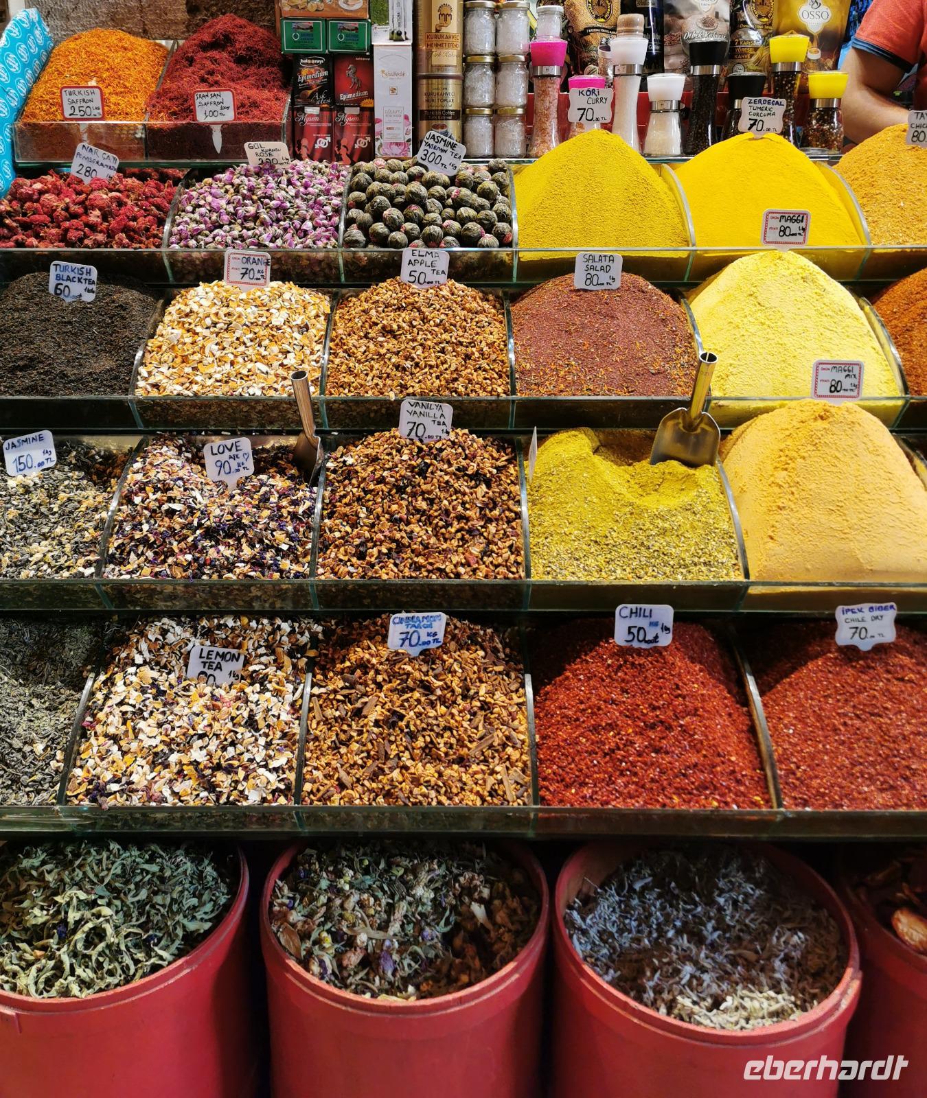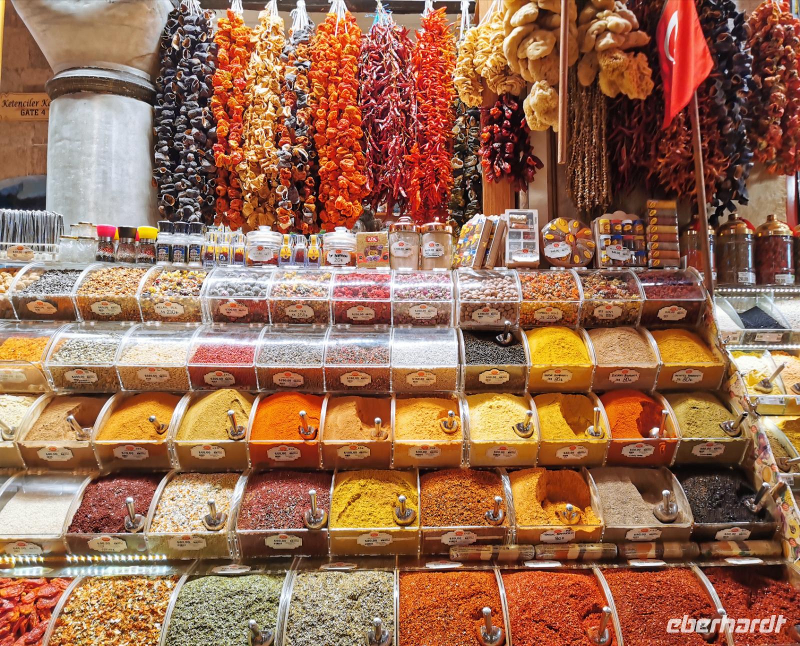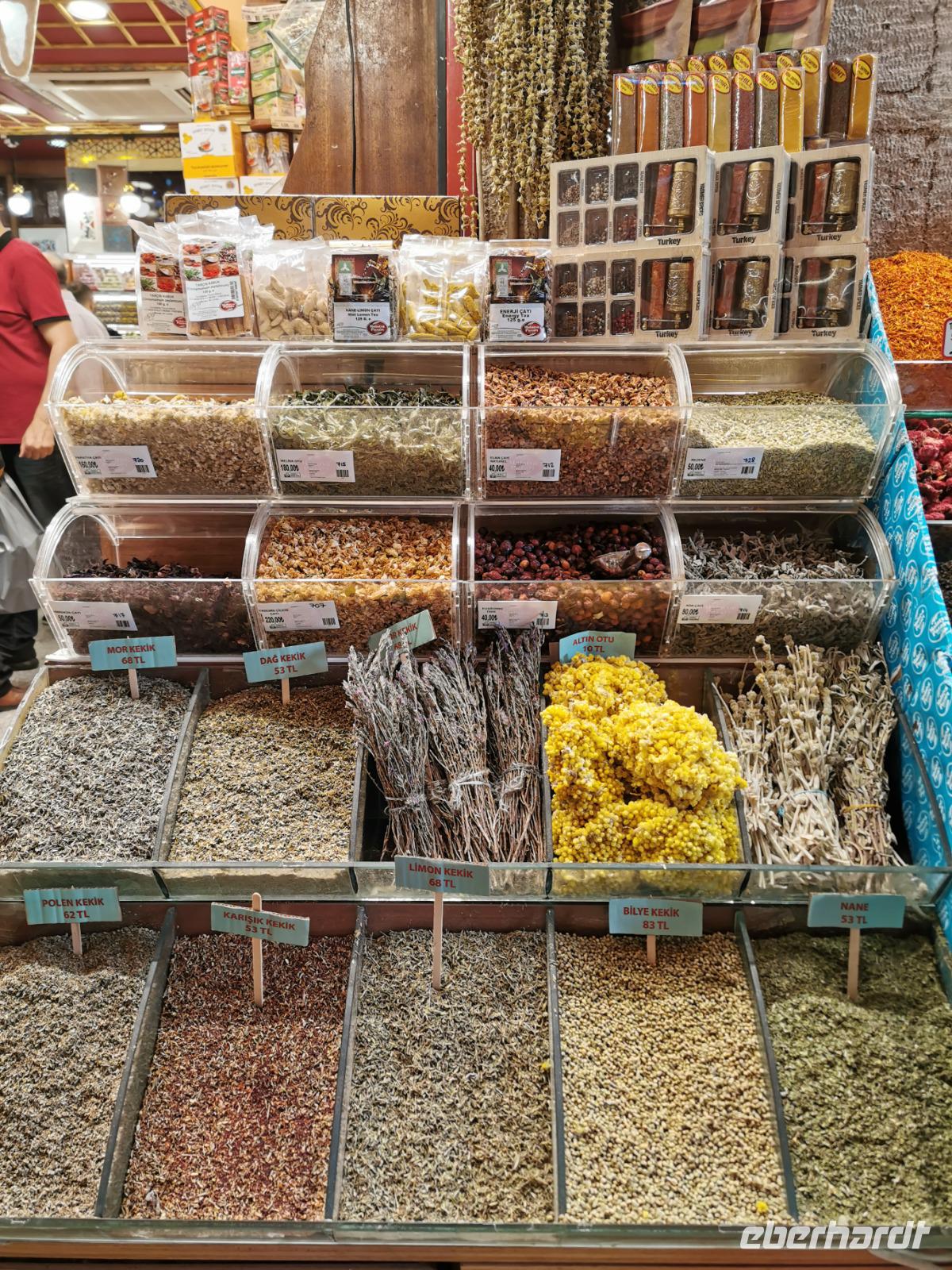 Wir wählten den zum Goldenen Horn hin gelegenen Ausgang und spazierten weiter an unzähligen Ständen mit Handtüchern und Bettwäsche vorbei zum kleineren Misir Carsi (dem ägyptischen Basar). Hier findet man alles an Gewürzen, Tee, Trockenfrüchten, Nüssen und altem Handwerk, was man sich nur vorstellen kann und man könnte hier Tage verbringen, um all die Schätze zu entdecken, die Gerüche wahrzunehmen und die überall dekorativ aufgetürmten Gewürze zu bestaunen.