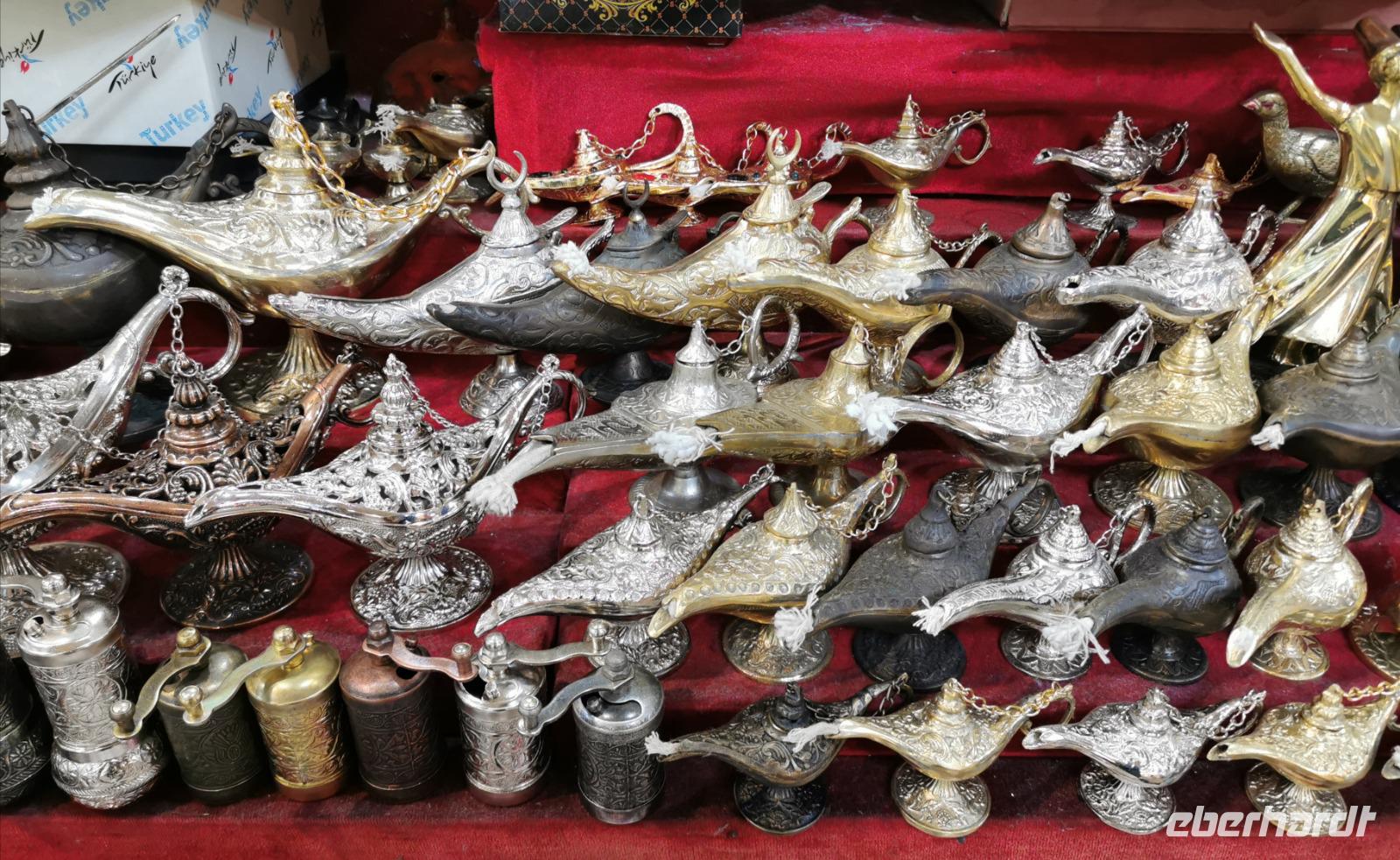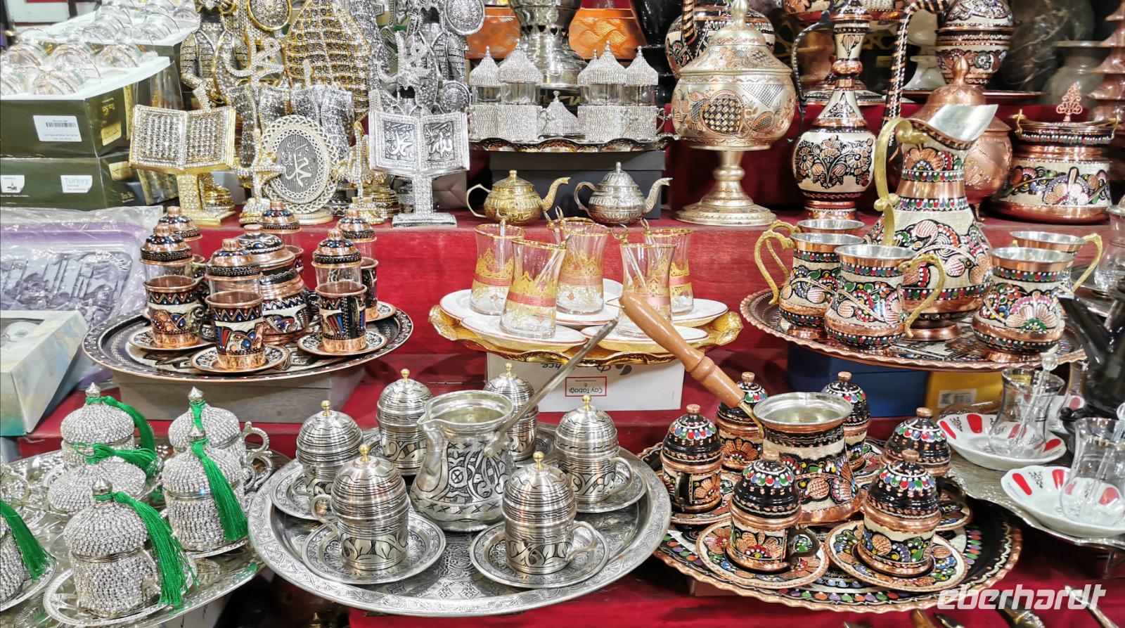 Die meisten Gäste waren vom farbenfrohen Angebot so geblendet, daß sie erstmal im traditionellen Café innerhalb des Basars einen türkischen Mokka tranken und das Treiben vom Cafétisch aus betrachteten. Hier hat sich schon so mancher Europäer verirrt im Gassen- und Ladengewirr, da es vier verschiedene Ausgänge gibt, ist man hier immer wieder auf die Hilfe der Händler angewiesen, um wieder den richtigen Weg zu finden.