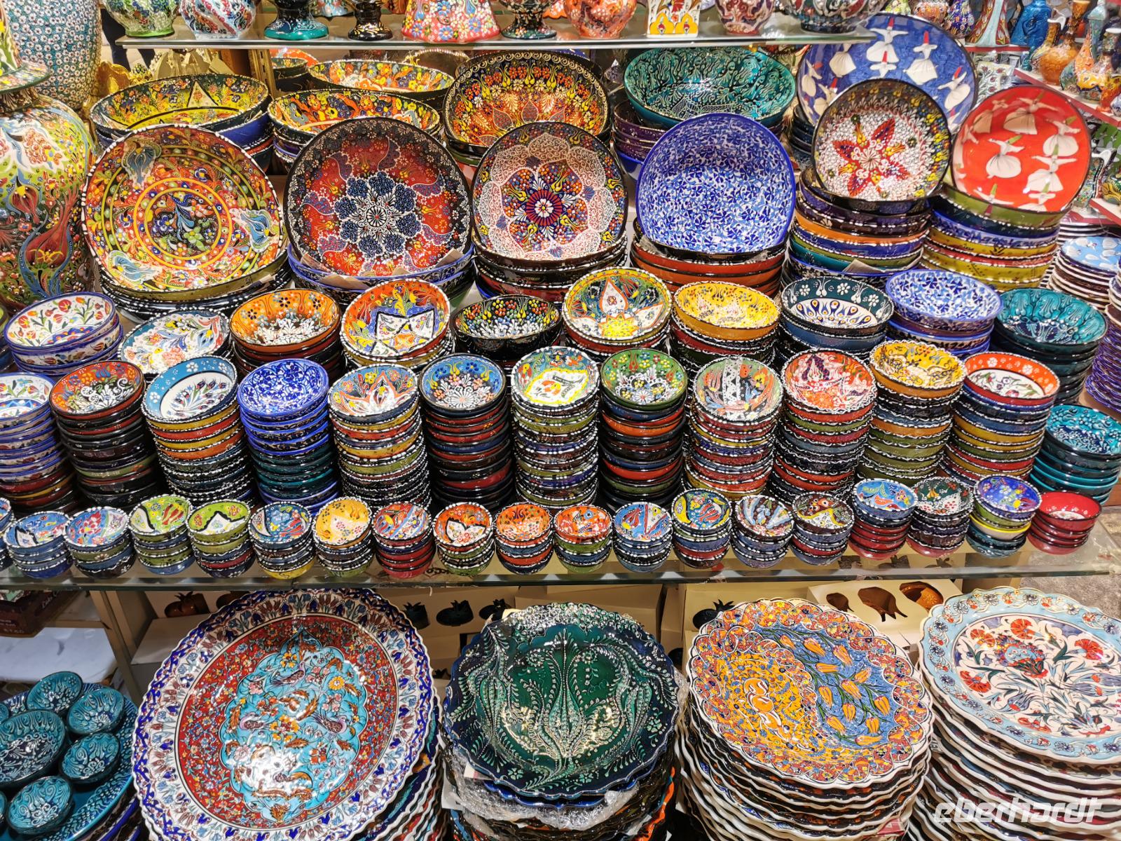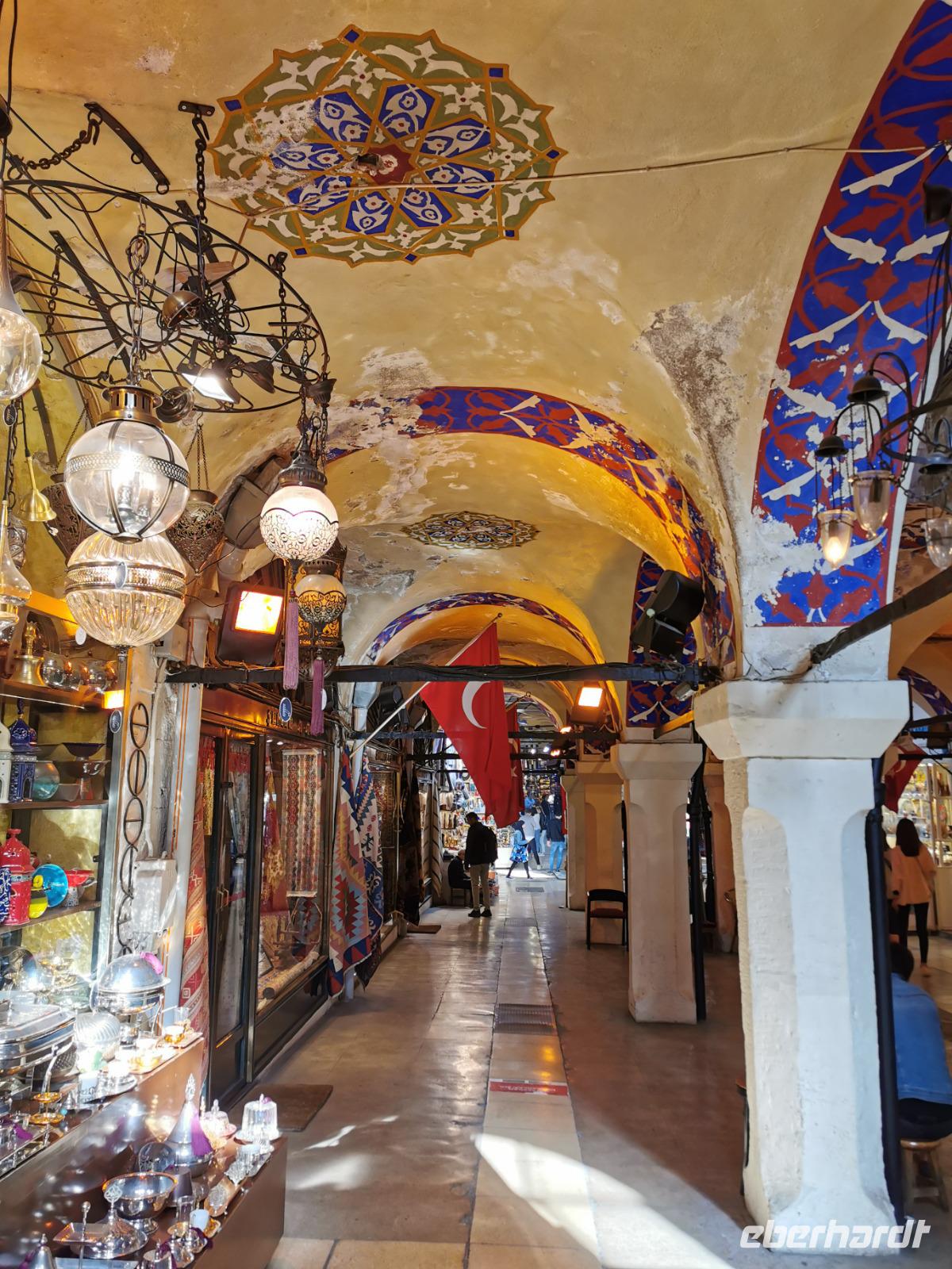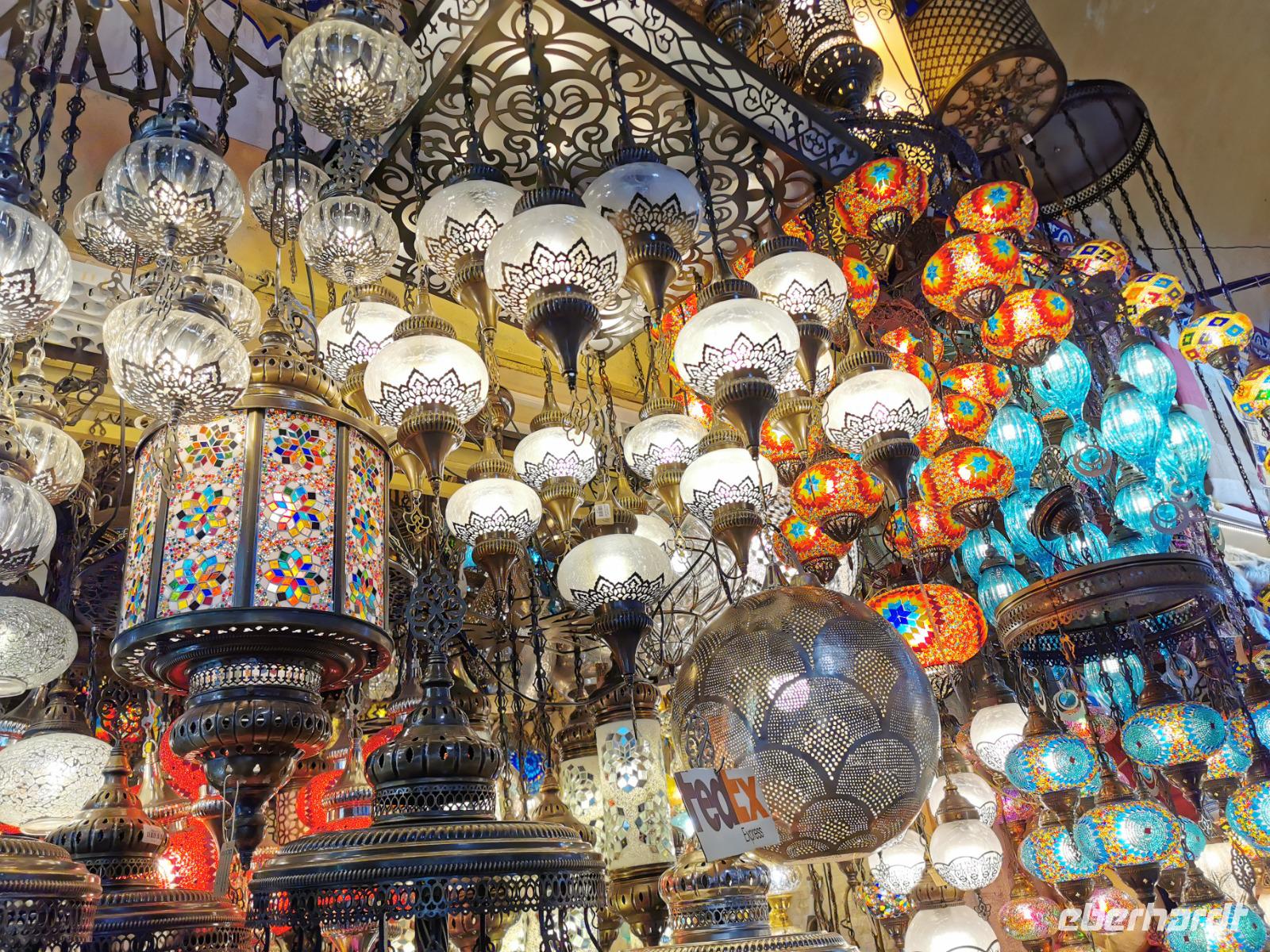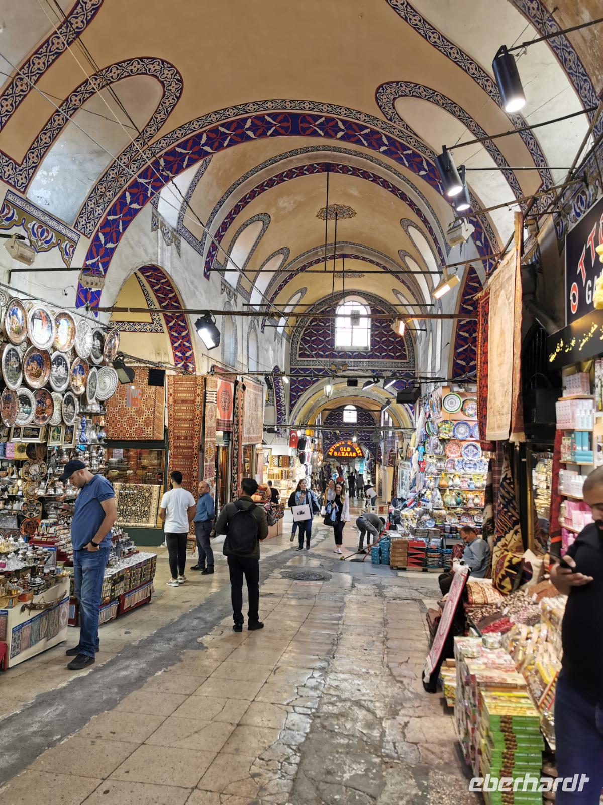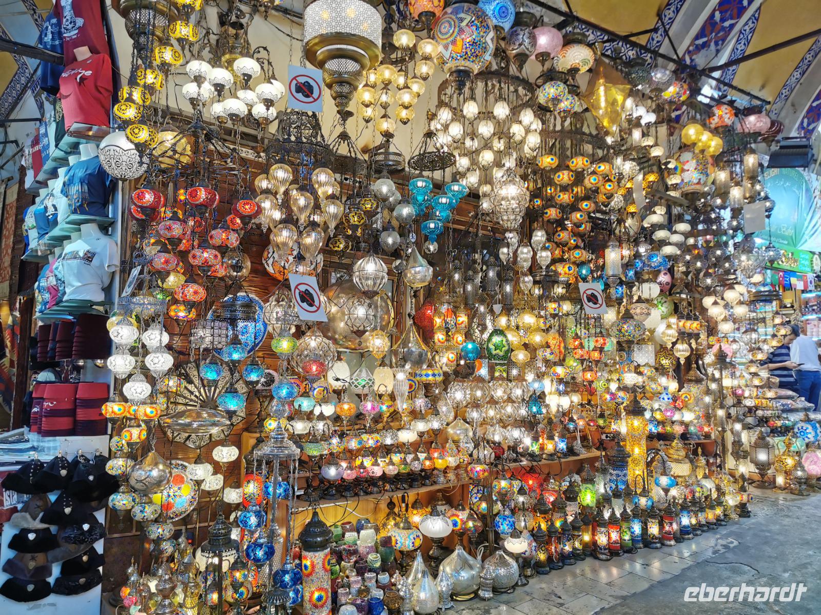 Am heutigen Morgen begannen wir mit der Besichtigung des orientalischen Highlight Istanbuls schlechthin, dem Kapali Carsi (dem Gedeckten Basar) im alten Istanbuler Stadtteil Eminönü. Dieser Basar umfaßt eine Fläche von 31.000 m² und beherbergt etwa 4.000 Geschäfte mit unterschiedlichsten Angeboten, angefangen vom Goldschmuck über Stoffe bis hin zu bunten Lampen, Keramik, Kalligraphien, alten Büchern und antiken Schätzen. Die Herzen der Damen schlagen hier hoch und die Kreditkarten der Herren glühen :-).