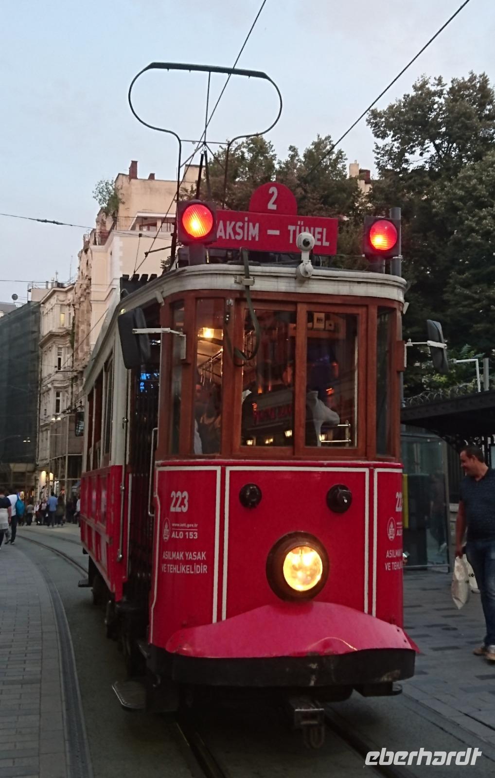 Mit dieser Fahrt war das offizielle Programm beendet. Aber es war gerade 15.30 Uhr und so schlug Simone einen Abstecher auf die Istiklal Caddesi (die Straße der Unabhängigkeit) vor. Diese Straße ist eine der bekanntesten Straßen in ganz Istanbul im Stadtteil Beyoglu gelegen. Sie führt vom Taksimplatz in etwa 1,5 km zum Tünelplatz und auf ihr fährt immer noch eine alte Straßenbahn aus den 1920er Jahren, die anfangs mit Pferden gezogen wurde. Seit 1990 ist diese Straße eine Fußgängerzone, tagsüber Einkaufsmeile, nachts ein Zentrum des Istanbuler Nachtlebens.