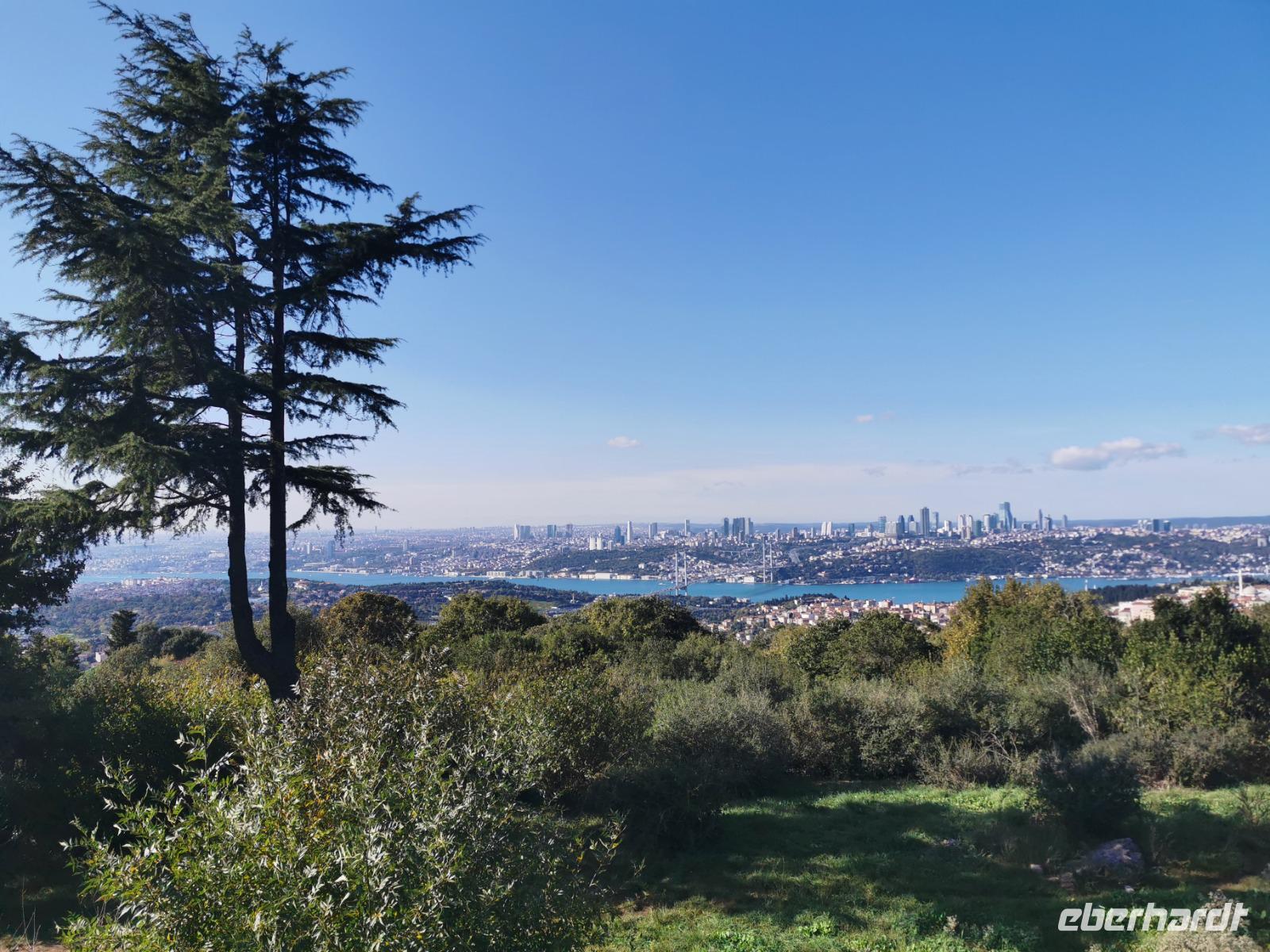 In Üsküdar auf der asiatischen Seite angekommen, besuchten wir einen Fisch- und Gemüsemarkt und so langsam bekamen wir Appetit, es war Mittag geworden. Also fuhren wir hoch zum Camlica tepesi (dem Tannenhügel). Von diesem höchsten Punkt in Istanbul hat man einen fantastischen Ausblick auf den Bosporus und nach etlichen geschossenen Erinnerungsfotos spendierte Serdar uns Cay (türkischen schwarzen Tee) und Simit (Sesamkringel) und wir genossen es sehr, bei solch einer Aussicht zwischen den vielen türkischen Familien eine Ruhepause einlegen zu können.