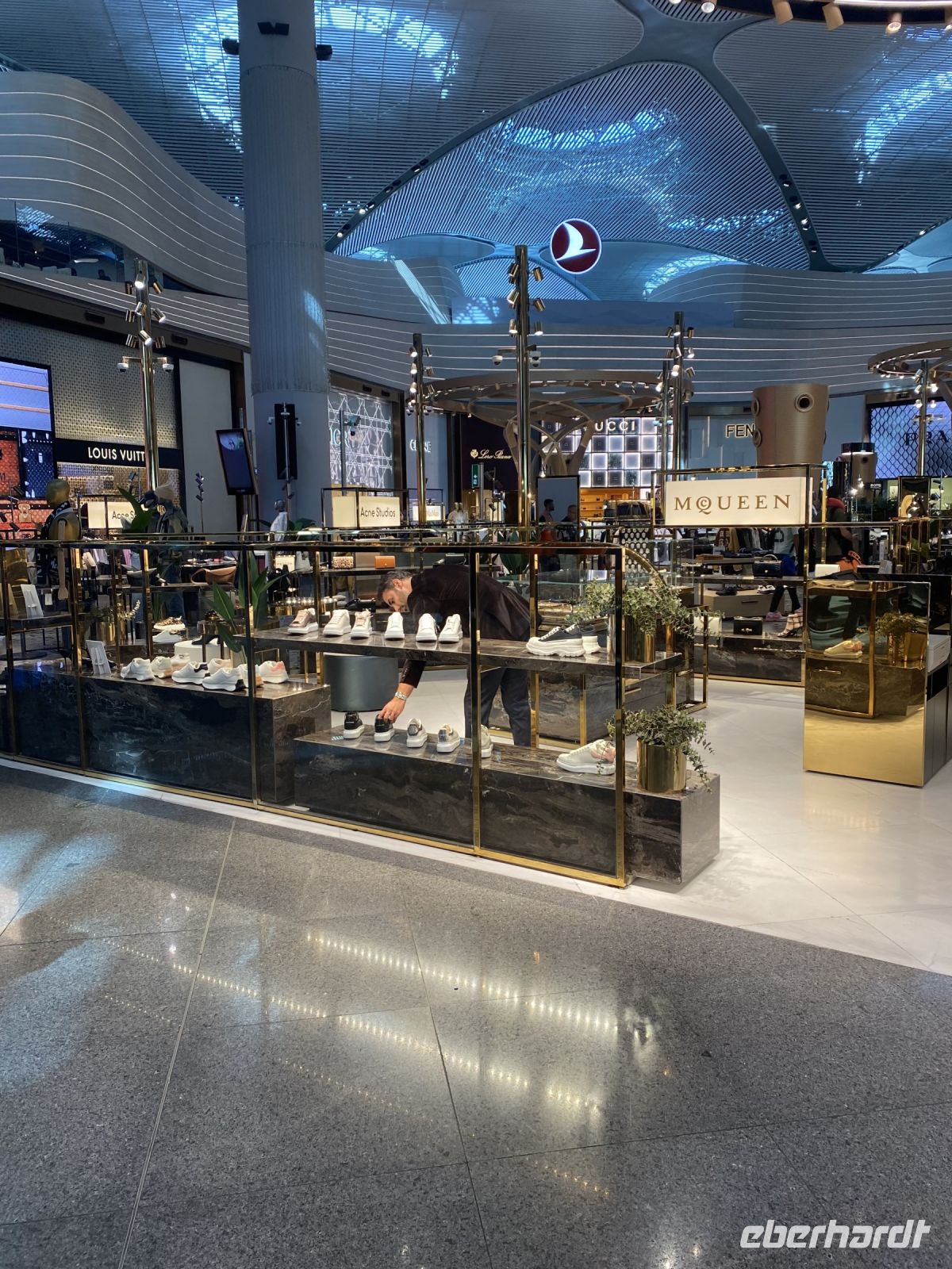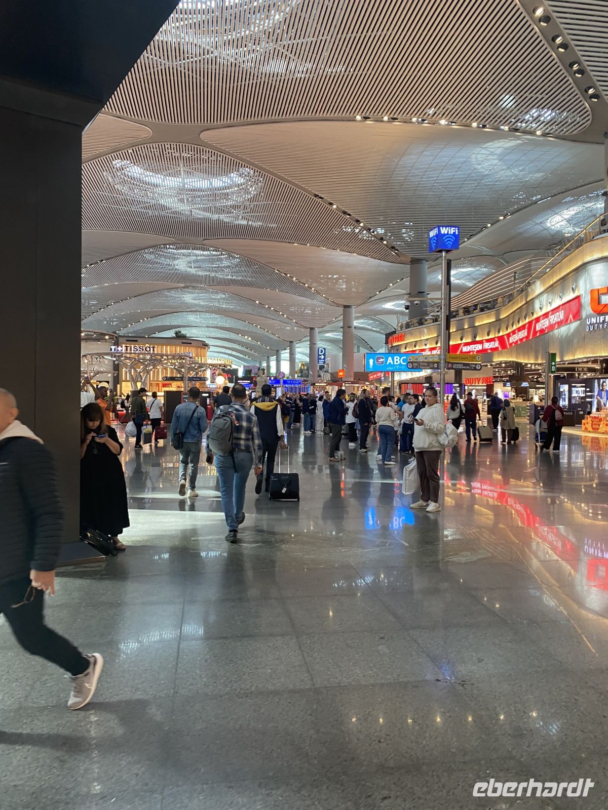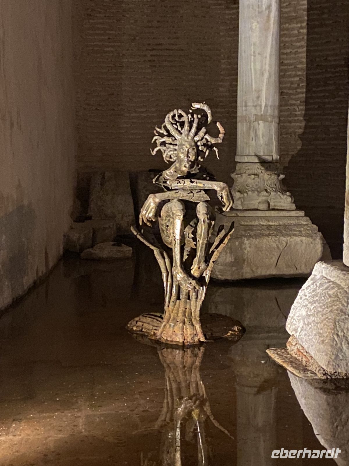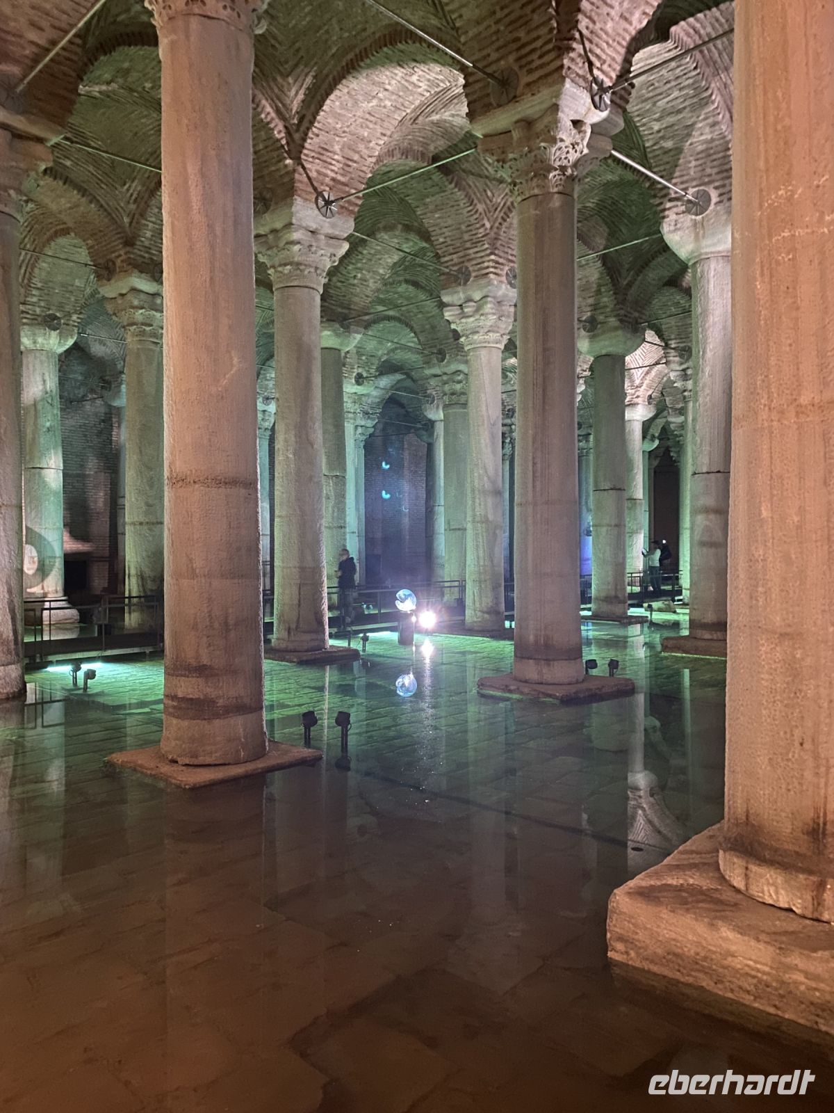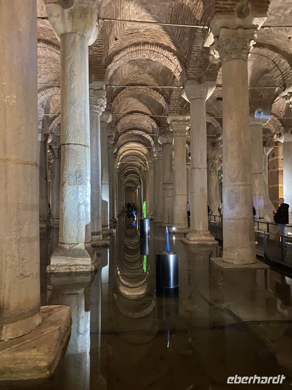 Um neun Uhr holt Ahmed acht Gäste, die die Basilika Zisterne besuchen möchten in der Lobby des Hotels ab. Wir fahren zwei Stationen mit der Straßenbahn und freuen uns, dass wir ohne Schlange zu stehen Einlass erhalten. In diese Zisterne, mit einem Fassungsvermögen von 80.000 Kubikmetern, wurde ab dem sechsten Jahrhundert Wasser aus den nahegelegenen Wäldern über Aquädukte von über 19 Kilometer Länge geleitet, um den kaiserlichen Palast zu versorgen. Die Zisterne dient heute nicht nur als Touristenattraktion sondern auch als Kulisse für viele Filmszenen. Mit einer Größe von 135 Meter Länge und 65 Metern Breite, wird die Decke von 336 bis zu acht Meter hohen Säulen getragen. Der Boden ist mit Wasser bedeckt, in dem sich die Säulen und zahlreiche Lichtskulpturen mystisch spiegeln. Wir freuen uns an dem Anblick und der Stimmung des Ortes. Um 11.30 Uhr holt uns der Transferbus zum Flughafen ab. Mit Hilfe eines Begleiters passieren wir eine Sicherheitskontrolle, geben unsere Koffer auf und gelangen zur Passkontrolle. Hier muss sich unser Begleiter verabschieden und wir entdecken die zahlreichen Restaurants, Geschäfte, Raucherterrassen und Duty free Shops, bevor wir zu unseren Gates gehen. Turkish Airlines serviert eine Mahlzeit und Getränke, es gibt ein breites Unterhaltungsangebot, schon vor dem Flug konnten wir Zeitungen und Zeitschriften herunterladen. So vergeht die Zeit bis zum Abflug doch sehr schnell und wir kommen gut wieder nach Hause und werden uns lange an diese eindrucksvolle Reise erinnern.