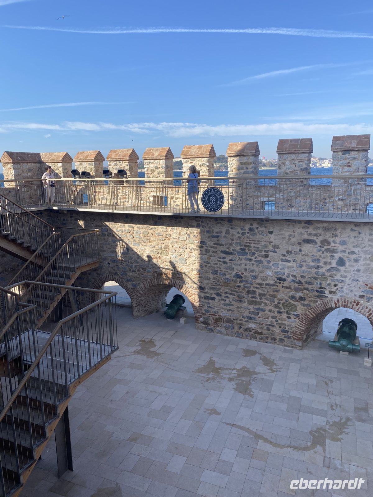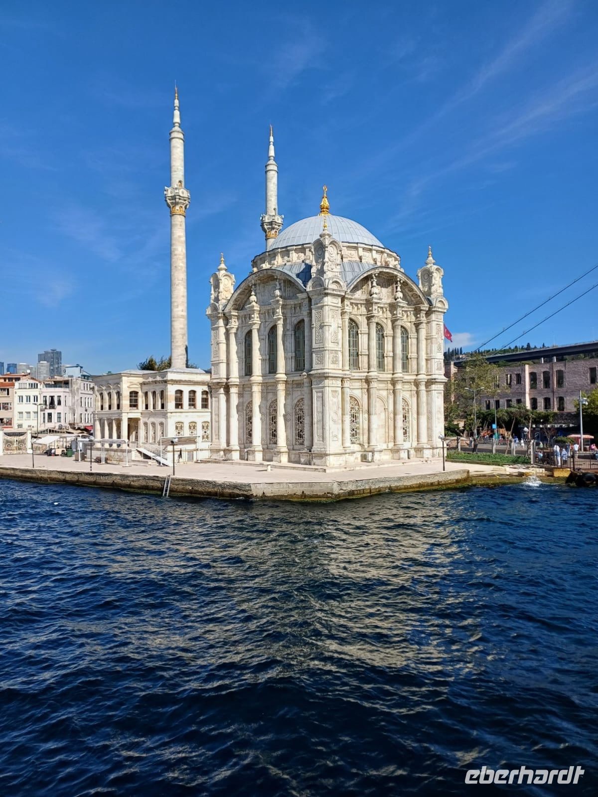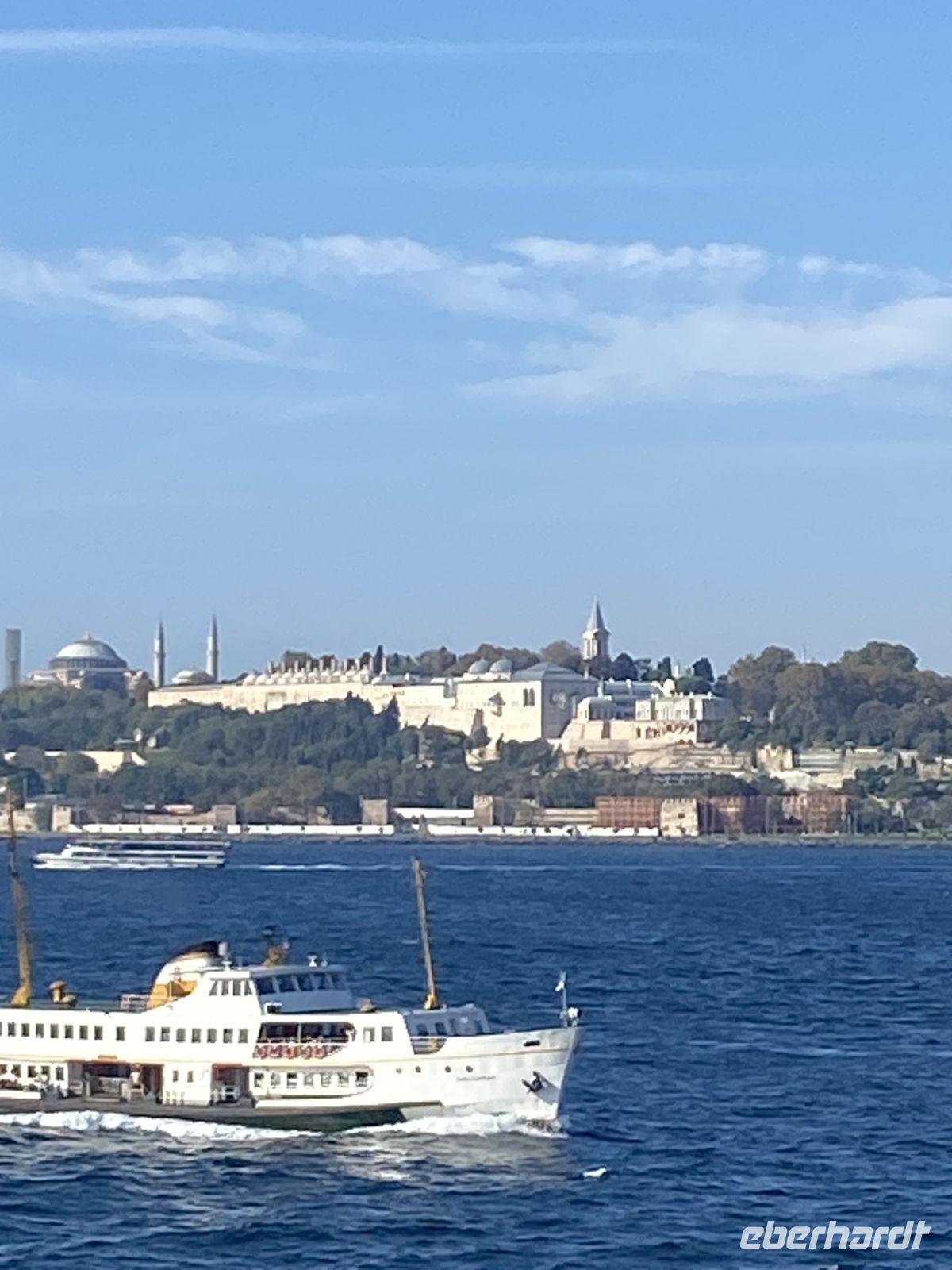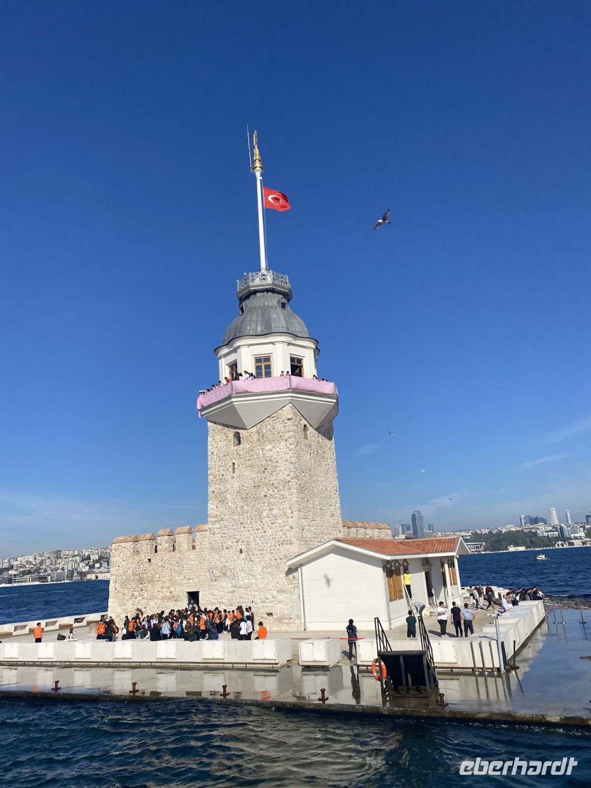 Nach einem ausgiebigen und guten Frühstück holt uns unser Stadtführer Ahmet bei strahlendem Sonnenschein im Hotel ab. Im Laufe der nächsten Tage erzählt uns Ahmet sehr lebhaft und authentisch über die verschiedensten Kulturen und Religionen und die 2600-jährige Geschichte der Stadt. Als Konstantinopel oder Byzanz schwankt Istanbul seit jeher zwischen den Extremen: zwischen griechischem und osmanischem Reich, zwischen Christentum und Islam, zwischen Asien und Europa. Wir fahren mit dem Bus an der gut erhaltenen, alten Stadtmauer entlang zur Galatabrücke, überqueren diese, steigen aus und laufen zu Fuß ein paar Meter die Brücke entlang. Wir genießen den Blick aufs Wasser, betrachten die Häuser, Paläste und Moscheen, die nah und fern zu sehen sind, werfen Blicke in die Gefäße der zahlreichen Angler und fotografieren eifrig. Inzwischen hat die Fähre, die uns zum Mädchenturm bringen wird angelegt und wir besteigen sie für die Überfahrt. Windstärke sieben, so wird es auf dem Wasser auch bei 26 Grad nicht zu warm und das Ziel ist schnell erreicht. Der Mädchenturm, auch als Leanderturm bekannt, ist eines der zahlreichen Wahrzeichen Istanbuls, ein sagenumworbener Leuchtturm auf einer kleinen Insel im Bosporus . Die türkische Bezeichnung ‚ Mädchenturm‘ (Kiz Kulesi ) geht auf die Legende zurück, dass einst einer Prinzessin der Tod durch Gift vorausgesagt wurde, woraufhin ihr Vater das Mädchen im Turm einschloss, wo sie dann durch den Biss einer Schlange getötet wurde. Der europäische Name ,Leanderturm` hingegen wird auf einen antiken Stoff zurückgeführt: Leander schwamm jede Nacht zu seiner Geliebten Hero, bis eines Nachts die Fackel, die ihm den Weg wies, erlosch und Leander ertrank. Neben den Legenden bietet uns der Turm auch einen herrlichen Blick auf die Stadt.