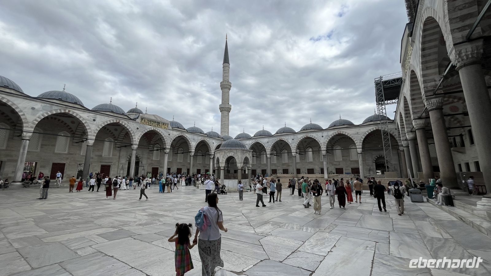 Zurück bei der Blauen Moschee ist die Schlange nun kürzer, sodass wir eintreten können. Die Sultan-Ahmed-Moschee aus dem frühen 17. Jahrhundert beeindruckt mit ihren sechs Minaretten und den mehr als 20.000 handbemalten blauen Iznik-Fliesen, die ihr den Namen gaben. Aysun nutzt die Gelegenheit, uns die fünf Säulen des Islams zu erklären – ein eindrucksvoller Einblick in die religiösen Grundlagen.
