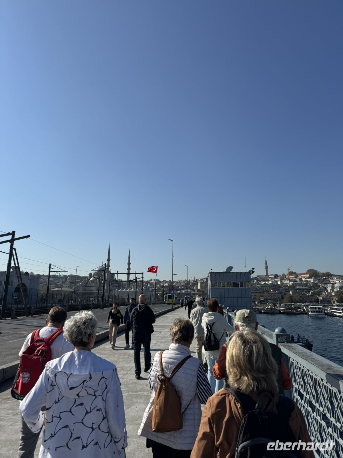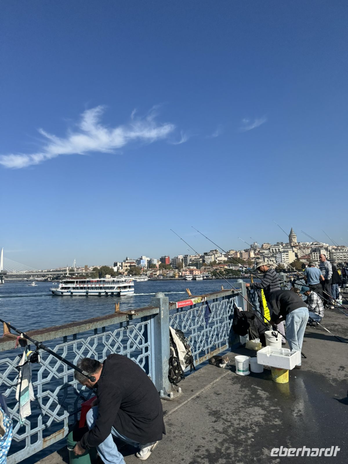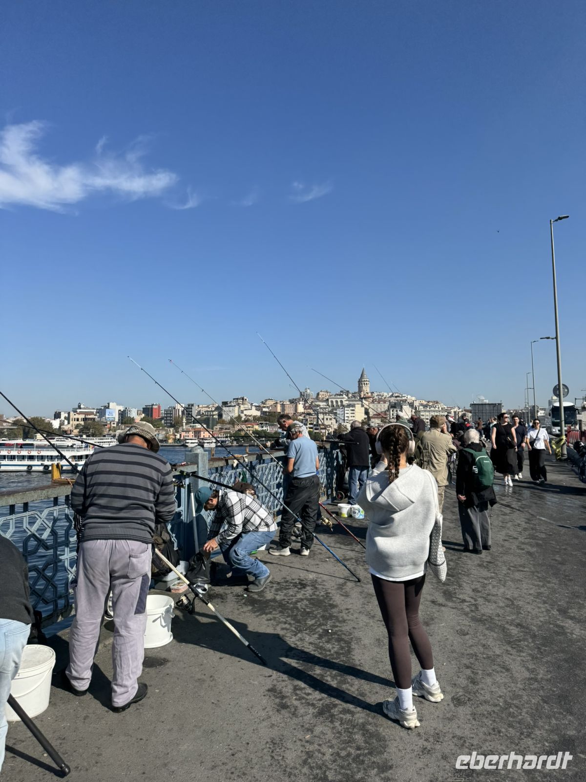Das Wetter zeigt sich von seiner besten Seite: sonnig, mit leichtem Wind und angenehmen 20 Grad. Mit dem Bus fahren wir entlang der alten Stadtmauer Konstantinopels und genießen die beeindruckenden Ausblicke. Unser nächster Halt ist die berühmte Galata-Brücke, über welche wir auf die andere Uferseite spazieren. Mit einem klaren Blick über den Bosporus schlenderten wir an den fleißigen Anglern, welche sich bereits ab dem frühen Morgen auf der Brücke versammeln.
