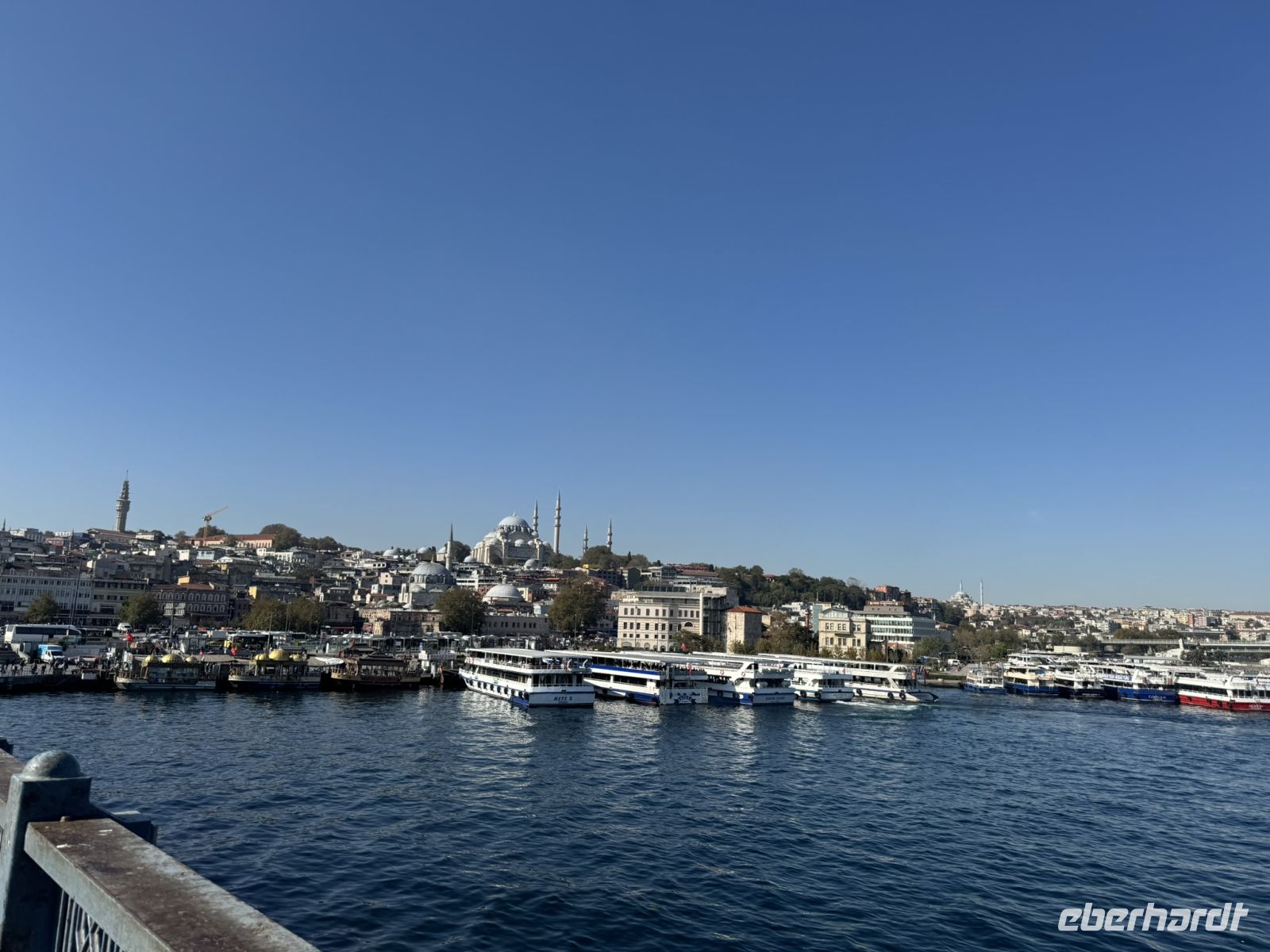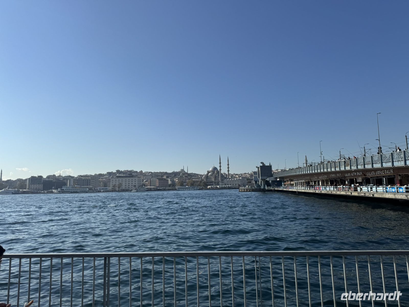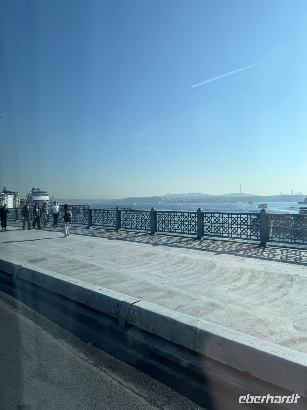 Das Wetter zeigt sich von seiner besten Seite: sonnig, mit leichtem Wind und angenehmen 20 Grad. Mit dem Bus fahren wir entlang der alten Stadtmauer Konstantinopels und genießen die beeindruckenden Ausblicke. Unser nächster Halt ist die berühmte Galata-Brücke, über welche wir auf die andere Uferseite spazieren. Mit einem klaren Blick über den Bosporus schlenderten wir an den fleißigen Anglern, welche sich bereits ab dem frühen Morgen auf der Brücke versammeln.