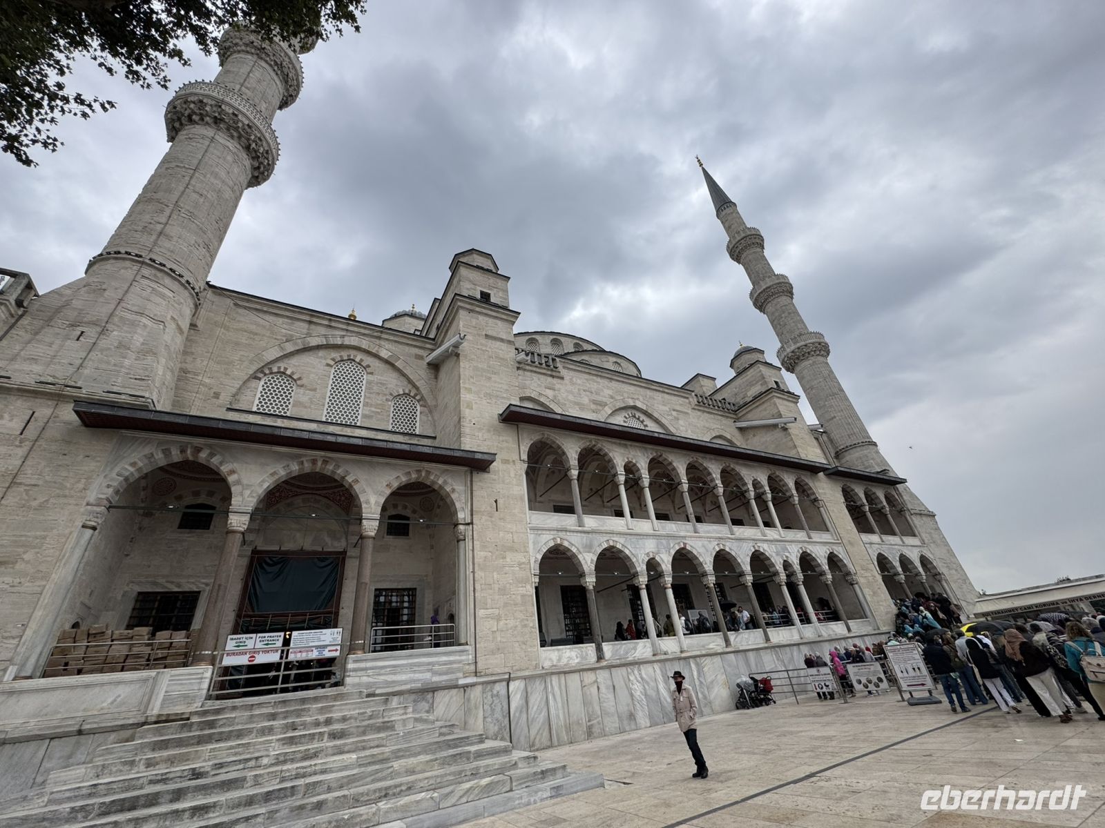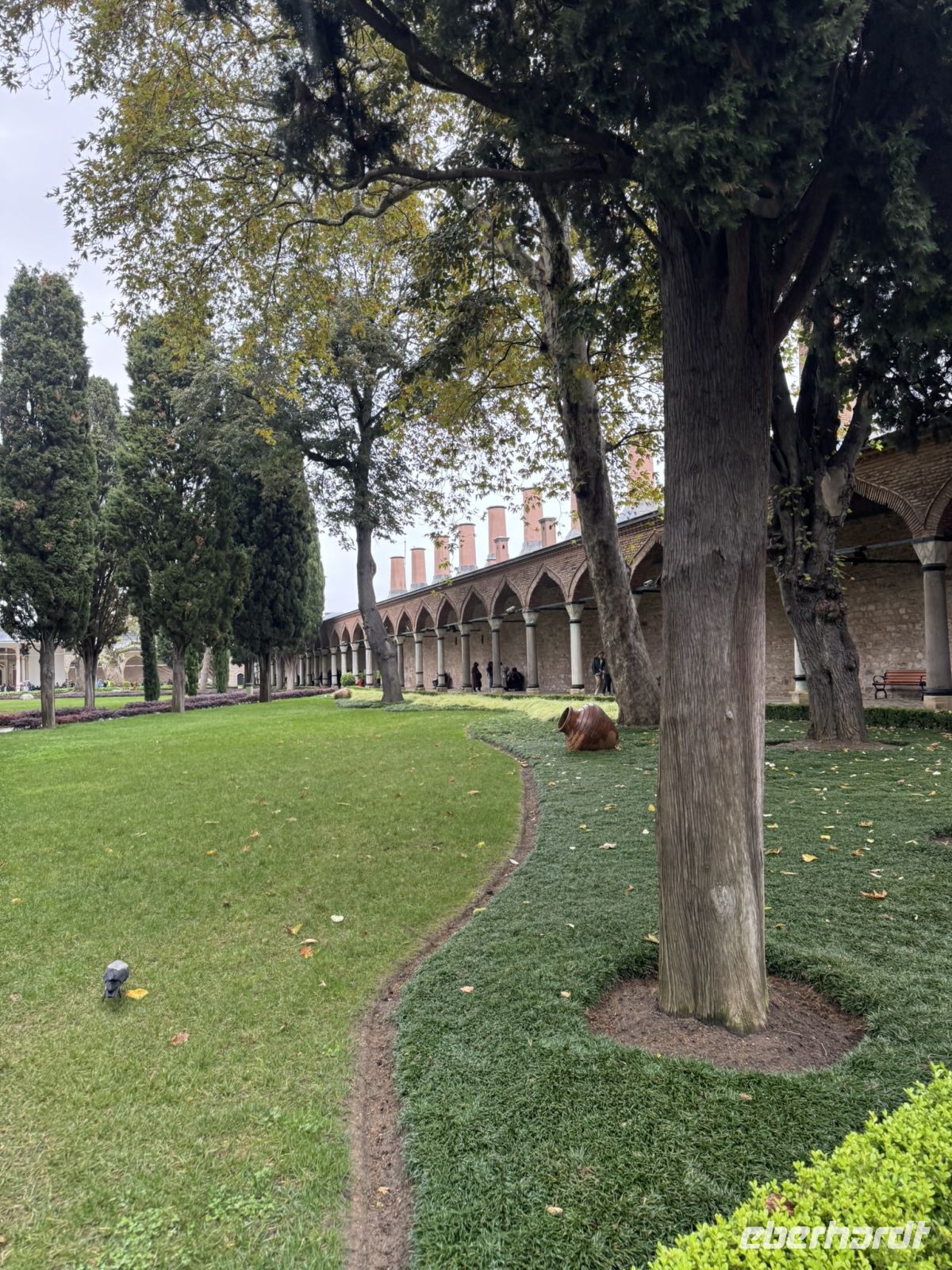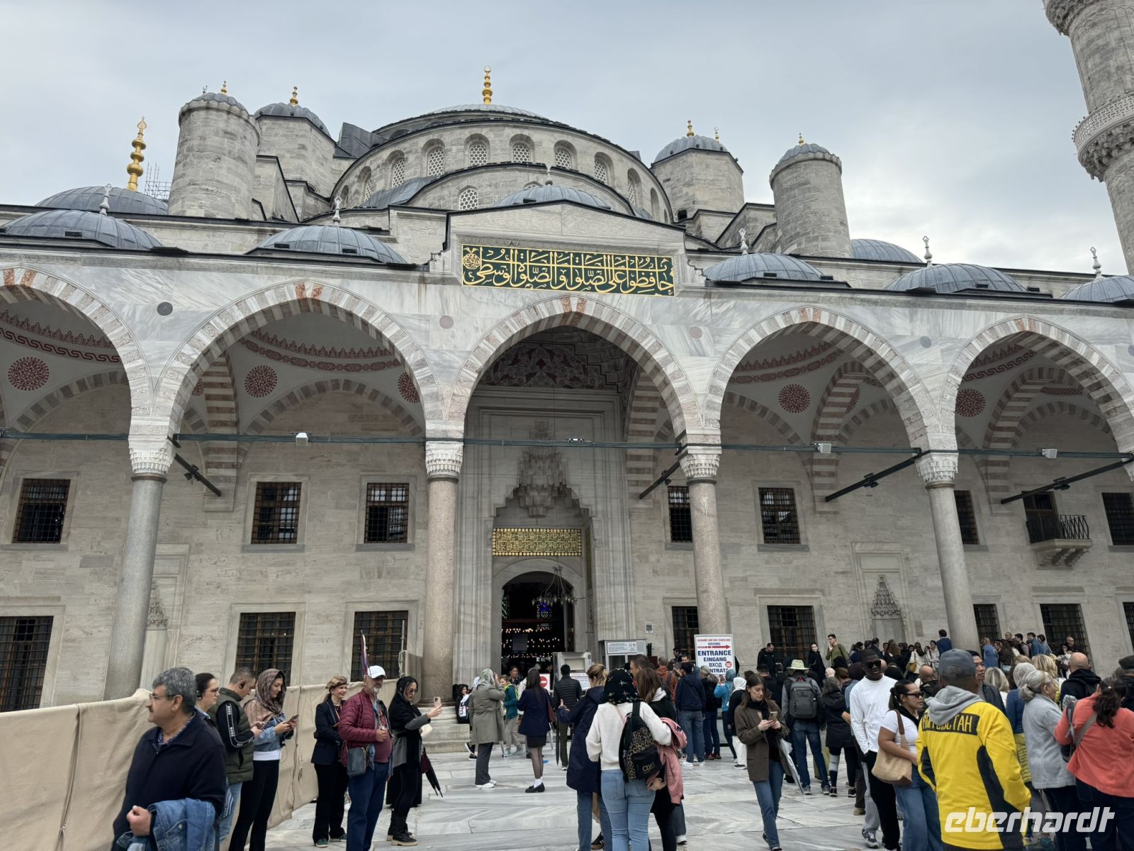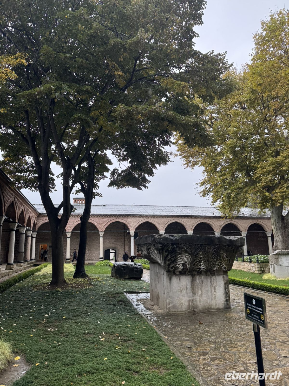 Unser nächstes Ziel ist der Topkapi-Palast, der einstige Sitz der osmanischen Sultane. Trotz des Wetters tauchen wir tief in die faszinierende Geschichte des osmanischen Reiches ein. Wir spazieren durch die weitläufigen Höfe, vorbei an prunkvollen Gebäuden, und bestaunen kunstvoll verzierte Schatzkammern mit wertvollen Ausstellungsstücken wie Juwelen, Waffen und religiösen Reliquien.