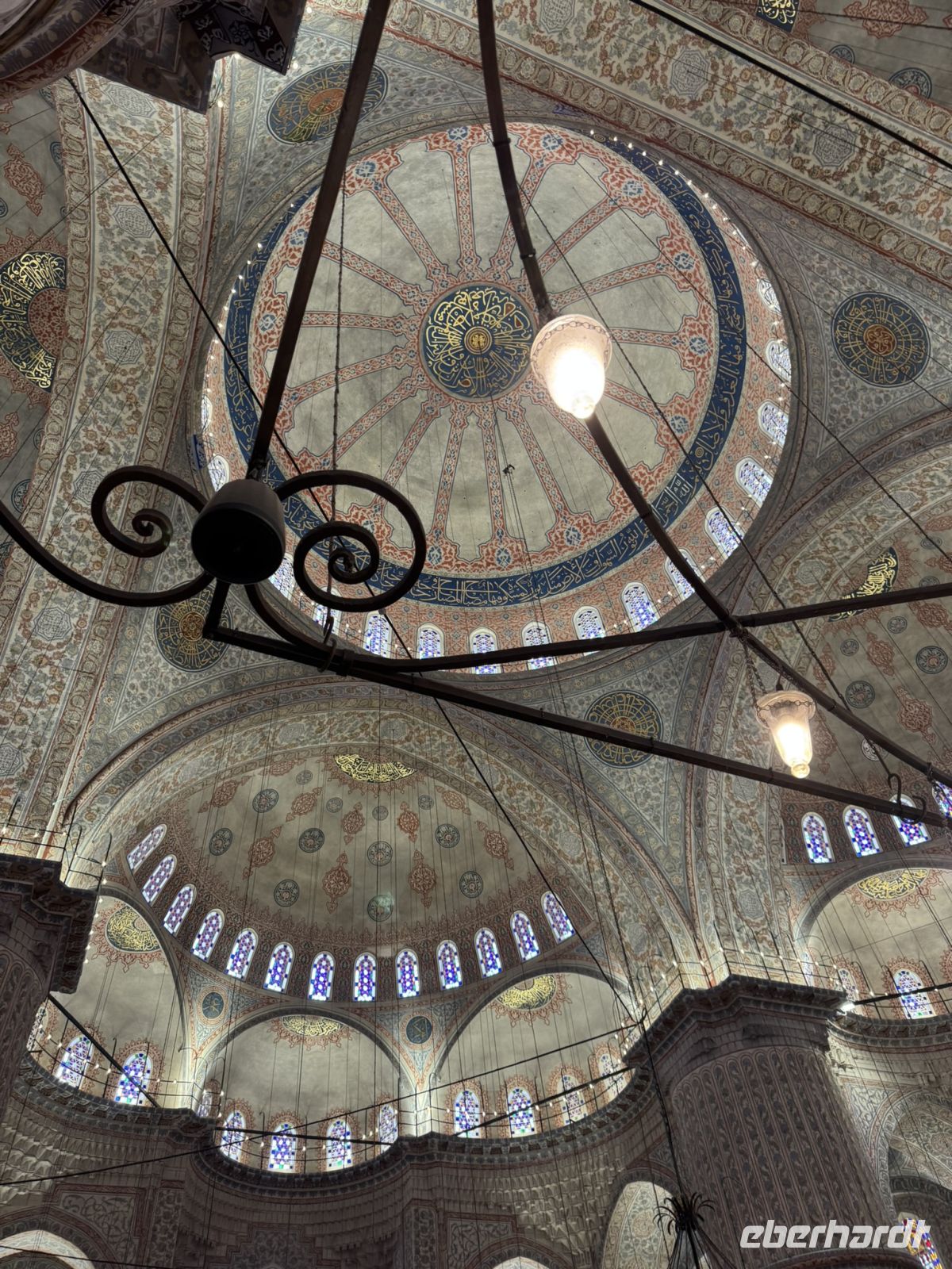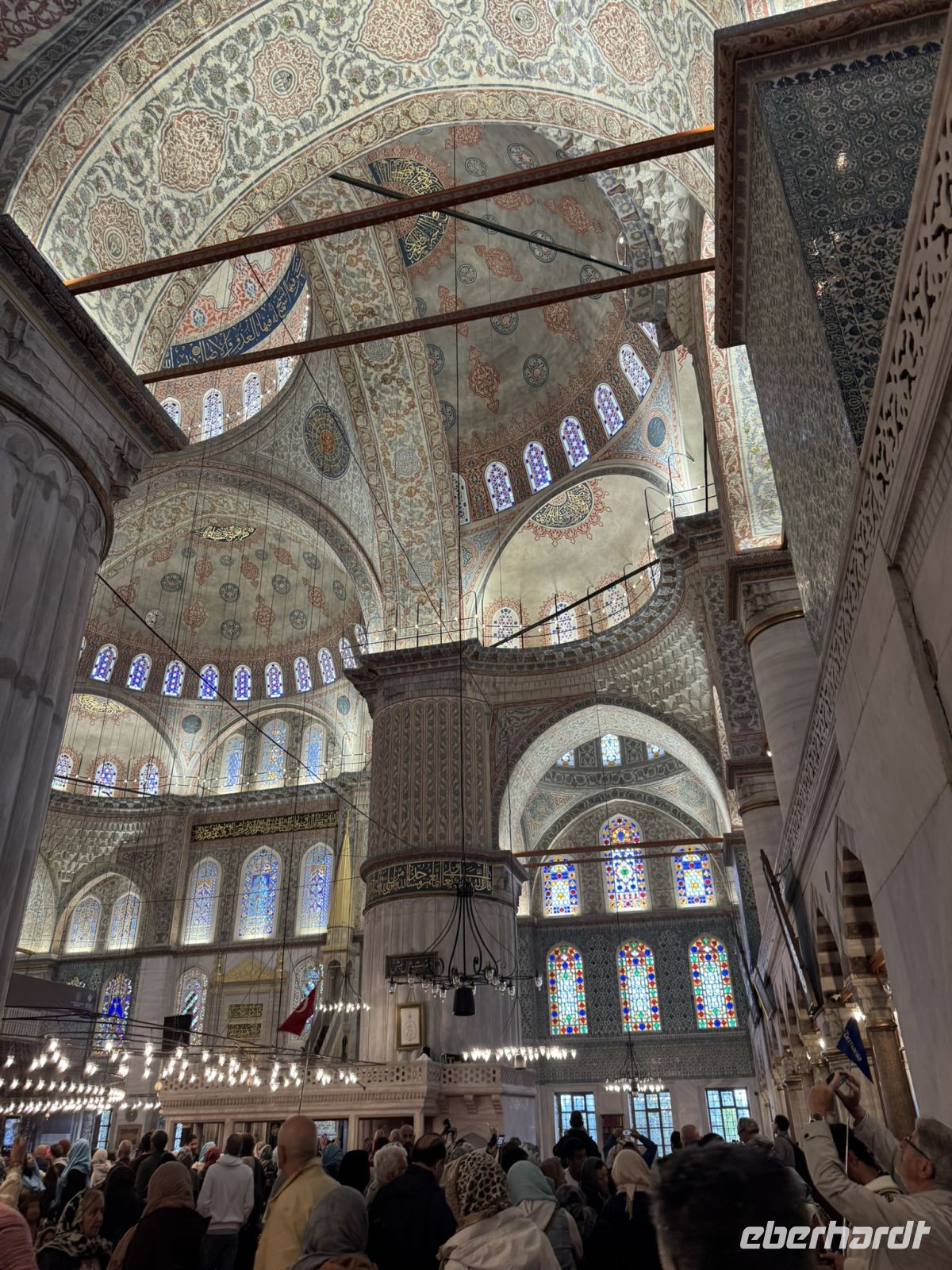 Als nächstes führte uns Fatih zur Blauen Moschee, welche eigentlich Sultan-Ahmed-Moschee nennt. Benannt nach Sultan Ahmed I., der die Moschee zwischen 1609 und 1616 erbauen ließ, um die Größe des Osmanischen Reiches zu demonstrieren und seinem Glauben Ausdruck zu verleihen. Auf dem Weg dorthin überqueren wir bereits den historischen Hippodrom-Platz, den wir uns später noch genauer anschauen. Die Blaue Moschee beeindruckt uns schon von außen mit ihren sechs schlanken Minaretten und der mächtigen Kuppel. Im Inneren erwarten uns über 20.000 kunstvoll verzierte, blaue Iznik-Fliesen, die dem Bauwerk seinen Namen geben. Die ruhige, spirituelle Atmosphäre dieses einzigartigen Ortes lässt uns für einen Moment innehalten.