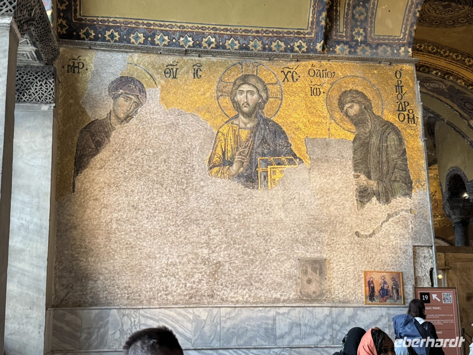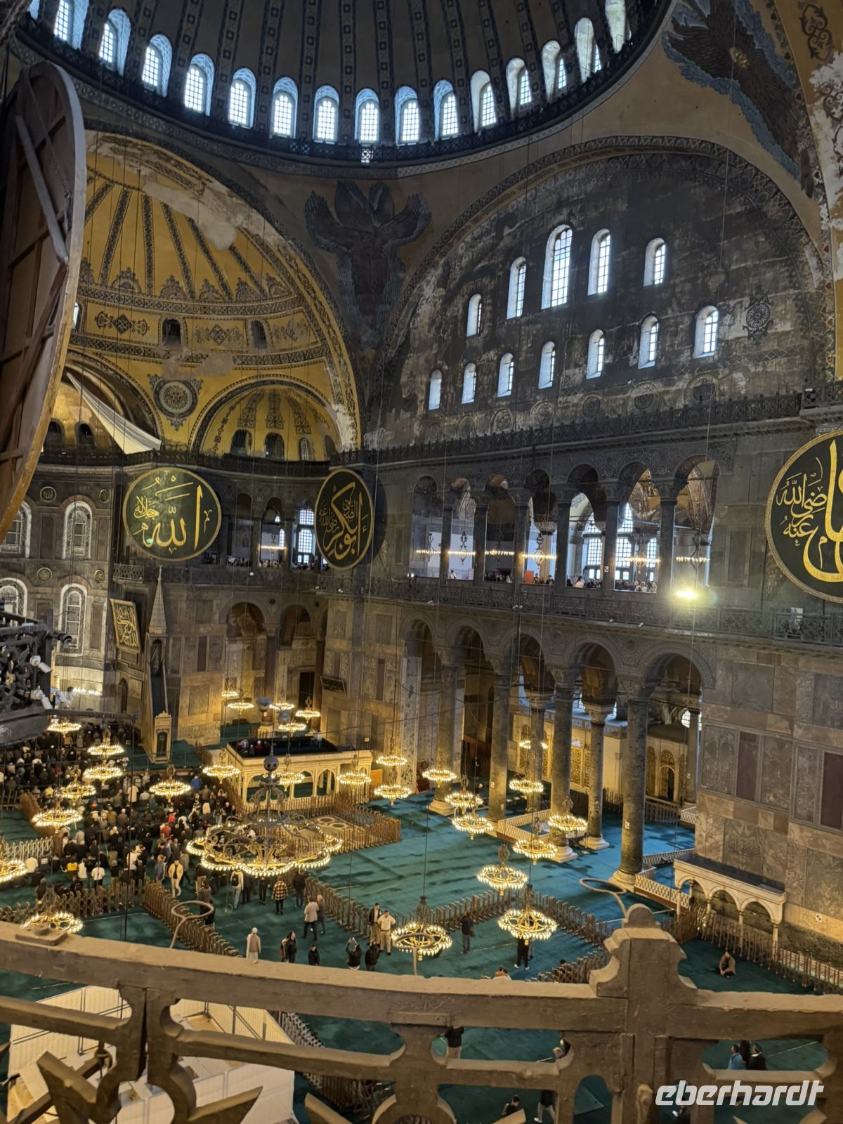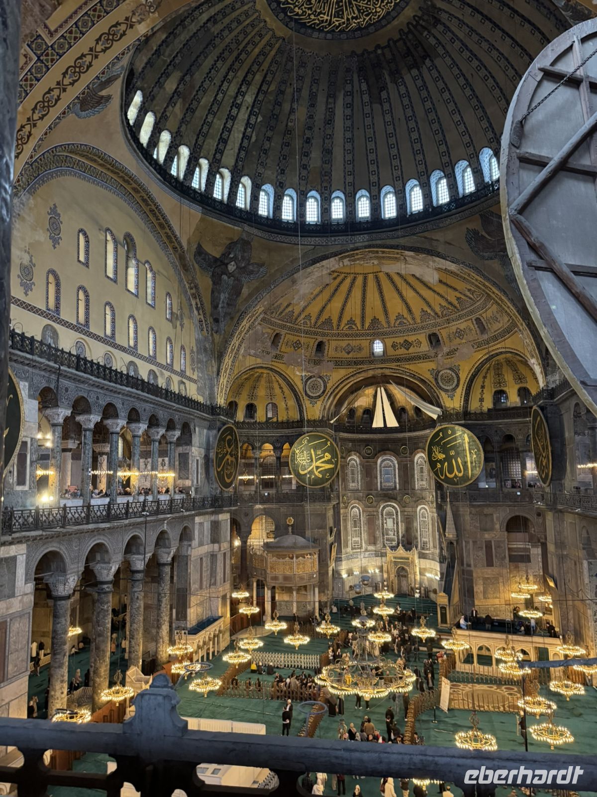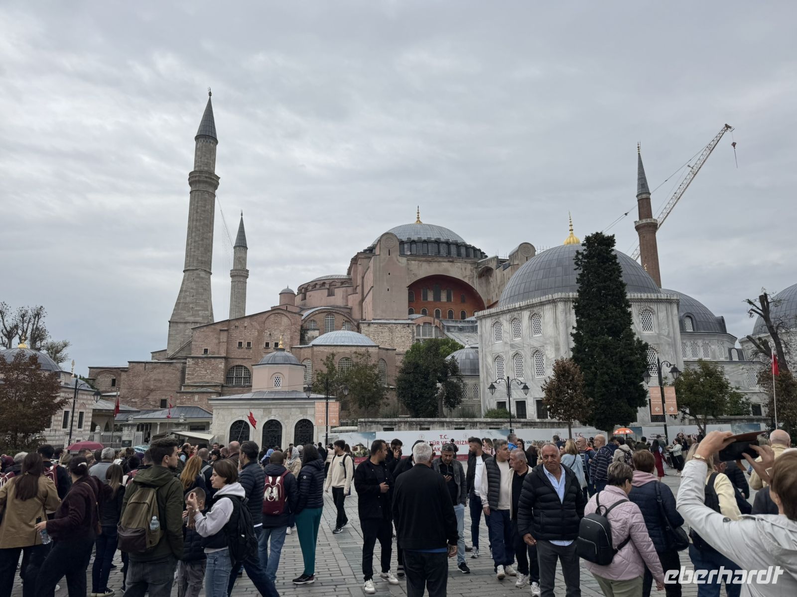 Ein weiterer Höhepunkt ist die Besichtigung der Hagia Sophia, nur wenige Schritte entfernt. Dieses monumentale Bauwerk ist über 1.500 Jahre alt und war sowohl Kirche als auch Moschee – heute ist sie ein bedeutendes Museum und Moschee. Die riesige Kuppel, die goldenen Mosaike und die besondere Lichtstimmung machen den Besuch zu einem unvergesslichen Erlebnis. Die Hagia Sophia symbolisiert die Verbindung zwischen Christentum und Islam wie kaum ein anderes Gebäude weltweit.