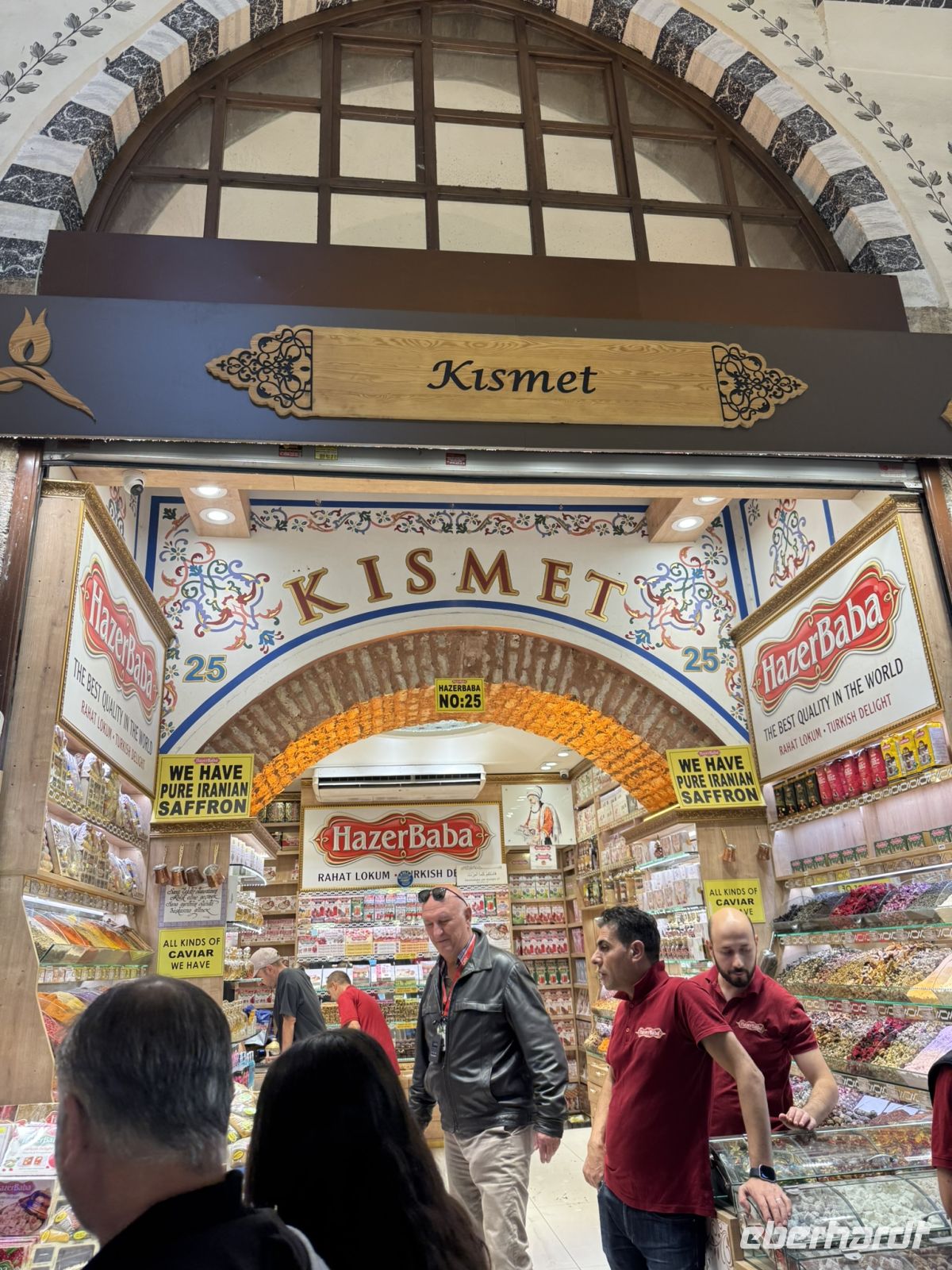 Wieder zurück auf dem Festland geht es weiter zum ägyptischen Gewürzbasar. Dort wird eine freiwillige Verkaufsveranstaltung angeboten, an der schließlich die gesamte Gruppe teilnimmt – die Neugier und die Aussicht auf türkische Spezialitäten überwiegen. Vor Ort erleben wir eine herzliche Präsentation mit zahlreichen Kostproben türkischer Süßigkeiten, Nüsse und aromatischer Tees. Während wir uns durch die Leckereien probieren, erfahren wir Wissenswertes über Herstellung, Herkunft und traditionelle Verwendung der Produkte.