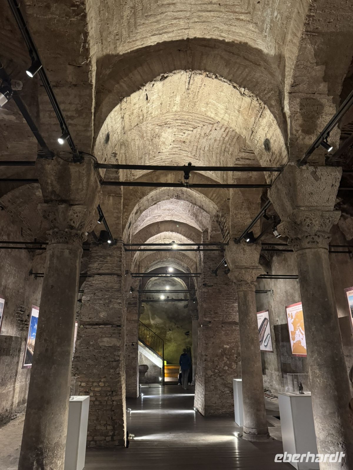 Im selben Gebäude entdecken wir ein verstecktes Juwel: die älteste Zisterne Istanbuls. Wir dürfen sie kostenfrei besichtigen und stehen staunend in dem unterirdischen Gewölbe mit seinen antiken Säulen und dem stillen Wasserbecken. Die mystische Atmosphäre dieses Ortes vermittelt eindrucksvoll, wie geschickt die Stadtbauer vergangener Zeiten mit Wasser umgehen.