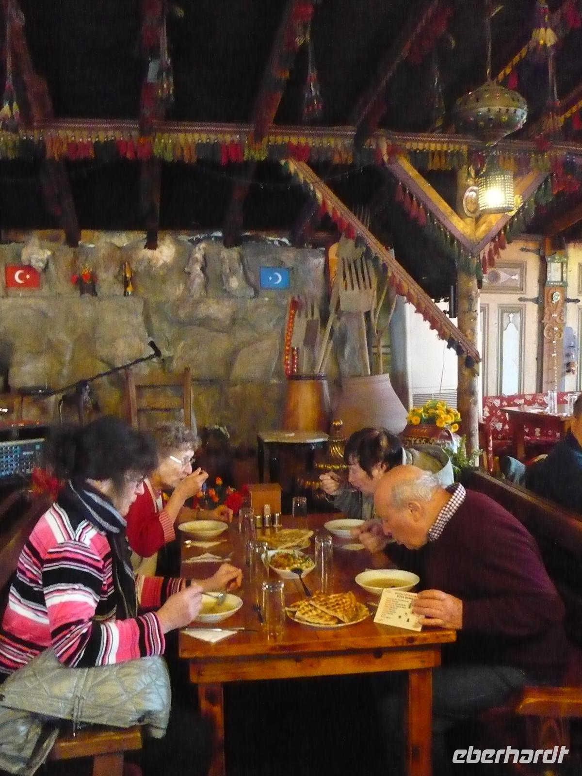 Nach dem Frühstück empfingen uns unsere Stadtführer zu einem Ausflug zum Chora-Kirche. Durch die mit osmanischen Holzhäuschen gesäumten Gassen spazierten wir zu der byzantischen Kirche. Im Inneren gibt es zahlreiche sehr gut erhaltene Wandgemälde und Mosaiken, die unter anderem die biblische Geschichte erzählen. Hier erfahren wir auch die Geschichten um den Propheten Mohammed, dessen Weg von den heiligen Tauben geführt wurde. Bevor es zurück zum Bus ging, gönnte sich der eine oder andere noch einen leckeren Sesamkringel. Durch die bunten Gassen Istanbuls fuhren wir zu unserem nächsten Höhepunkt. Auf dem Weg konnten wir den alltäglichen türkischen Verkehrswahnsinn miterleben - da werden schon einmal Einbahnstraßen umfunktioniert und kleine Kreuzungen in den Gassen als Parkplatz genutzt. In einer Teppichmanufaktur wurden wir in die Kunst des Teppichknüpfens eingeführt. Eindrucksvoll zeigte uns eine Dame die mühevolle Entstehung eines wertvollen Teppichs. Das Mittagessen haben wir in einer ganz besonderen Stelle genossen - direkt unter der Galatatabrücke befinden sich einige Spezialitätenrestaurants mit Blick auf das Goldene Horn. Gestärkt von einem mediterranen Mittagessen fuhren wir in den heiligen Stadtteil Eyüp. Zahlreiche Pilgerer kommen jährlich zu der Sultan-Eyüp-Moschee um am Grab eines Gefährten von Mohammed zu beten. Der Hof der Moschee im nördlichen Stadtteil Istanbuls ist aufwendig mit weißen und blauen Mosaiken beschmückt. Auf dem großen Marmorplatz vor der Moschee werden die zu hunderten herumfliegenden, heiligen Tauben gefüttert. Durch die Gräber der vielen Gläubigen auf den umliegenden Hügeln spazieren wir hoch bis zum Café Pierre Loti. Von hier aus genoss bereits der namensgebende französische Schriftsteller seinen Kaffee mit Blick auf die Stadtufer des Bosporus - und wir zögern nicht lange um es ihm gleich zu tun. Ein weiterer guter Aussichtspunkt nahe unseres Hotels ist unser nächstes Ziel - der Galataturm. Von hier aus haben wir eine andere Perspektive auf die Stadt. Den Abend verbrachten einige Gäste bei typischen Essen und einem Gläschen Wein oder Bier in einem typischen kleinen Restaurant.