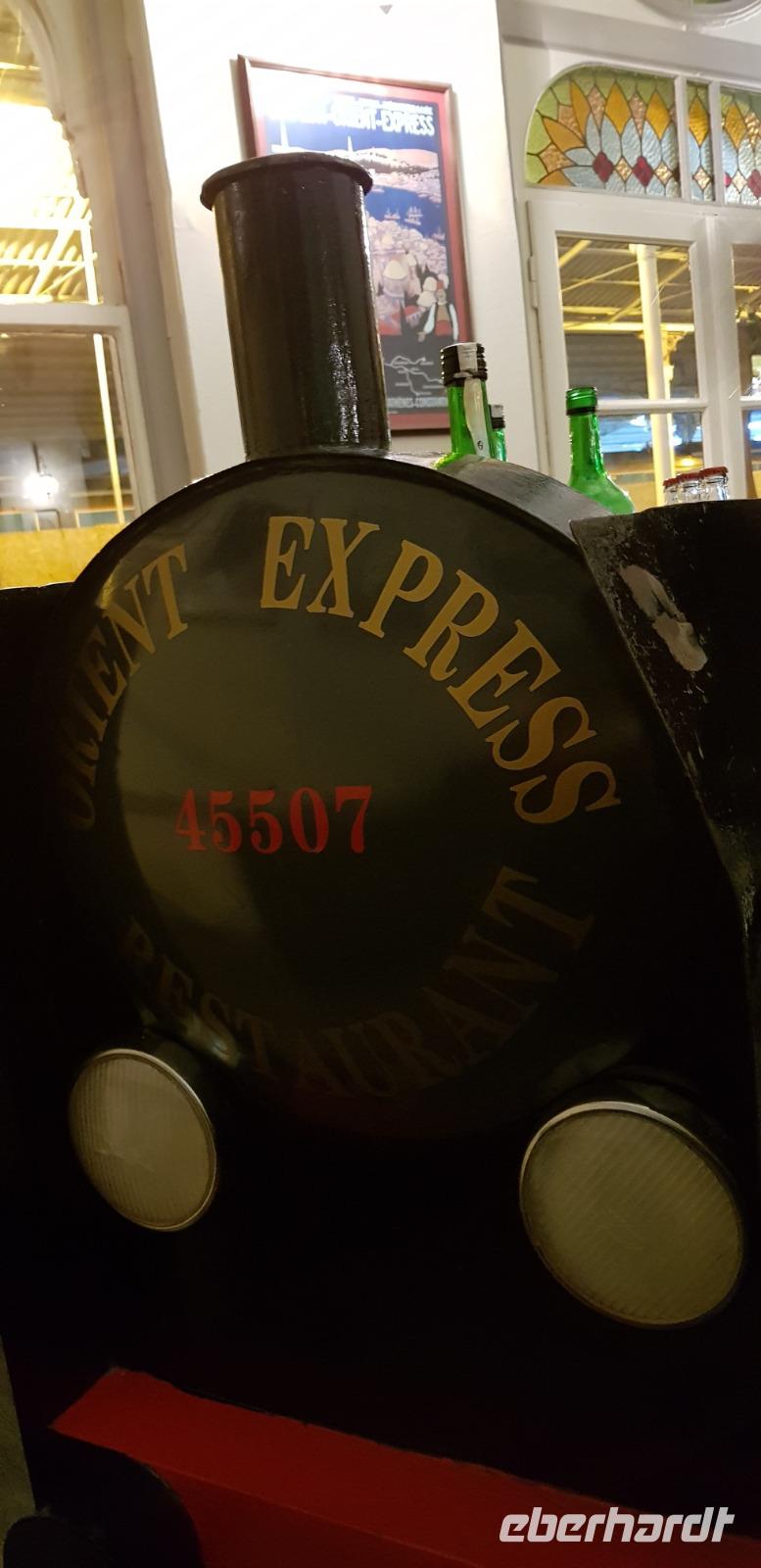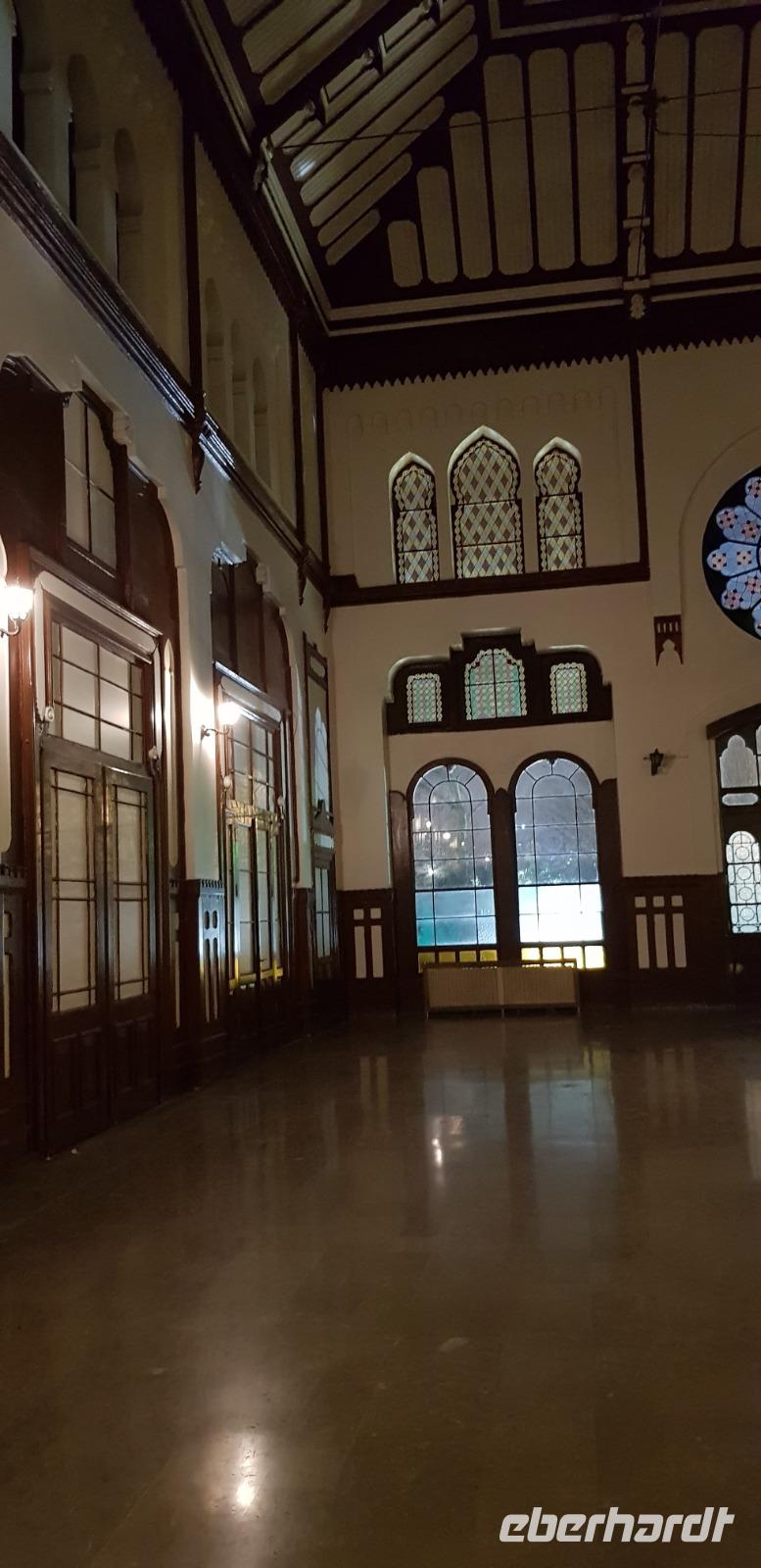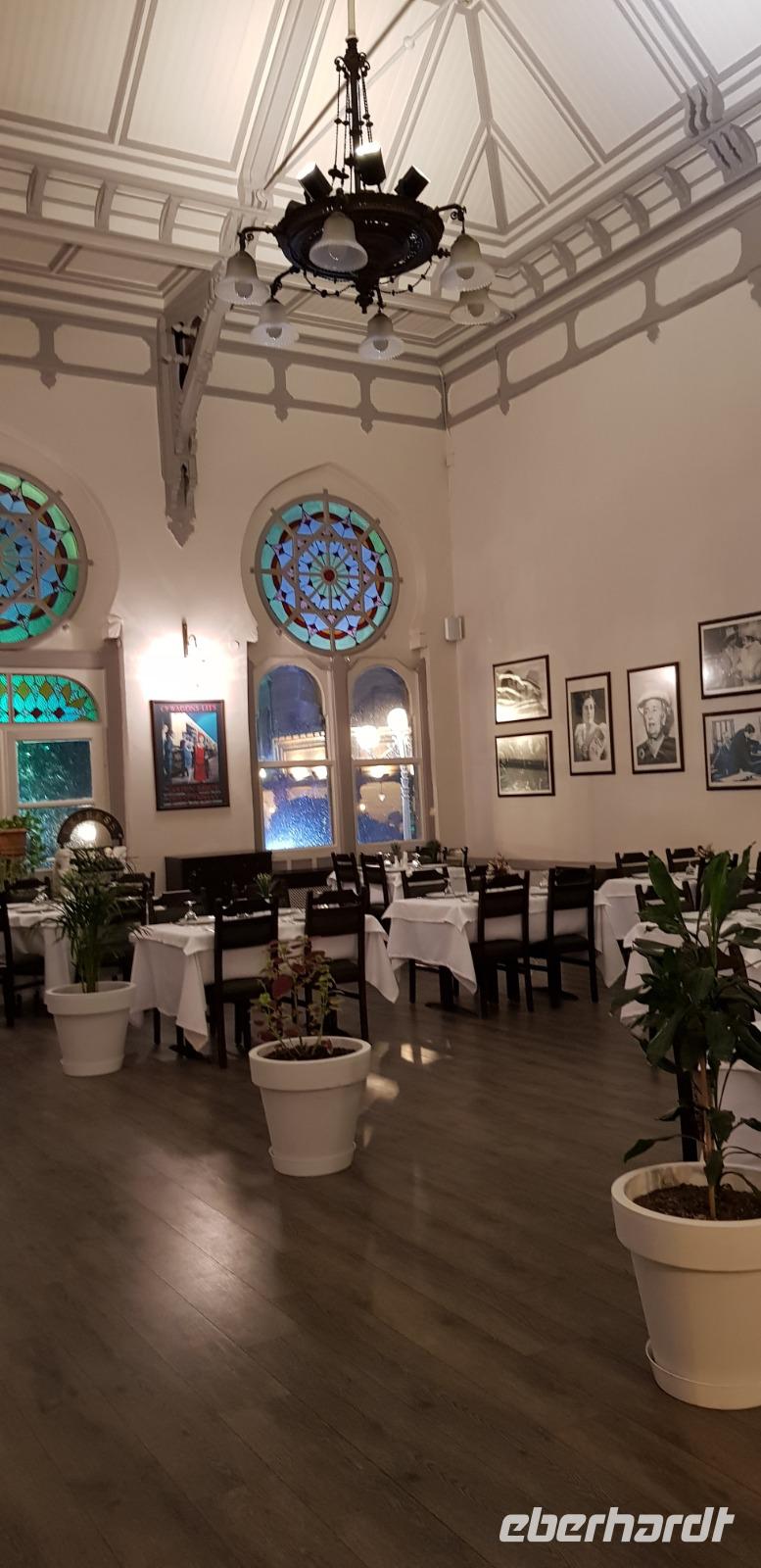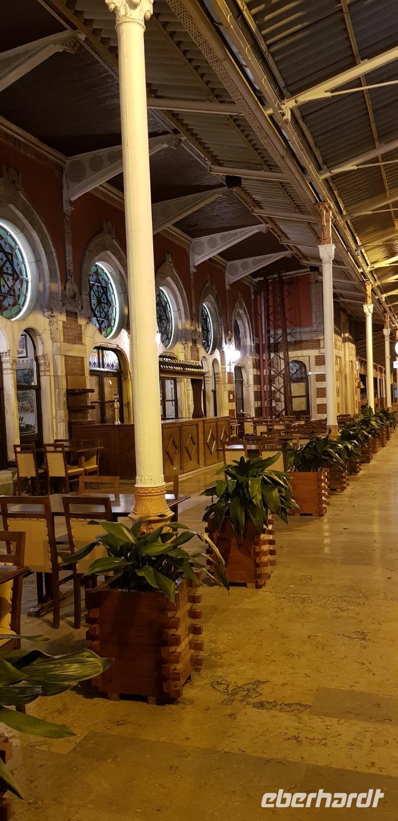 Nun haben wir unser Hotel erreicht. Es befindet sich mitten in der Altstadt, sehr zentral. Wir checken ein, beziehen die Zimmer und die Hälfte der Gruppe trifft sich anschließend gleich wieder in der Lobby, um gemeinsam mit Serdar zum Abendessen zu gehen. Die anderen Gäste kommen nicht mit, sie gehen individuell zum Abendessen. Bei der Reise ist nur am Silvestertag das Abendessen inkludiert. Wir fahren mit der Straßenbahn. Die Haltestelle befindet sich gleich um die Ecke. An der zweiten Haltestelle steigen wir wieder aus. Hier ist der Bahnhof Sirkeci, auf dem der Luxuszug "Orient-Express", der erstmals Ende des 19. Jh. von Paris nach Konstantinopel fuhr, endete. Der Bahnhof wurde umgebaut. Heute befindet sich im ehemaligen Wartesaal ein Restaurant, in das wir einkehren und die Bahnhofshalle mit dem Fahrkartenschalter wurde restauriert und kann besichtigt werden. Wir genießen ein fünfgängiges Menü mit typischen nationalen Speisen und lernen uns schon ein wenig kennen. Dann fahren wir mit der Straßenbahn wieder zurück zum Hotel. Alle fallen müde in ihre Betten.