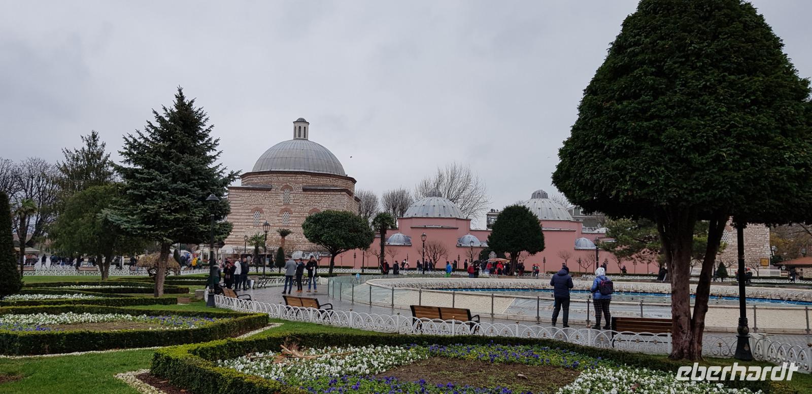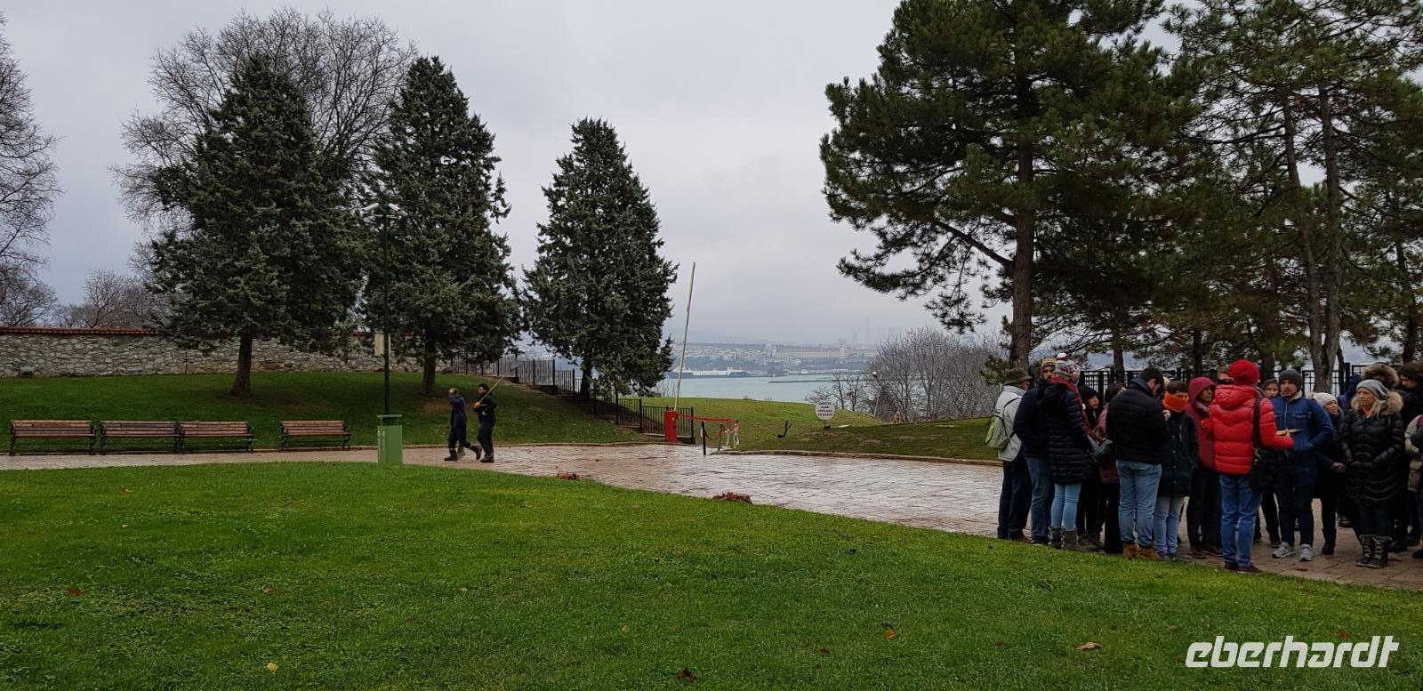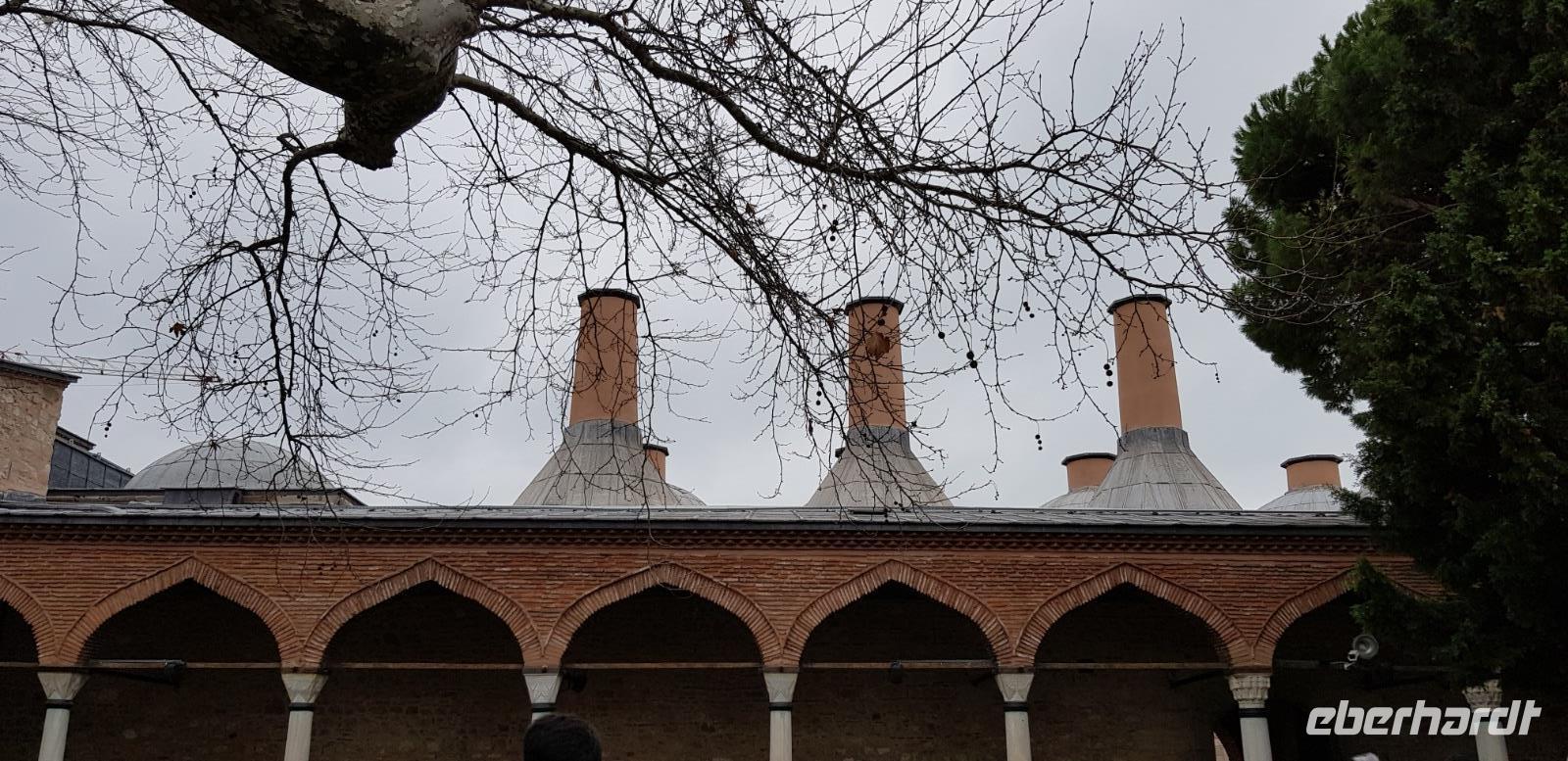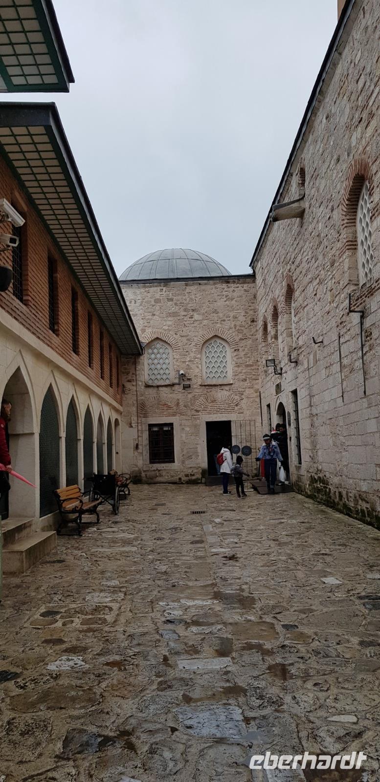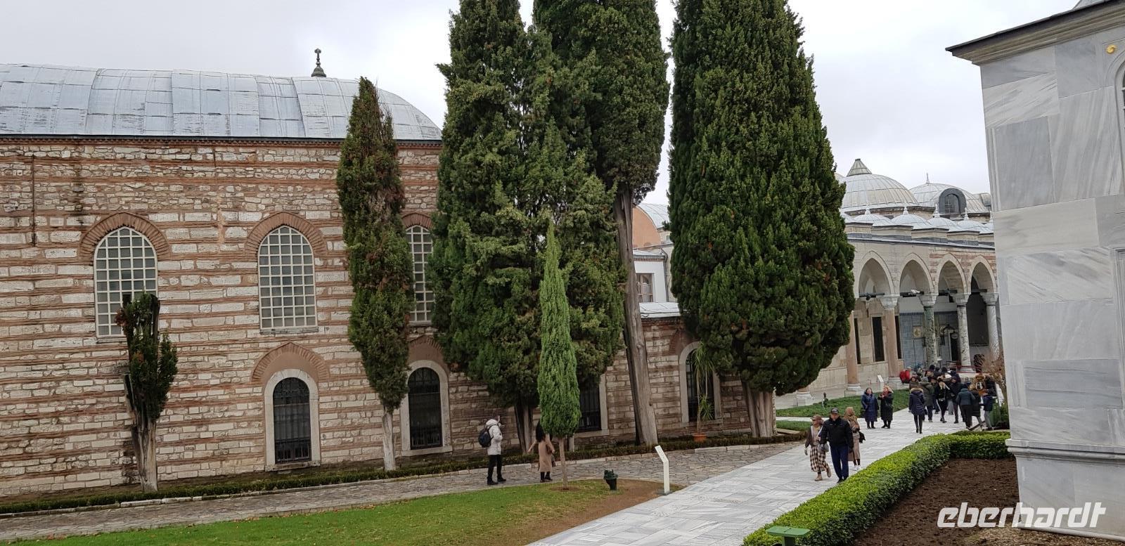 Weiter gehen wir gemeinsam durch die Vorhöfe der Blauen Moschee zur Hagia Sophia, die sich unmittelbar anschließt. Die Besichtigung verschieben wir auf den Nachmittag, weil jetzt der Andrang zu groß ist und wir zu lange warten müssten. So besichtigen wir erst den Topkapi Palast, der sich unmittelbar an die Hagia Sophia anschließt.
