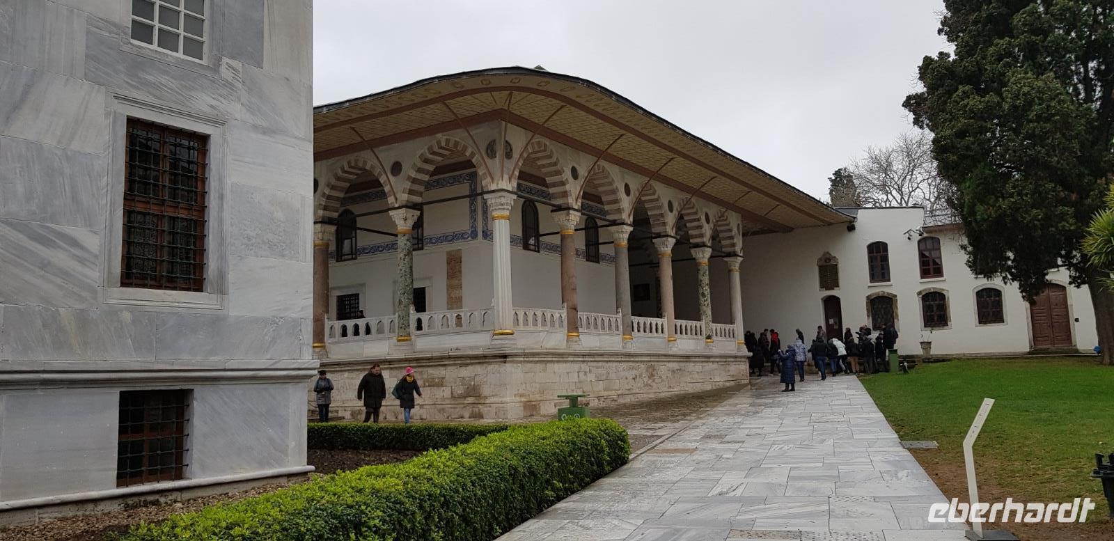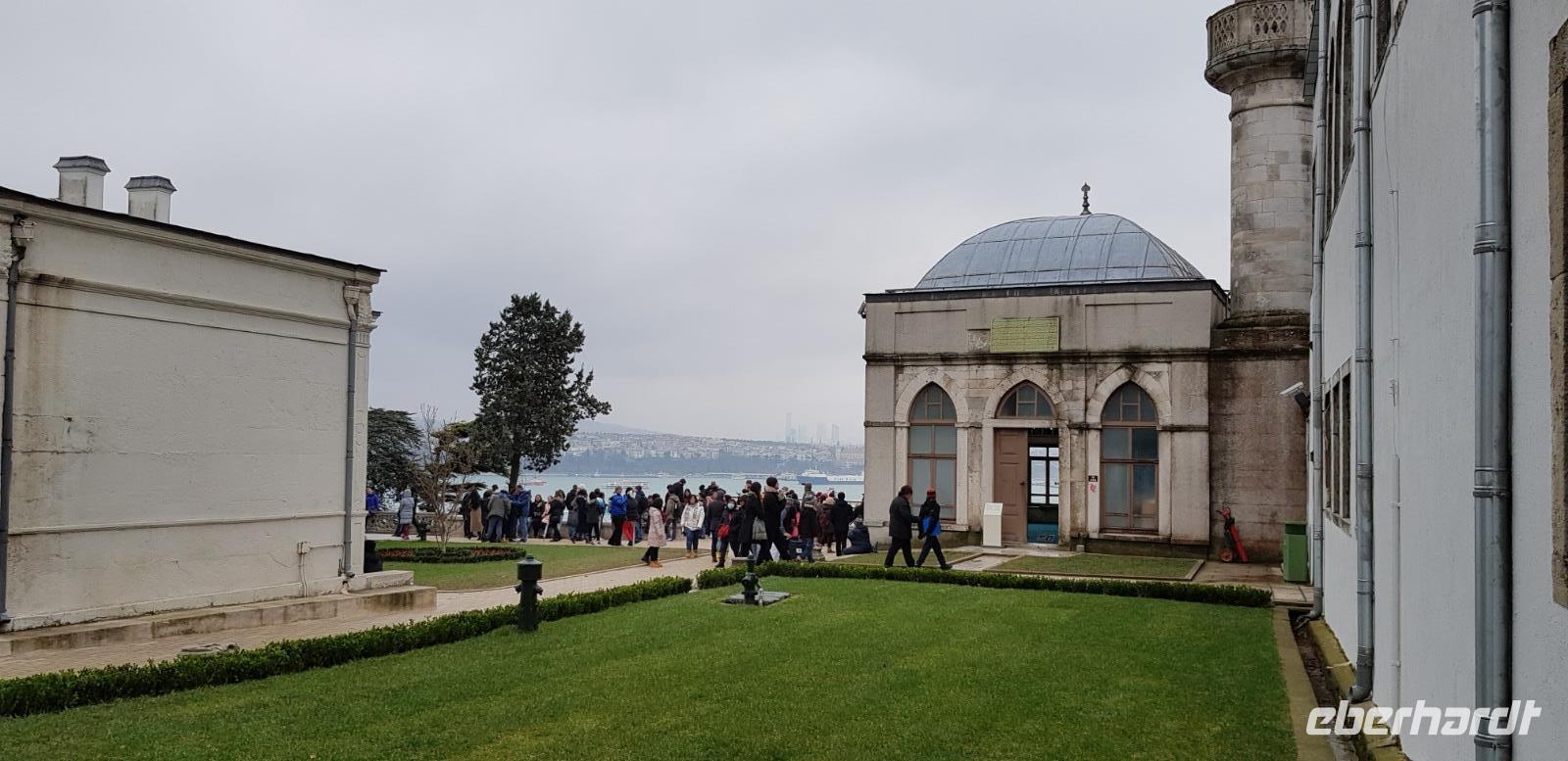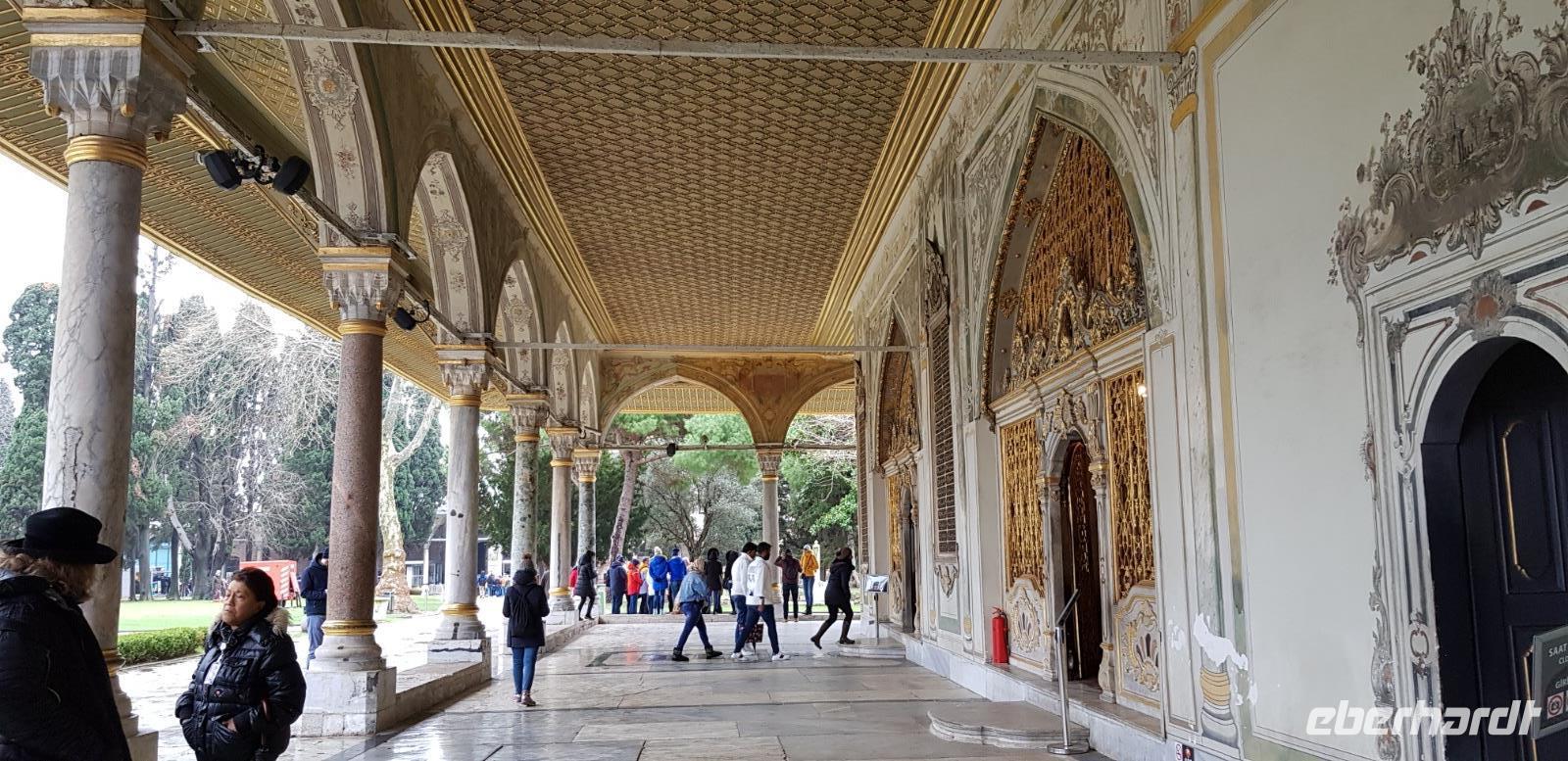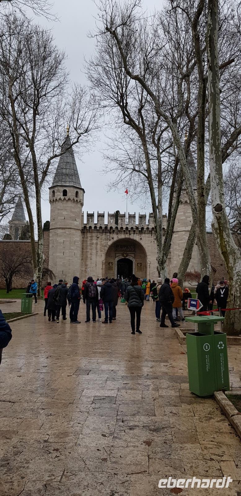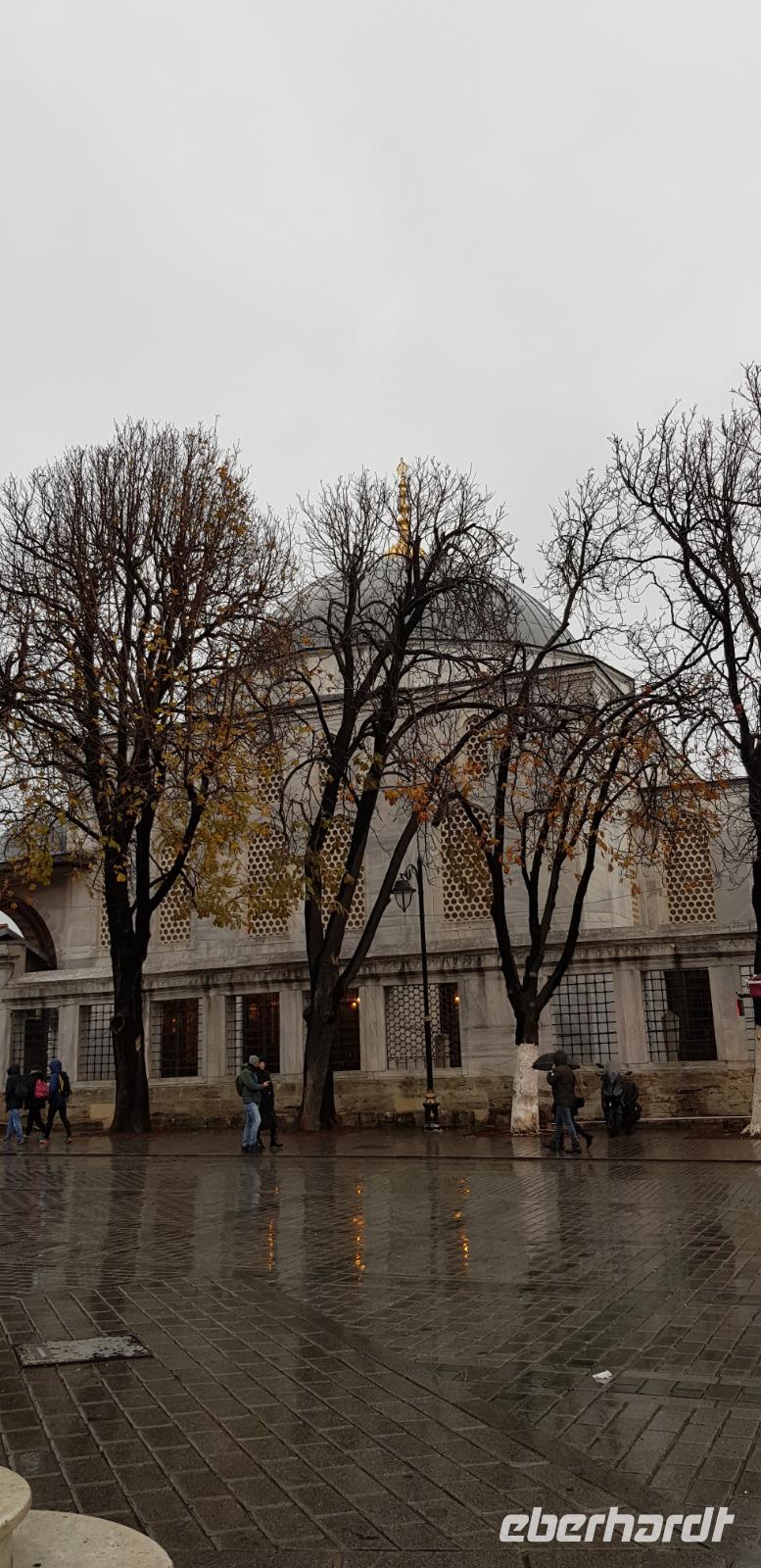 Weiter gehen wir gemeinsam durch die Vorhöfe der Blauen Moschee zur Hagia Sophia, die sich unmittelbar anschließt. Die Besichtigung verschieben wir auf den Nachmittag, weil jetzt der Andrang zu groß ist und wir zu lange warten müssten. So besichtigen wir erst den Topkapi Palast, der sich unmittelbar an die Hagia Sophia anschließt.