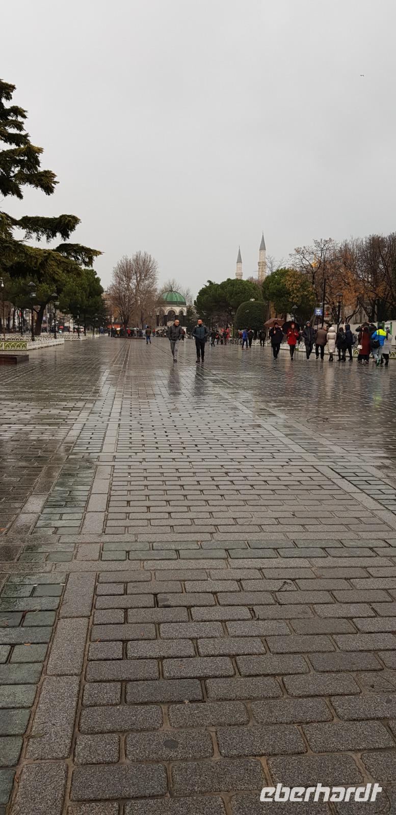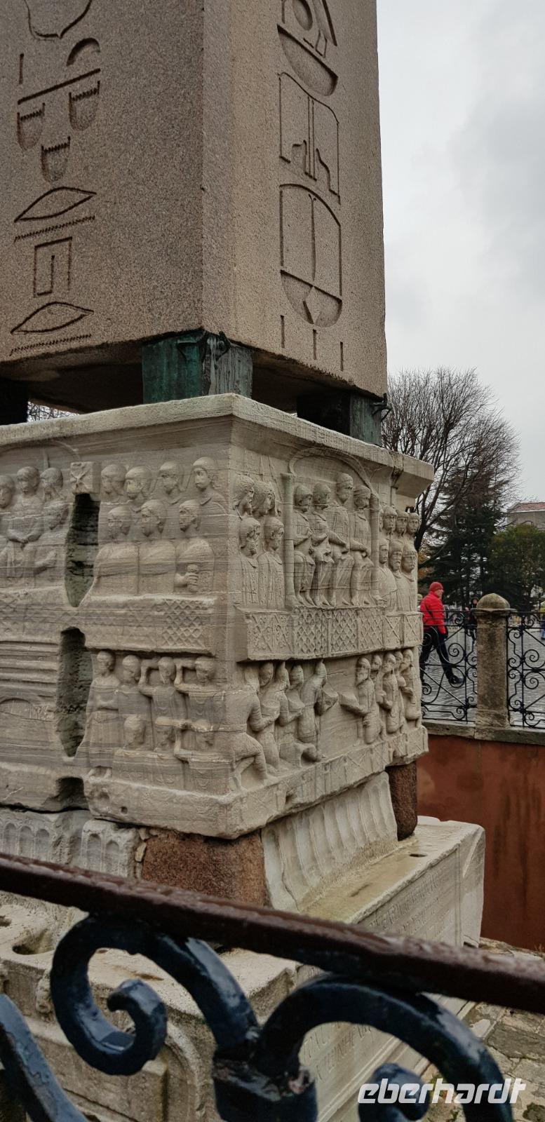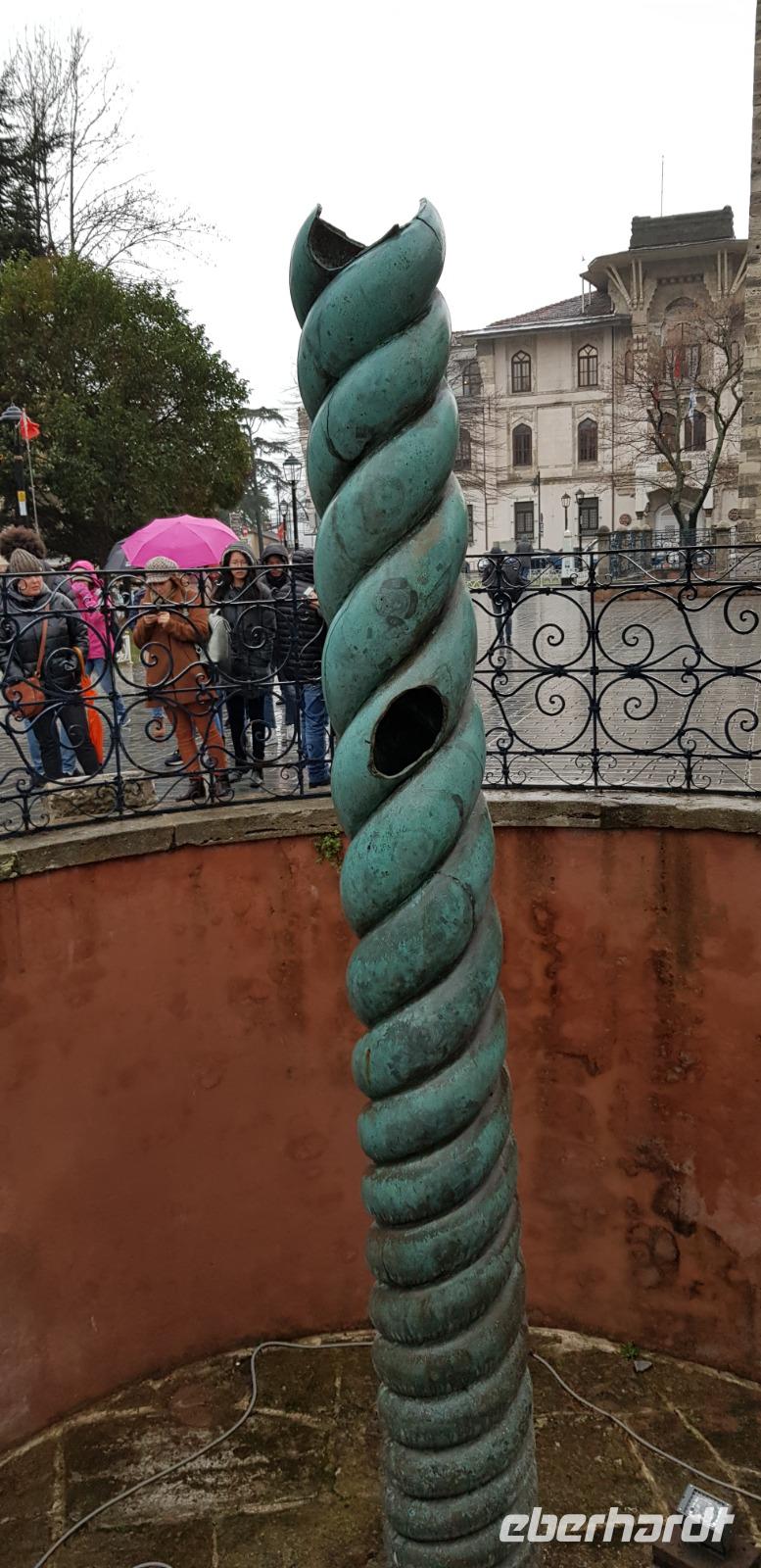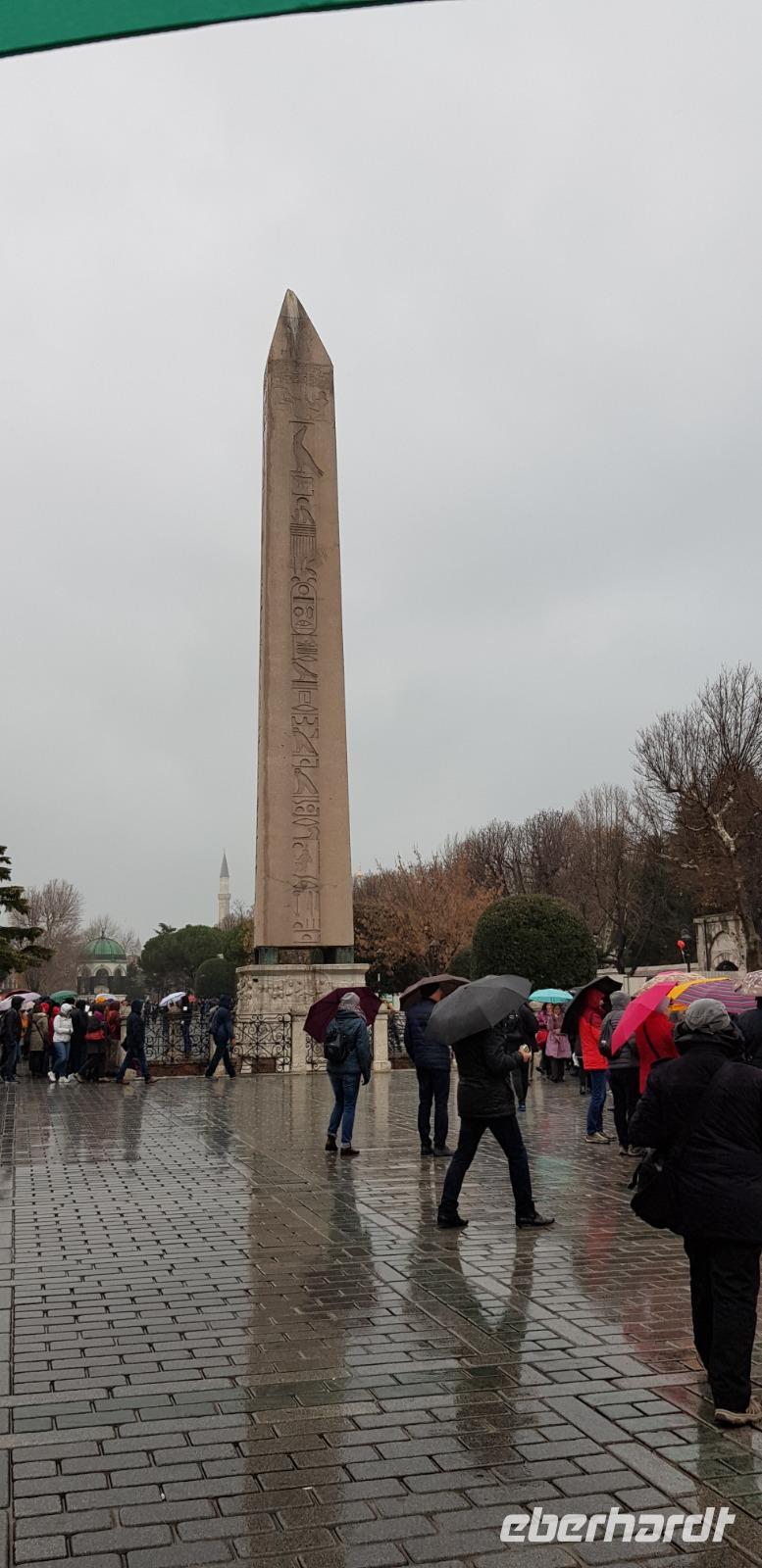 Um 9.00 Uhr treffen wir uns mit Serdar zum Stadtrundgang in der Hotel-Lobby. Den Regenschirm sollten wir unbedingt mitnehmen - leider. Wir lassen uns aber die Laune nicht verderben. In fünf Minuten haben wir schon das Hippodrom erreicht, was man aber nur noch erahnen kann. Hier fanden im alten Byzanz Spiele und Wagenrennen für das Volk statt. Es sind nur noch der ägyptische Obelisk, die Schlangensäule und eine Bronzesäule erhalten.