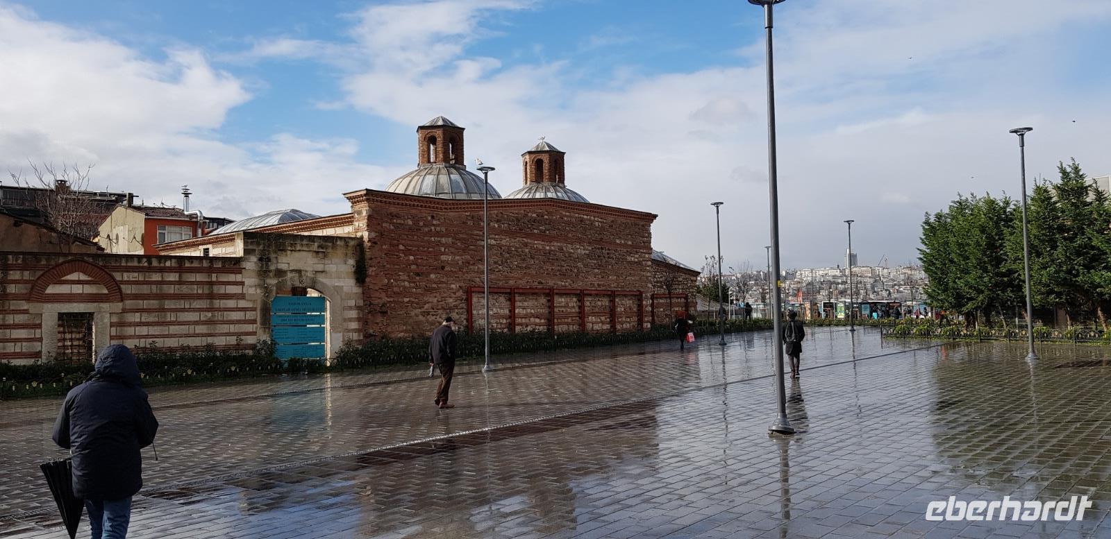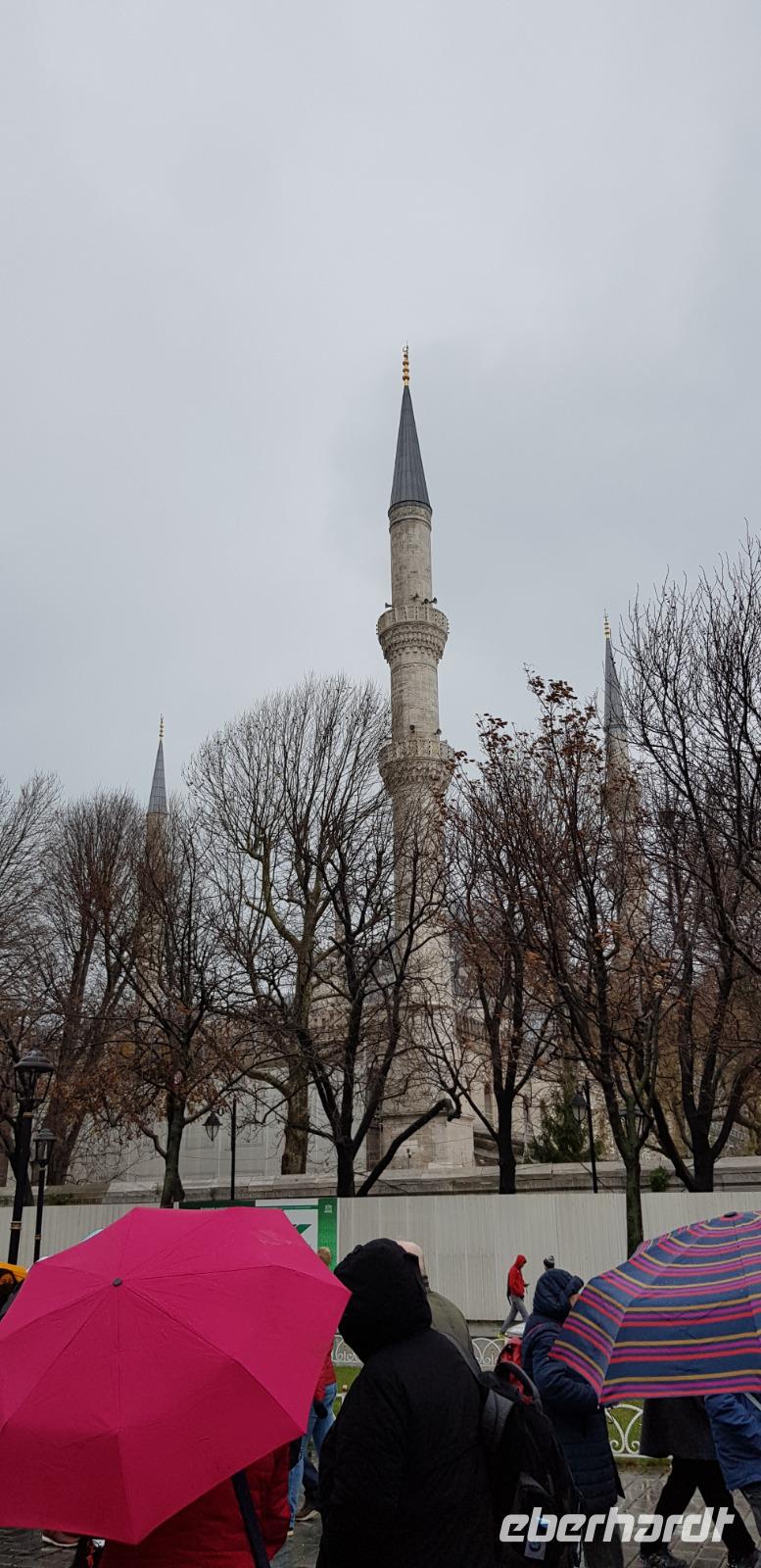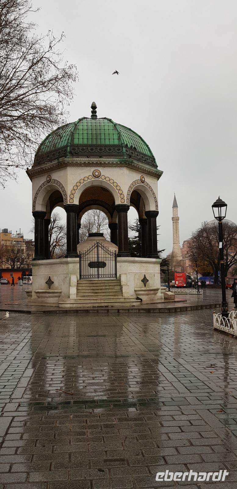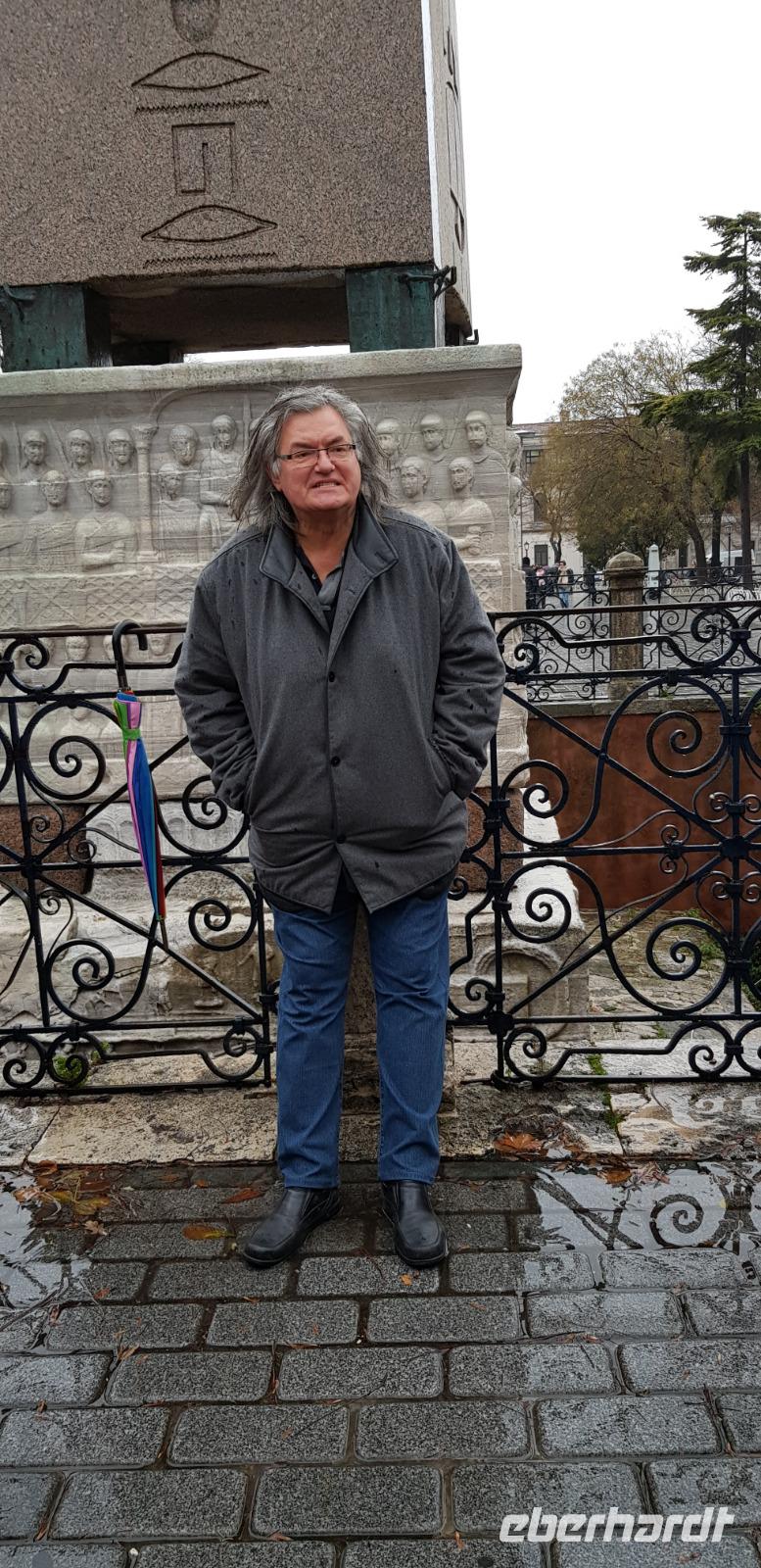 Um 9.00 Uhr treffen wir uns mit Serdar zum Stadtrundgang in der Hotel-Lobby. Den Regenschirm sollten wir unbedingt mitnehmen - leider. Wir lassen uns aber die Laune nicht verderben. In fünf Minuten haben wir schon das Hippodrom erreicht, was man aber nur noch erahnen kann. Hier fanden im alten Byzanz Spiele und Wagenrennen für das Volk statt. Es sind nur noch der ägyptische Obelisk, die Schlangensäule und eine Bronzesäule erhalten.