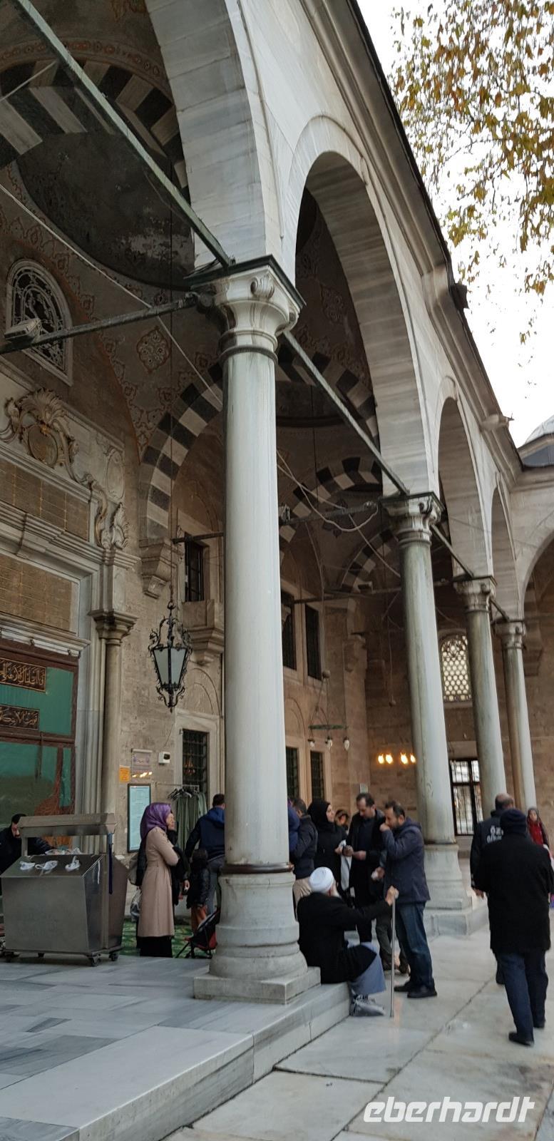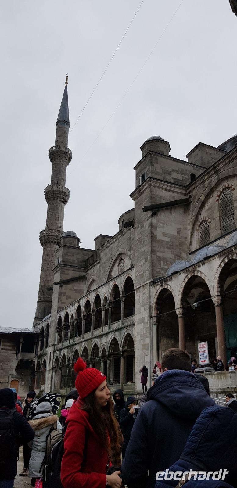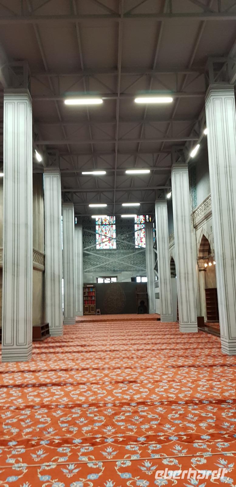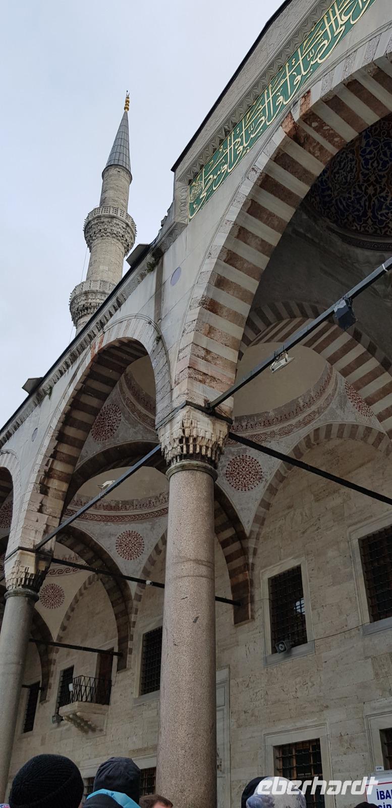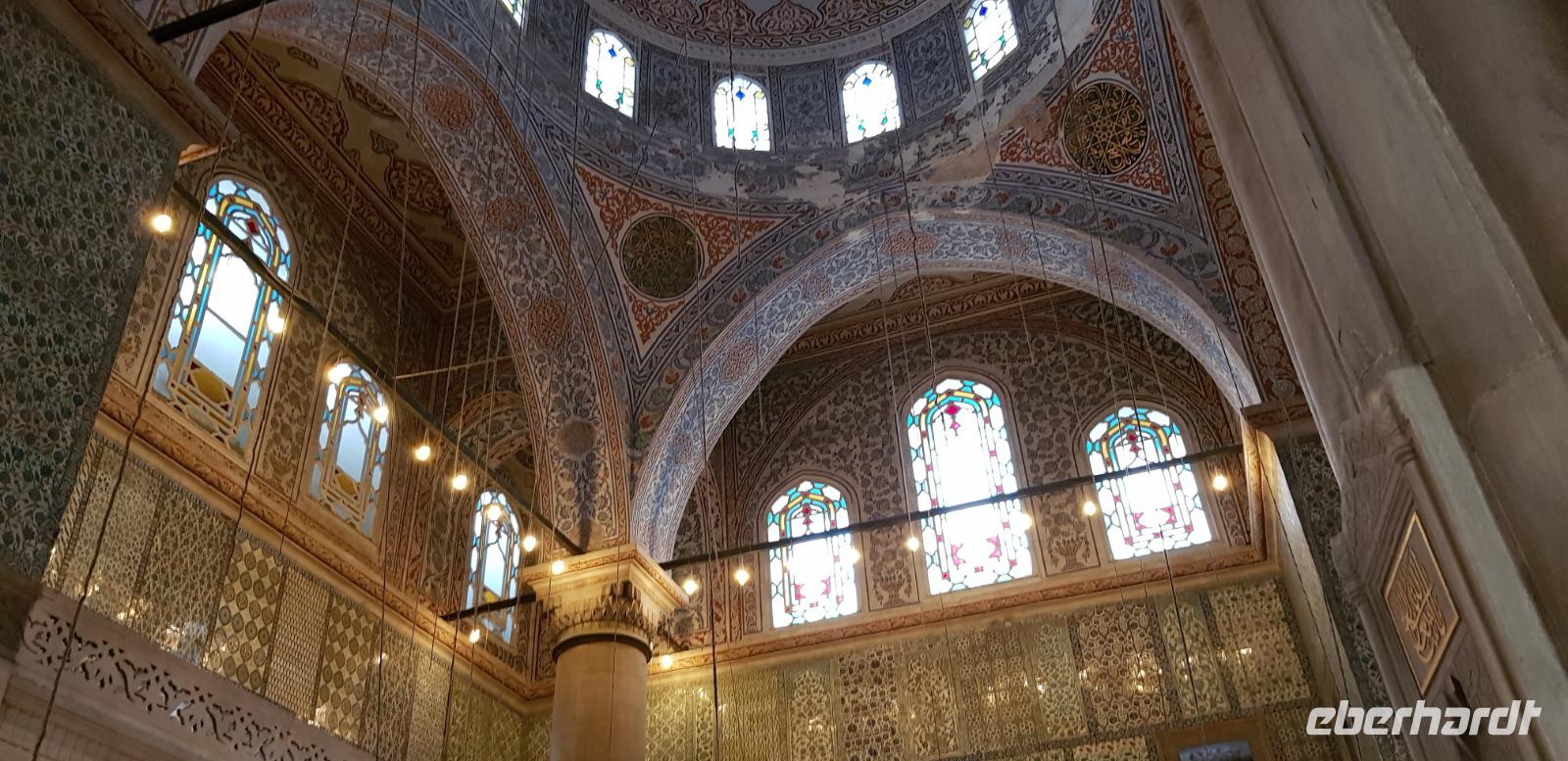 Vom Hyppodrom sind es nur wenige Schritte bis zur Sultan Ahmet Camil, die wegen der blauen Kacheln im Inneren auch Blaue Moschee genannt wird. In der Moschee müssen die Frauen ein Kopftuch tragen, eine Mütze ist auch erlaubt. Wir betreten die Moschee durch einen Seiteneingang. Alle Besucher müssen die Schuhe ausziehen. Serdar erklärt uns das Innere der Moschee. Dann kann sich jeder noch für sich umschauen.
