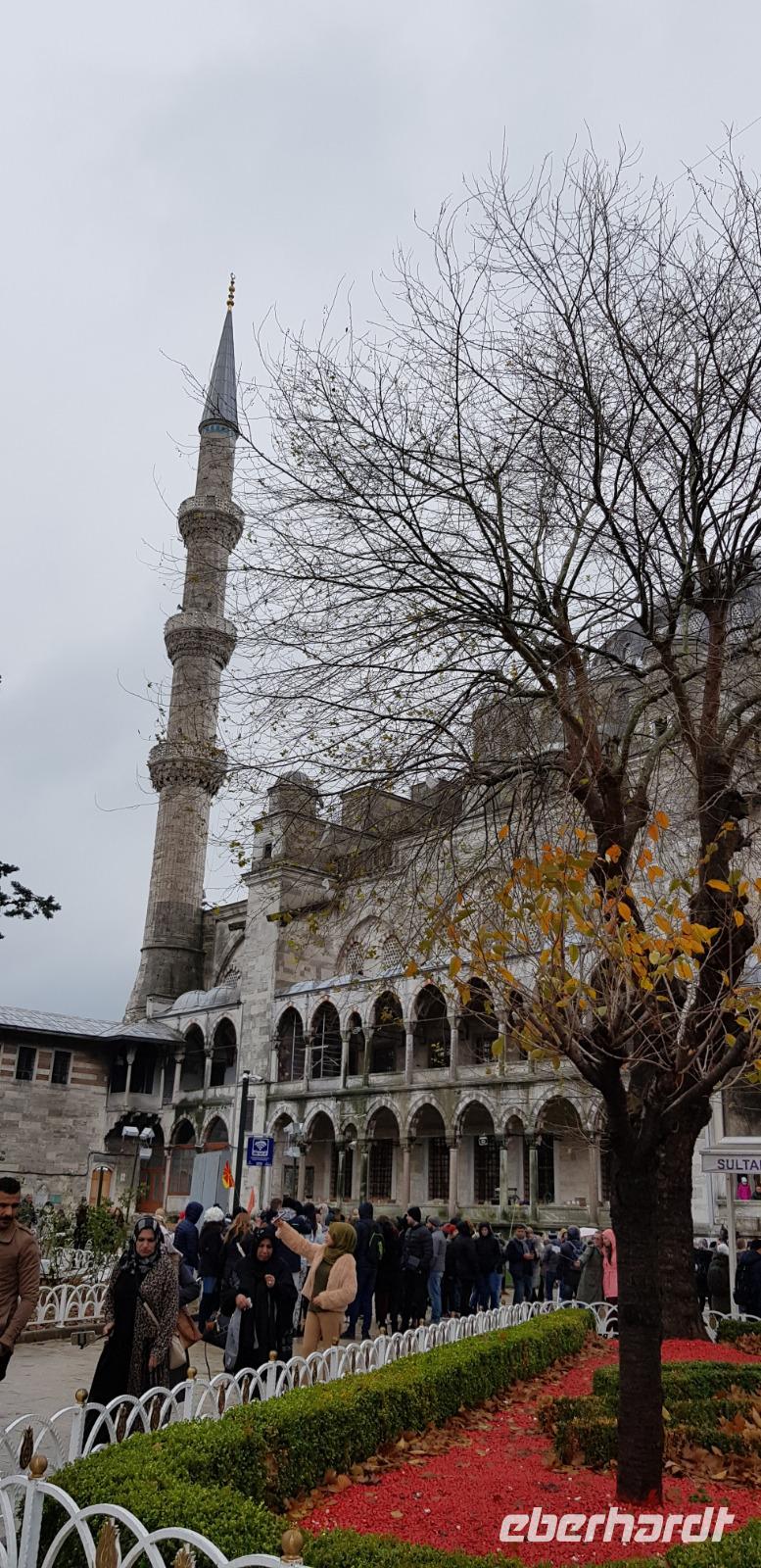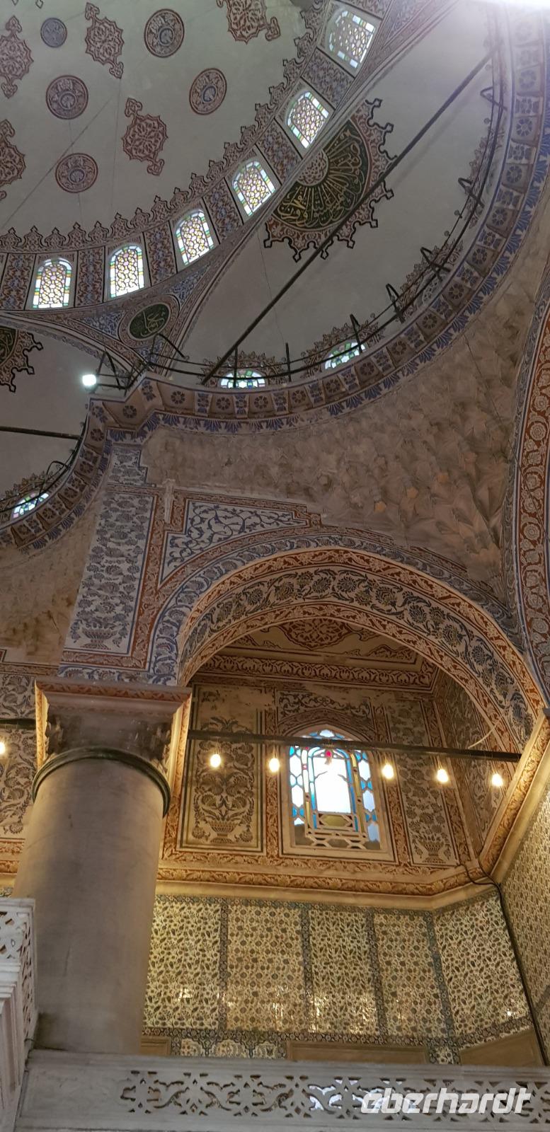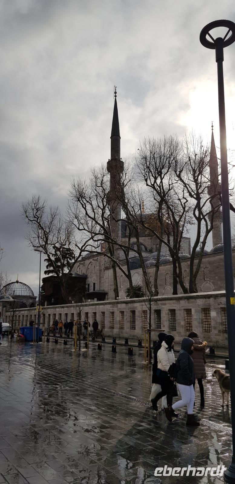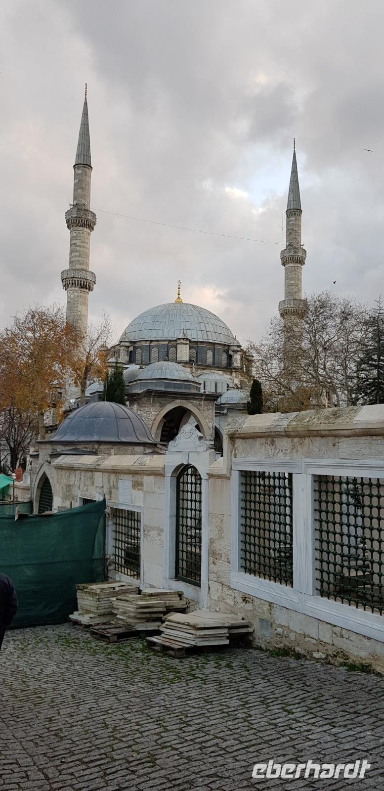 Vom Hyppodrom sind es nur wenige Schritte bis zur Sultan Ahmet Camil, die wegen der blauen Kacheln im Inneren auch Blaue Moschee genannt wird. In der Moschee müssen die Frauen ein Kopftuch tragen, eine Mütze ist auch erlaubt. Wir betreten die Moschee durch einen Seiteneingang. Alle Besucher müssen die Schuhe ausziehen. Serdar erklärt uns das Innere der Moschee. Dann kann sich jeder noch für sich umschauen.