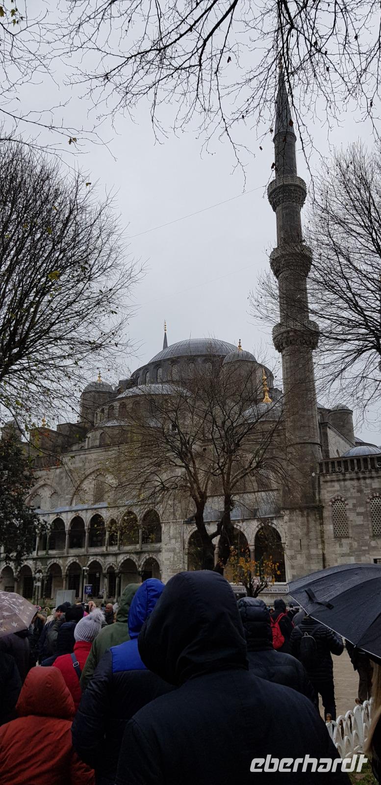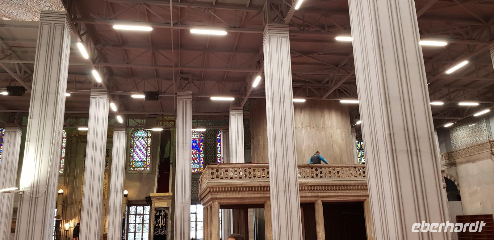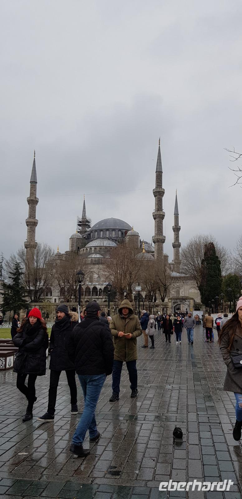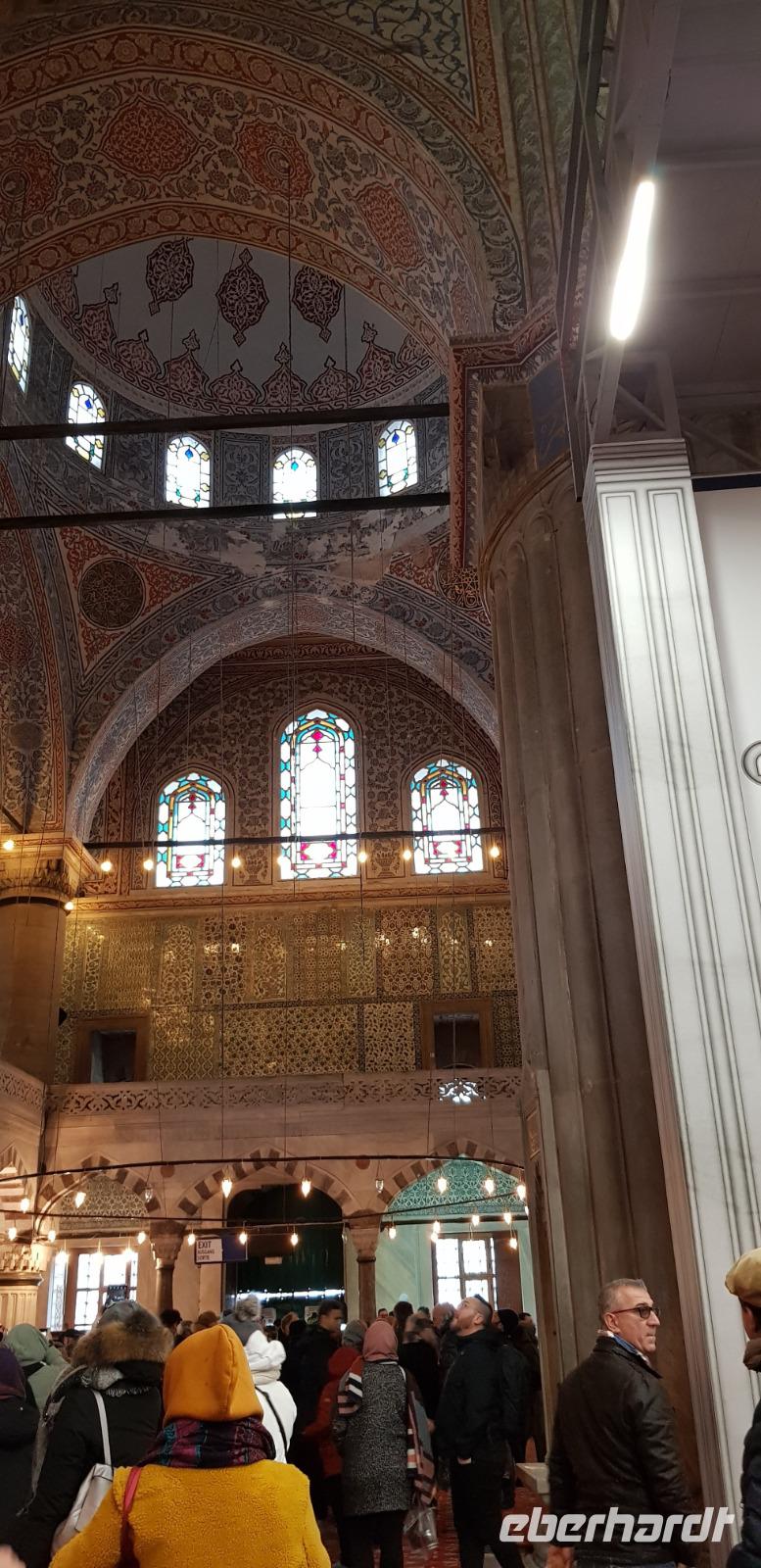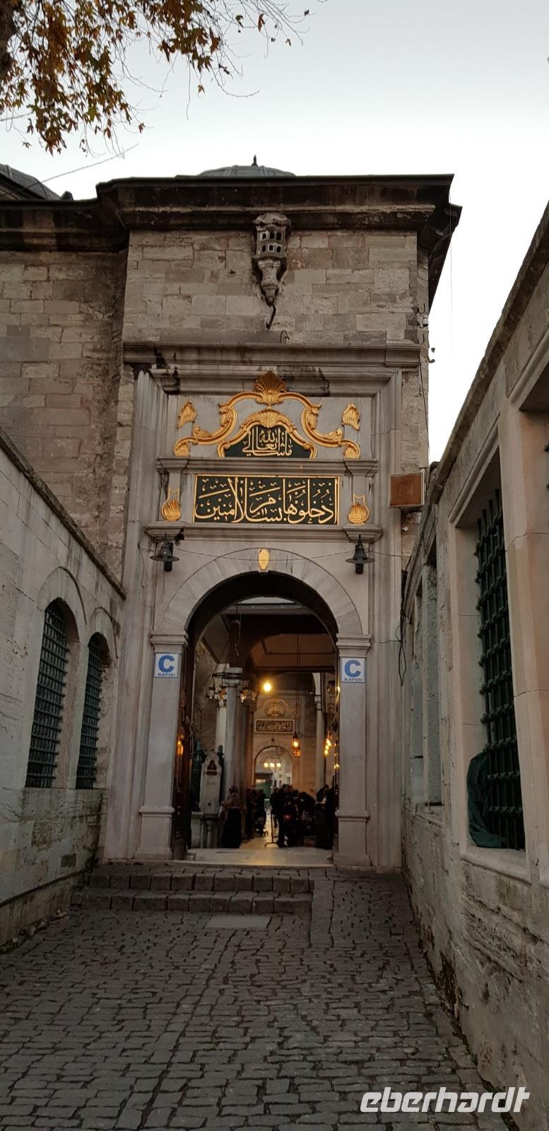 Vom Hyppodrom sind es nur wenige Schritte bis zur Sultan Ahmet Camil, die wegen der blauen Kacheln im Inneren auch Blaue Moschee genannt wird. In der Moschee müssen die Frauen ein Kopftuch tragen, eine Mütze ist auch erlaubt. Wir betreten die Moschee durch einen Seiteneingang. Alle Besucher müssen die Schuhe ausziehen. Serdar erklärt uns das Innere der Moschee. Dann kann sich jeder noch für sich umschauen.