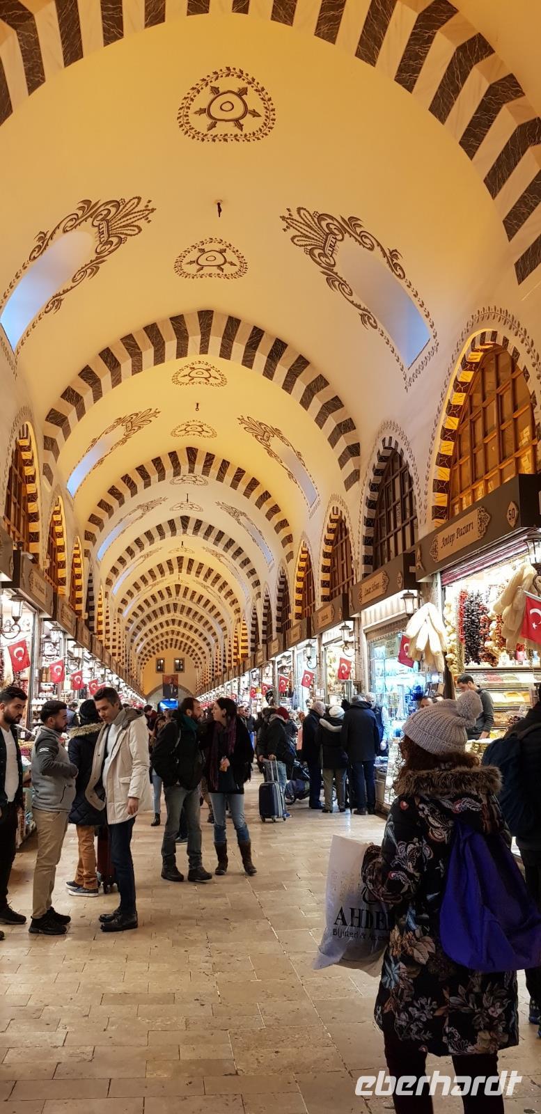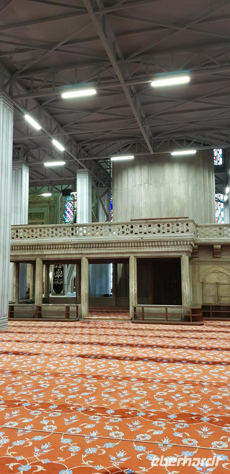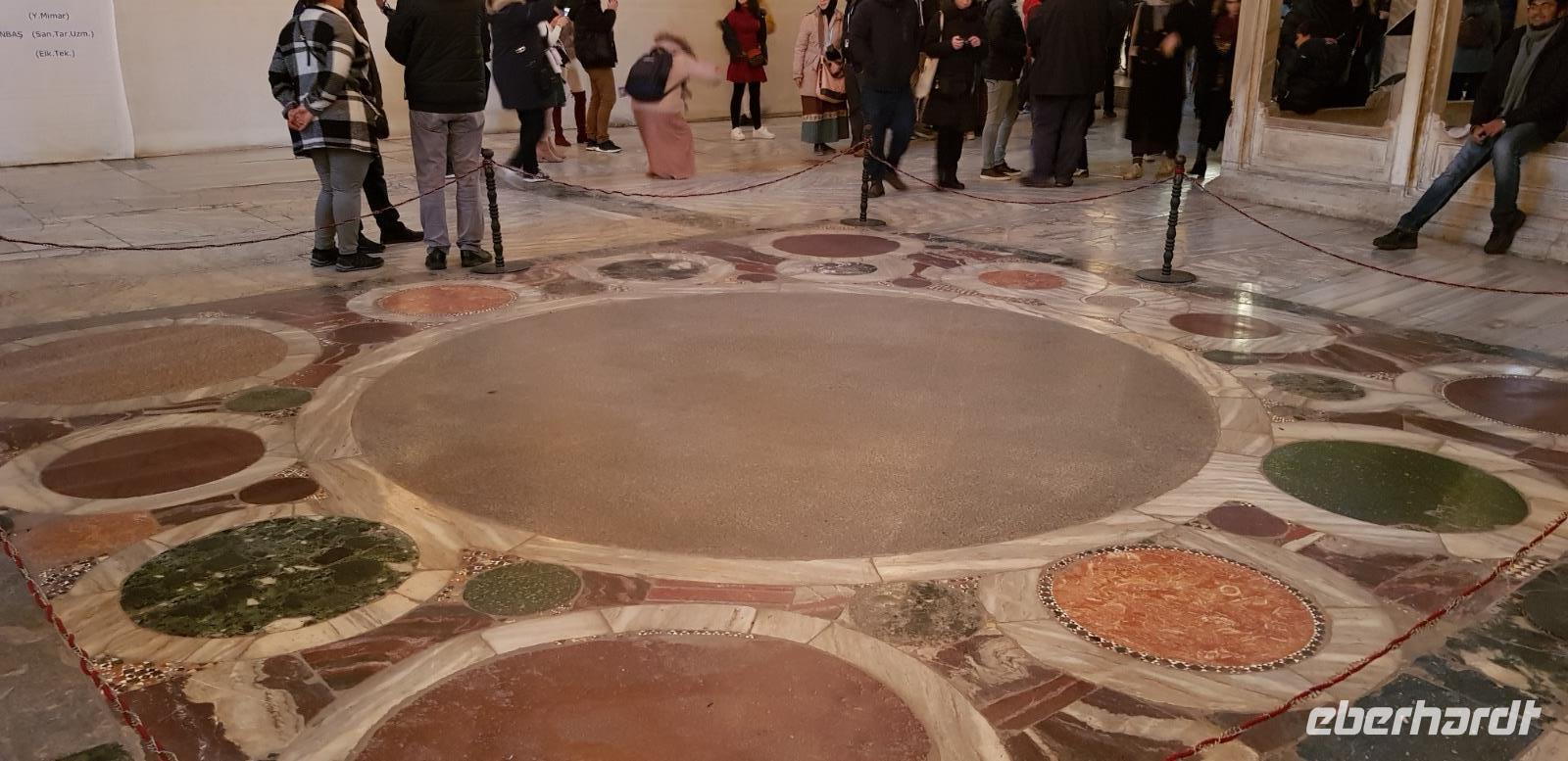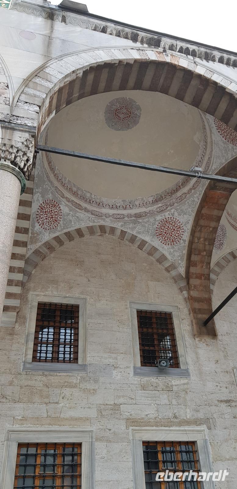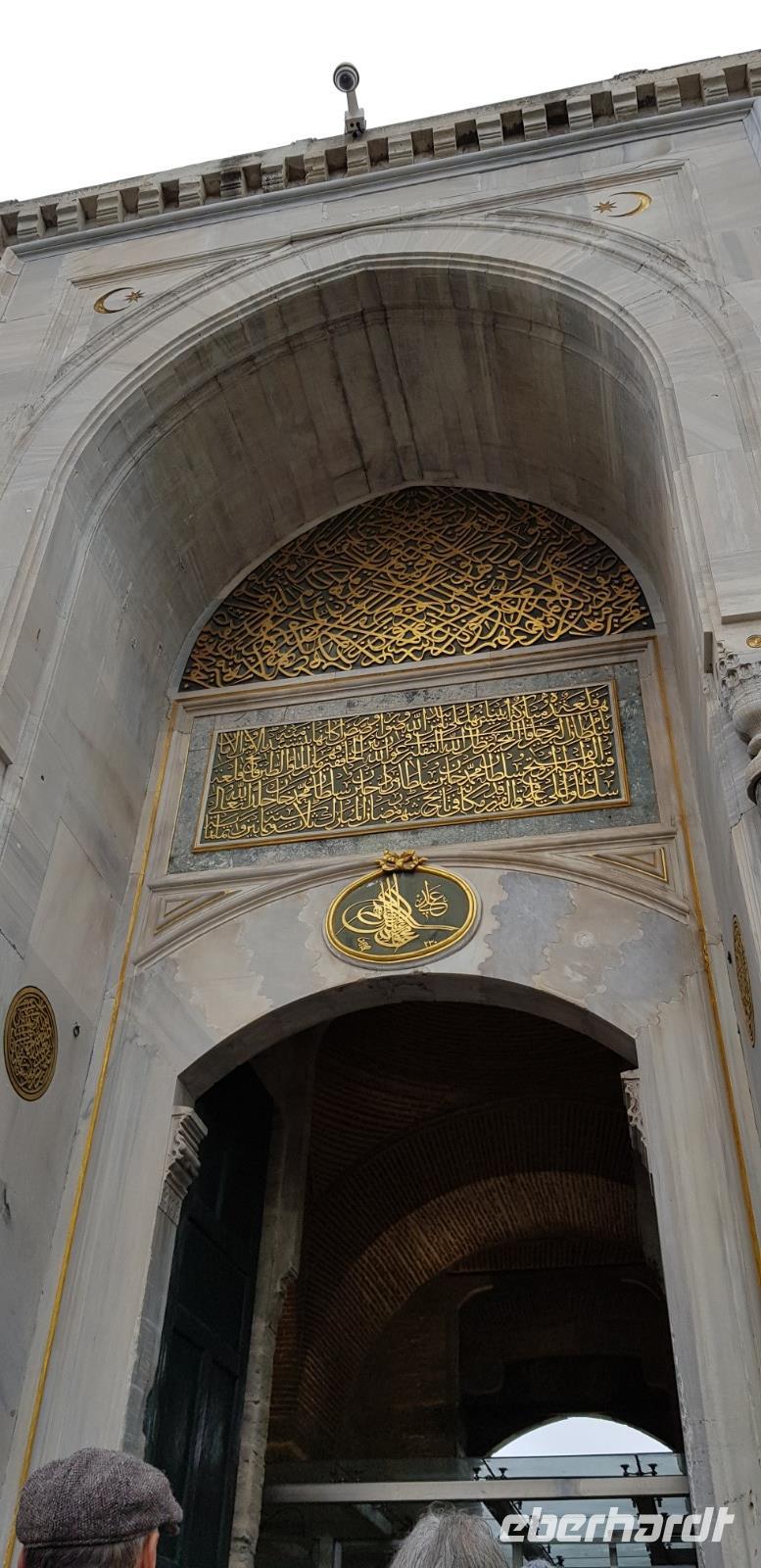 Vom Hyppodrom sind es nur wenige Schritte bis zur Sultan Ahmet Camil, die wegen der blauen Kacheln im Inneren auch Blaue Moschee genannt wird. In der Moschee müssen die Frauen ein Kopftuch tragen, eine Mütze ist auch erlaubt. Wir betreten die Moschee durch einen Seiteneingang. Alle Besucher müssen die Schuhe ausziehen. Serdar erklärt uns das Innere der Moschee. Dann kann sich jeder noch für sich umschauen.