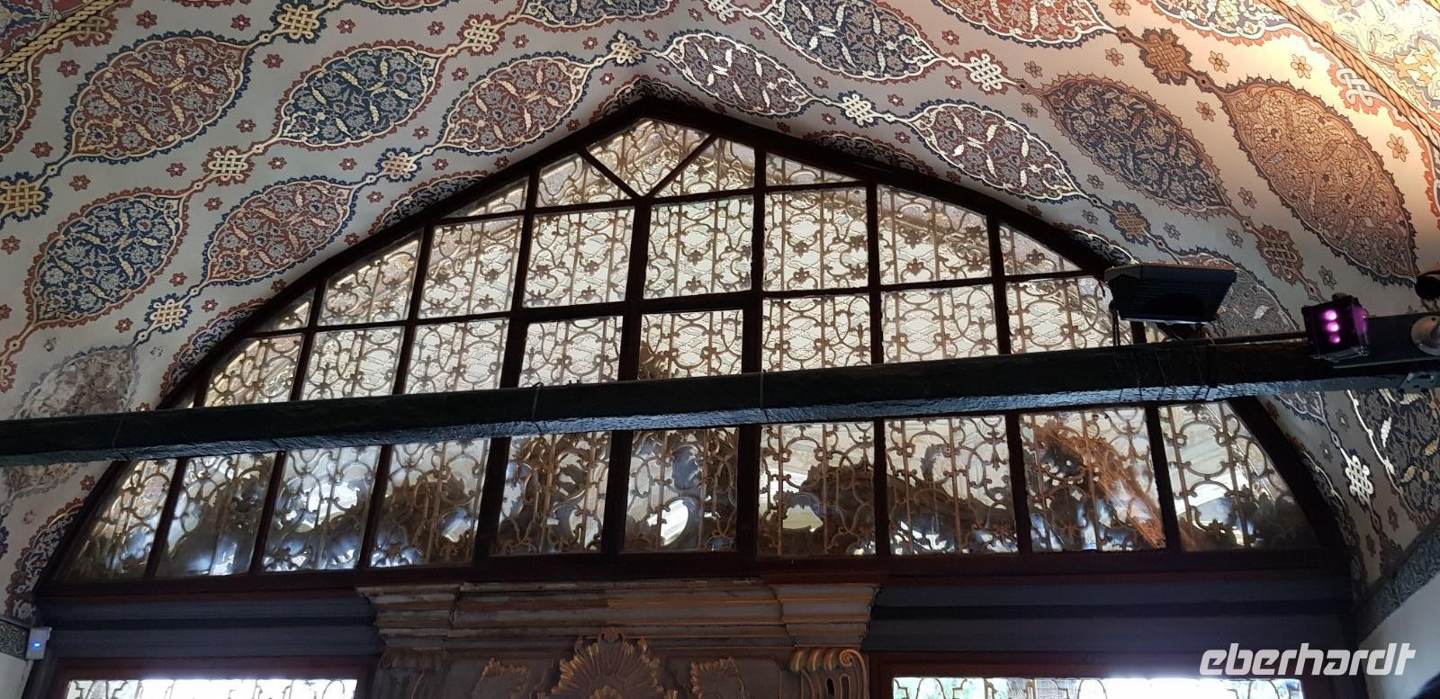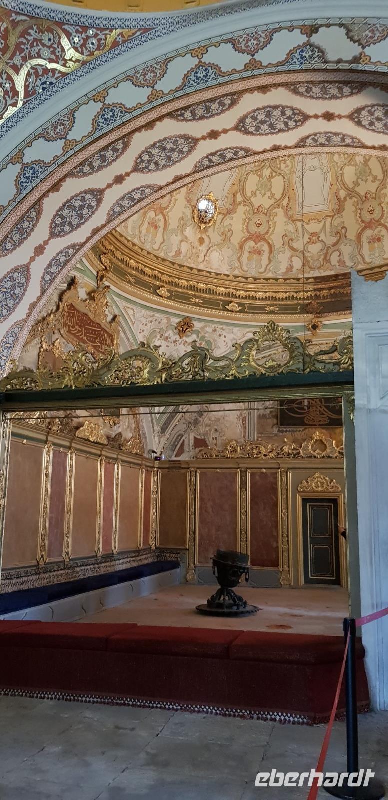 Der Topkapi Palast, heute Museum, war das politische und geistliche Machtzentrum im osmanischen Reich. Hier lebten vier Jahrhunderte lang die Sultane und ihre Haremsfamilien. Das Arial des Topkapi Palastes ist riesengroß. Es umfasst vier Höfe, in denen sich die einzelnen Gebäude befinden. Diese sind ein- oder zweistöckig und beeindrucken durch ihre wundervolle Architektur. So befinden sich im zweiten Hof die Geschäftsräume des Sultans, die Räume, in denen das Kabinett tagte. Hier werden zur Zeit auch Ausstellungsstücke aus dem dritten Hof , weil die Gebäude restauriert werden. Die riesige Küche schließt sich an. Da wurde für mehrere tausend Menschen gekocht. Die Ausstellung umfasst eine riesige Porzellan- und Küchenwerkzeugesammlung. Auf der anderen Seite des zweiten Hofes schließt sich der private Bereich des Sultans, der Harem an. Diesen Bereich durften nur der Sultan und seine Söhne betreten. Herscherin im Harem war die Mutter des Sultans (Valide Sultan). Im dritten Hof befinden sich das Audienzgebäude des Sultans mit dem Thron und die Gebäude, in denen die religiösen Schätze gezeigt werden. Und dann ist da noch der vierte Hof, eigentlich ein großer Garten mit einigen Pavillons, die der Entspannung des Sultans dienten. In einem Teil des Gartens befindet sich heute ein Cafè für die Touristen. Von hier aus eröffnet sich uns ein faszinierender Blick auf die Einfahrt in den Bosporus, das Genueseviertel und auf den asiatischen Teil Istanbuls. Eine Pause bei einem Kaffee und einer kleinen Leckerei sind nach den umfangreichen Besichtigungen willkommen.