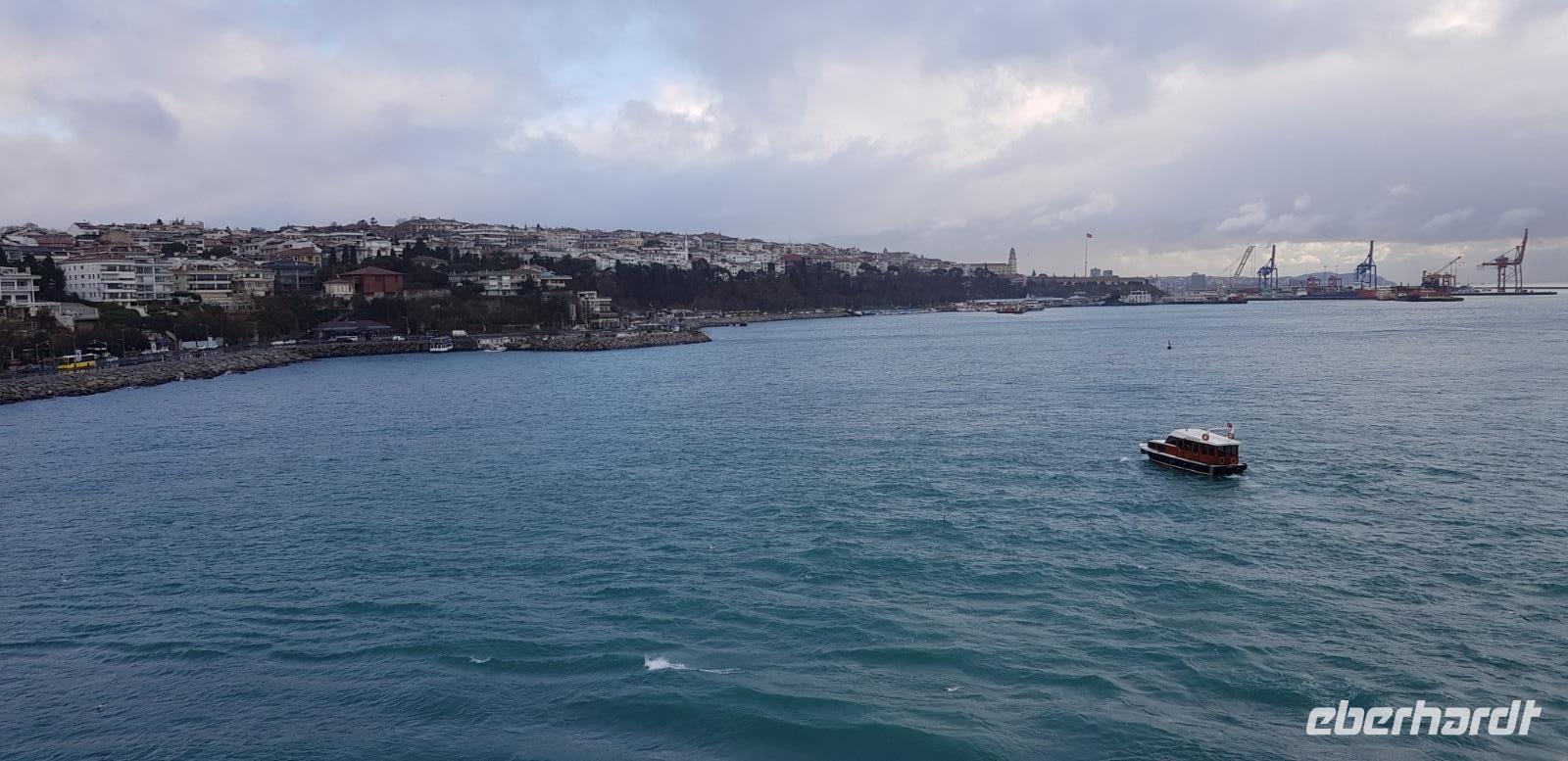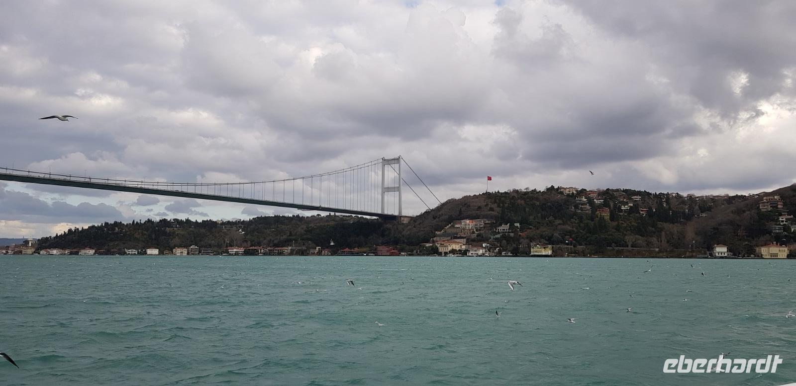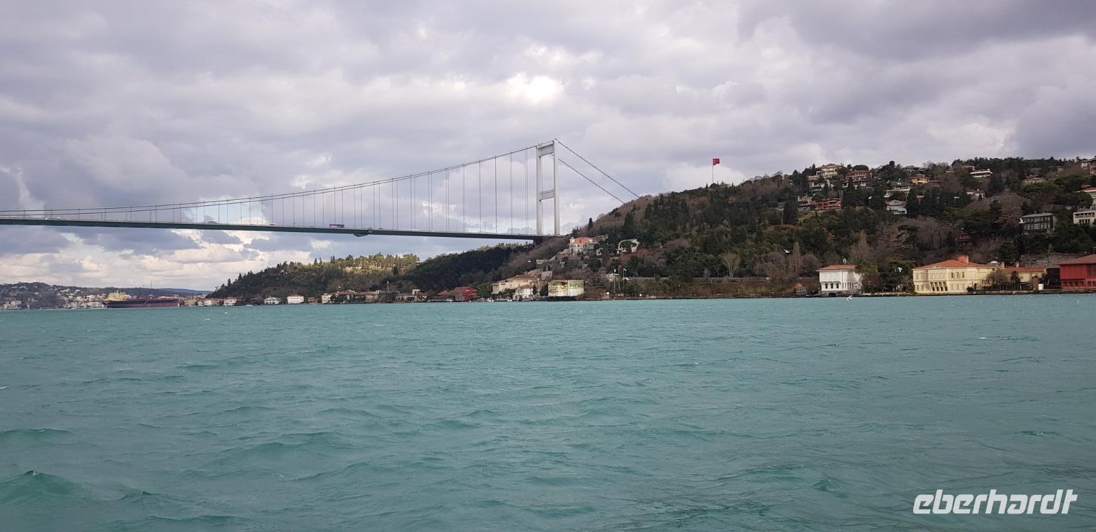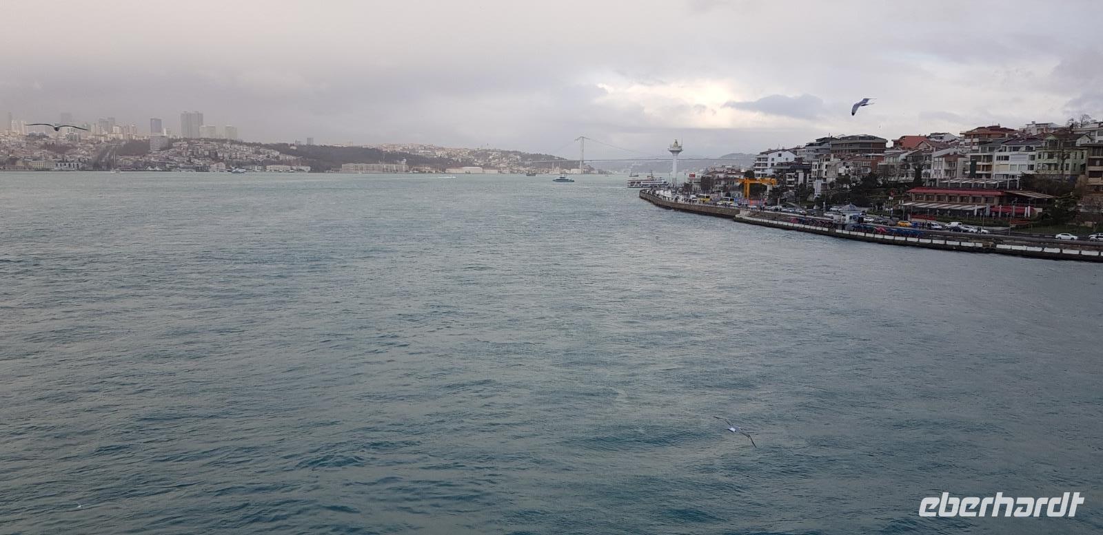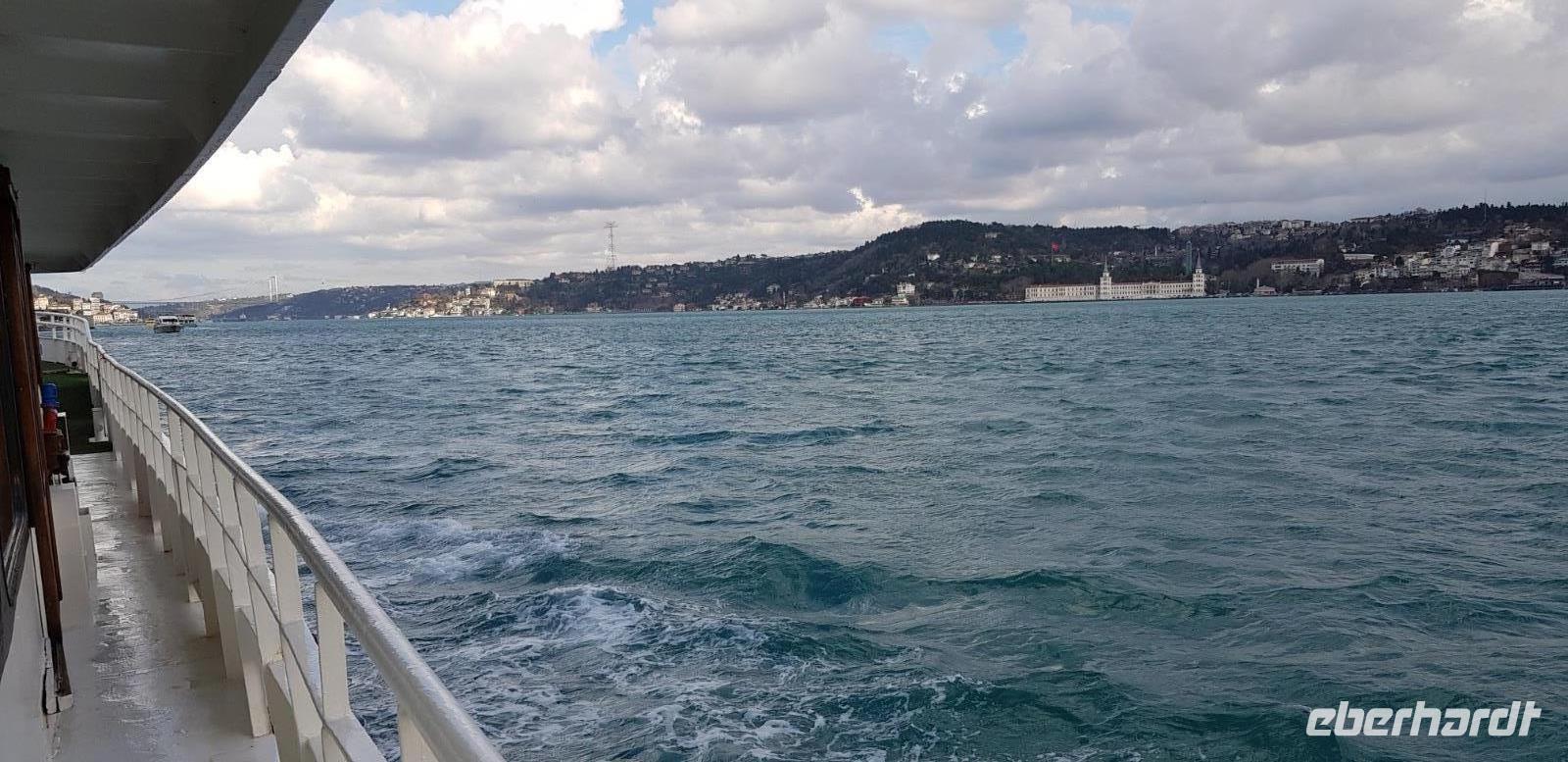 Dann treffen wir unseren Bus, der uns zur Anlegestelle unseres Bootes für die Bosporus Bootsfahrt bringt. Und schon geht es los. Wir sind heute die einzigen Gäste auf dem Boot. Wir legen ab und starten zu unserer Bootsfahrt. Inzwischen haben sich die Wolken etwas verzogen und die Sonne scheint auch mal. So sieht alles noch viel schöner aus. Wir sehen vom Bosporus aus moderne Architektur, historische Sehenswürdigkeiten, schicke Villen und Ferienhäuser, Fischerdörfer und die grünen Uferhänge. Sie sind jetzt zu dieser Jahreszeit etwas weniger grün, wir können ihre volle Schönheit aber ahnen. Und Serdar gibt uns über das Bordmikrofon die entsprechenden Erläuterungen dazu - einfach Spitze. Und wir fahren unter mehreren Brücken, die sich über den Bosporus spannen, hindurch. Kurz vor der neuesten Brücke wendet unser Boot und wir fahren zu unserem Anleger kurz hinter der Galata Brücke zurück. In wenigen Minuten kommt unser Bus und holt uns ab.