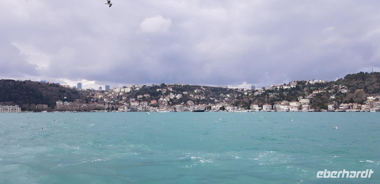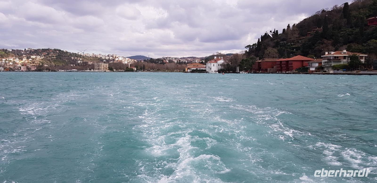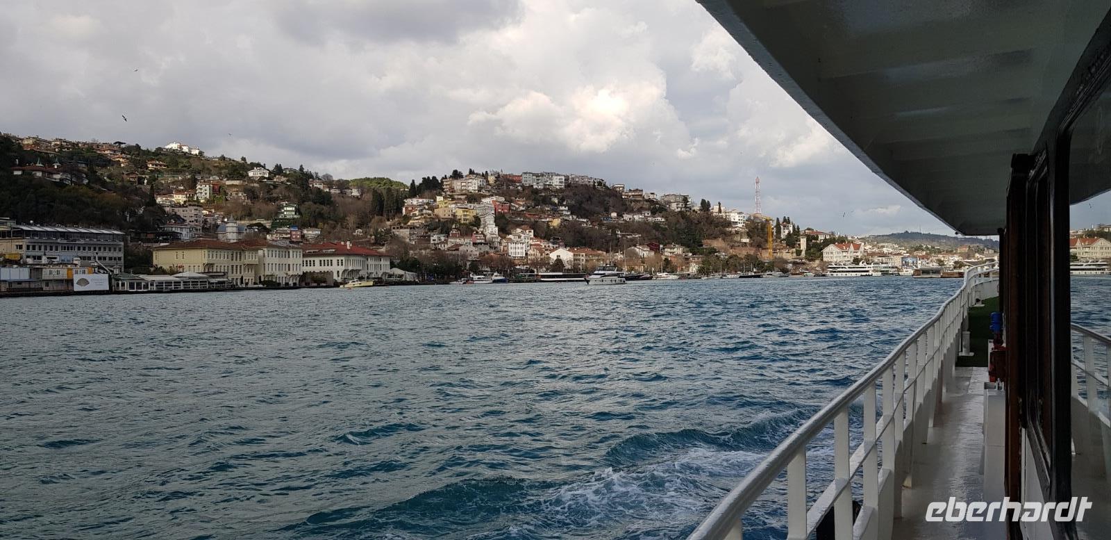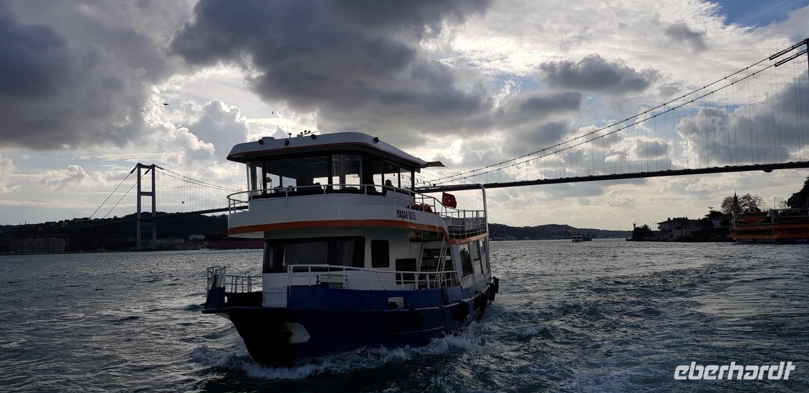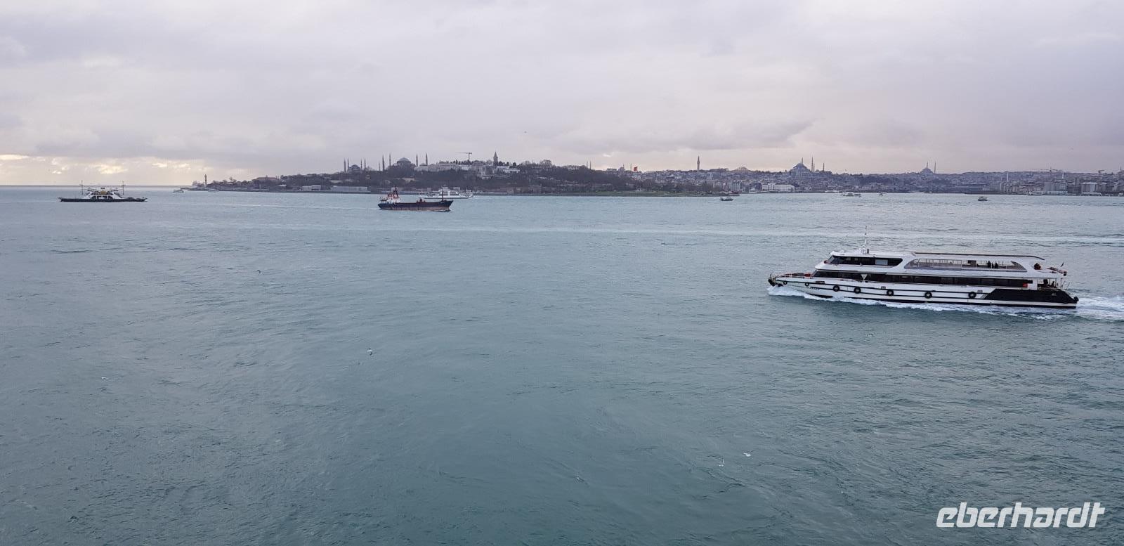 Dann treffen wir unseren Bus, der uns zur Anlegestelle unseres Bootes für die Bosporus Bootsfahrt bringt. Und schon geht es los. Wir sind heute die einzigen Gäste auf dem Boot. Wir legen ab und starten zu unserer Bootsfahrt. Inzwischen haben sich die Wolken etwas verzogen und die Sonne scheint auch mal. So sieht alles noch viel schöner aus. Wir sehen vom Bosporus aus moderne Architektur, historische Sehenswürdigkeiten, schicke Villen und Ferienhäuser, Fischerdörfer und die grünen Uferhänge. Sie sind jetzt zu dieser Jahreszeit etwas weniger grün, wir können ihre volle Schönheit aber ahnen. Und Serdar gibt uns über das Bordmikrofon die entsprechenden Erläuterungen dazu - einfach Spitze. Und wir fahren unter mehreren Brücken, die sich über den Bosporus spannen, hindurch. Kurz vor der neuesten Brücke wendet unser Boot und wir fahren zu unserem Anleger kurz hinter der Galata Brücke zurück. In wenigen Minuten kommt unser Bus und holt uns ab.