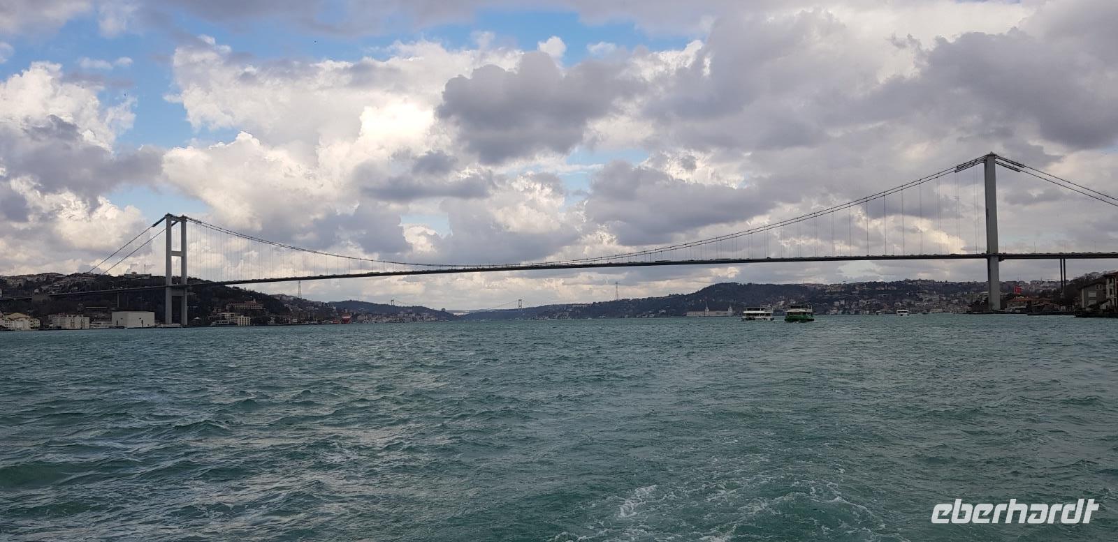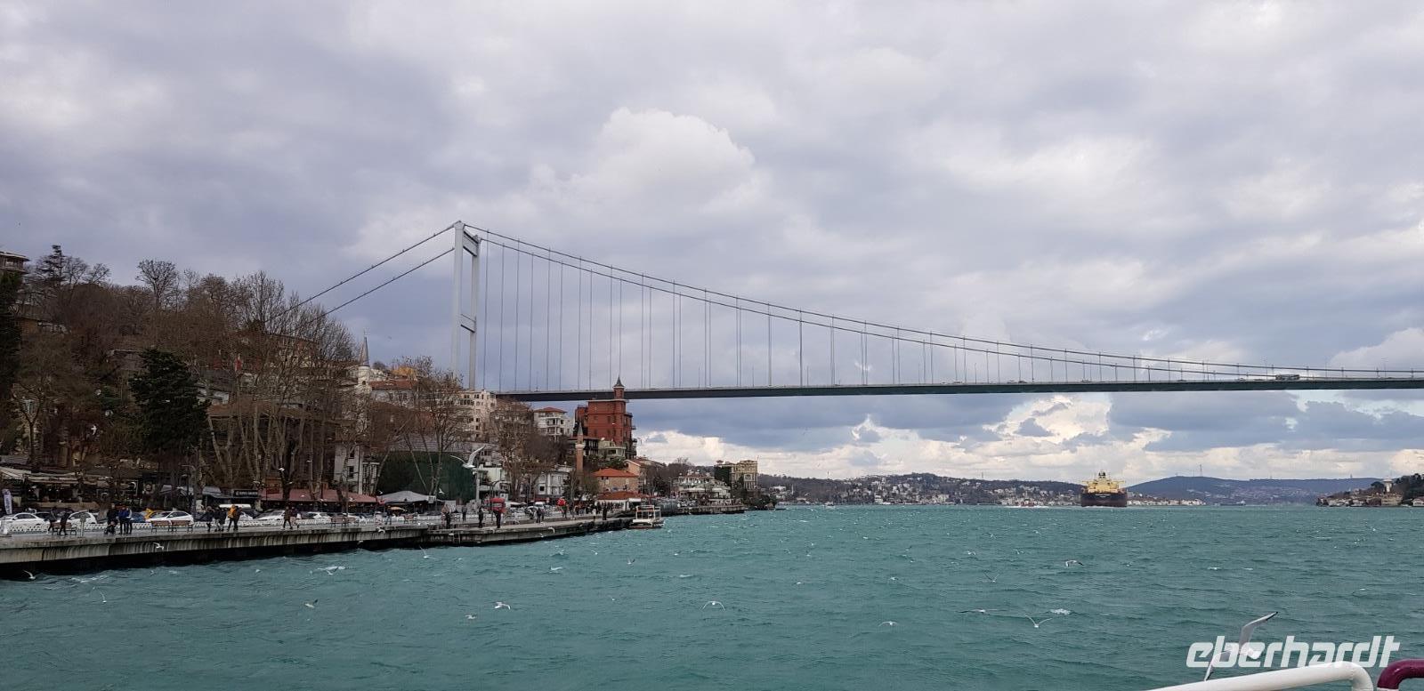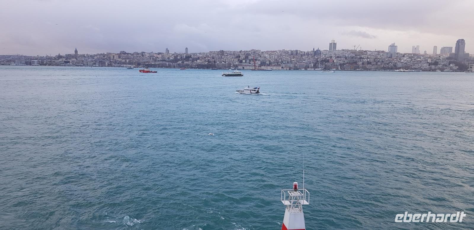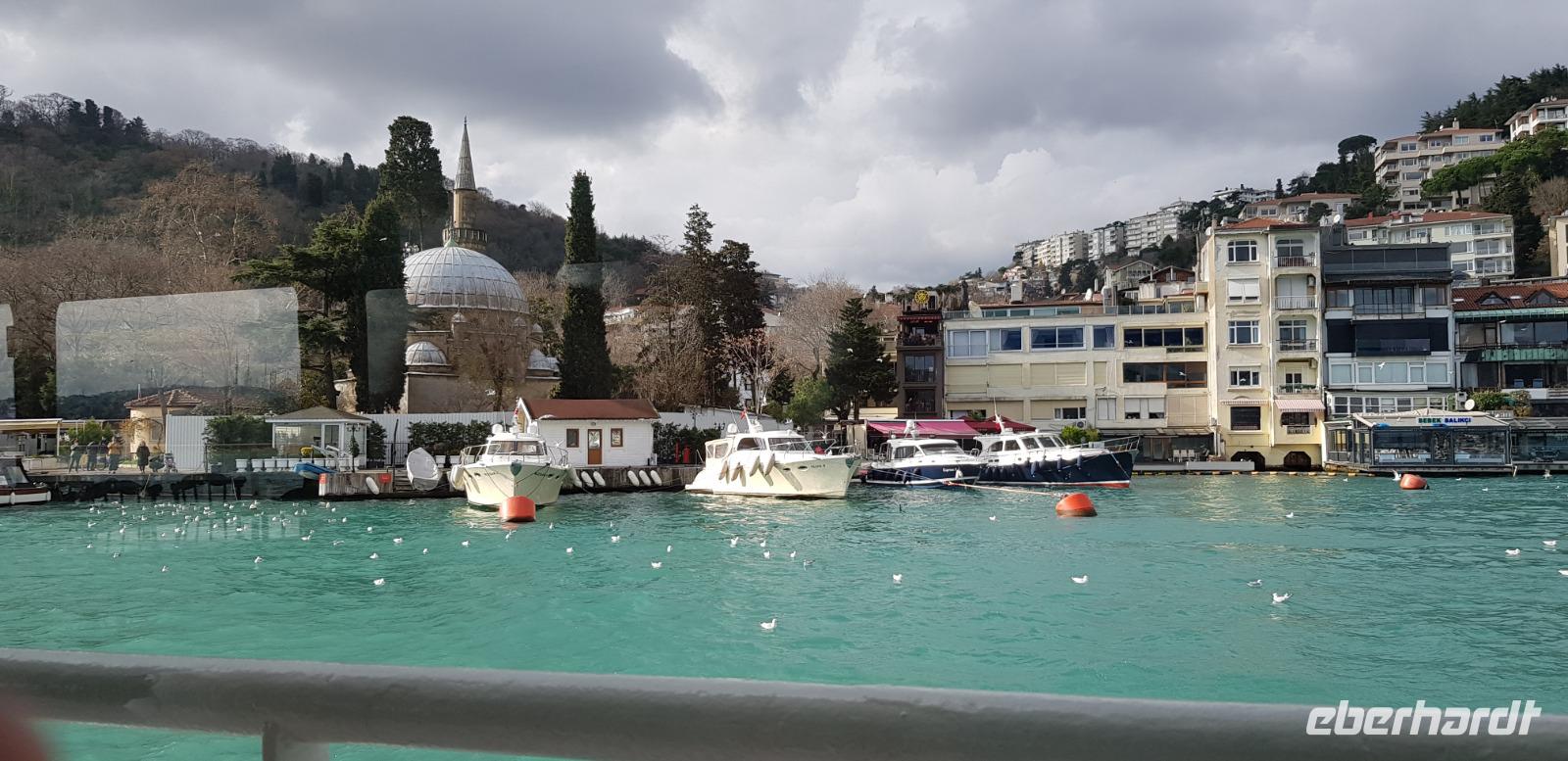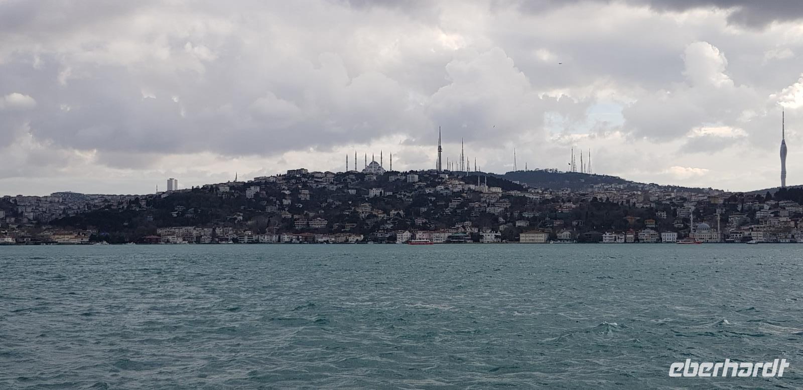 Dann treffen wir unseren Bus, der uns zur Anlegestelle unseres Bootes für die Bosporus Bootsfahrt bringt. Und schon geht es los. Wir sind heute die einzigen Gäste auf dem Boot. Wir legen ab und starten zu unserer Bootsfahrt. Inzwischen haben sich die Wolken etwas verzogen und die Sonne scheint auch mal. So sieht alles noch viel schöner aus. Wir sehen vom Bosporus aus moderne Architektur, historische Sehenswürdigkeiten, schicke Villen und Ferienhäuser, Fischerdörfer und die grünen Uferhänge. Sie sind jetzt zu dieser Jahreszeit etwas weniger grün, wir können ihre volle Schönheit aber ahnen. Und Serdar gibt uns über das Bordmikrofon die entsprechenden Erläuterungen dazu - einfach Spitze. Und wir fahren unter mehreren Brücken, die sich über den Bosporus spannen, hindurch. Kurz vor der neuesten Brücke wendet unser Boot und wir fahren zu unserem Anleger kurz hinter der Galata Brücke zurück. In wenigen Minuten kommt unser Bus und holt uns ab.