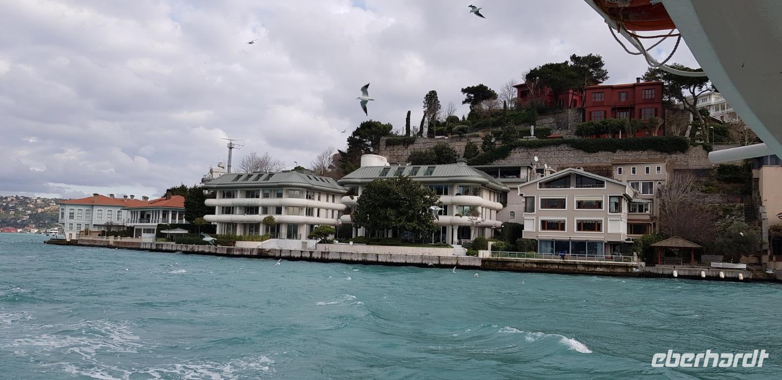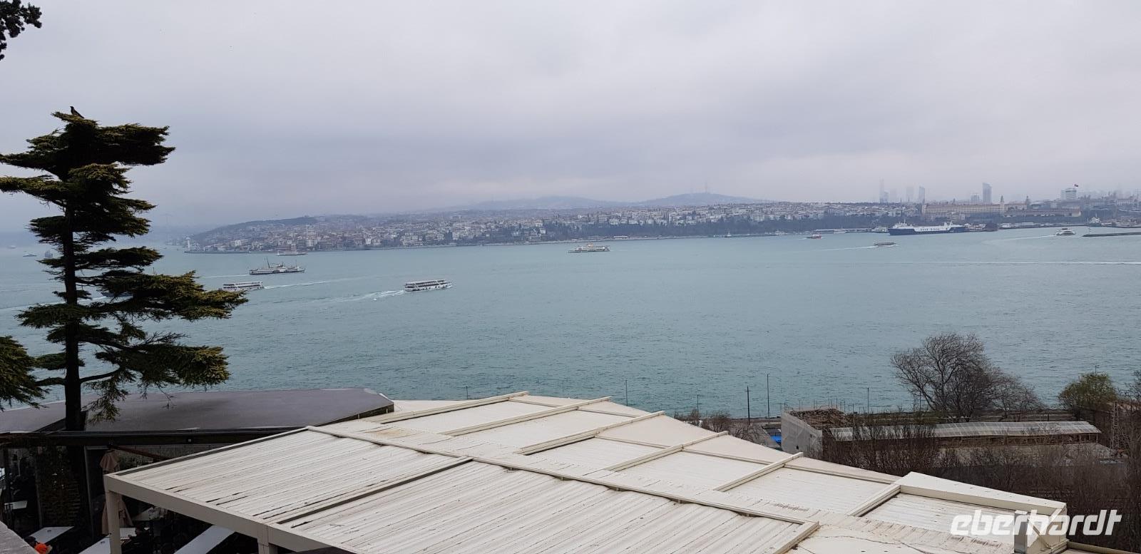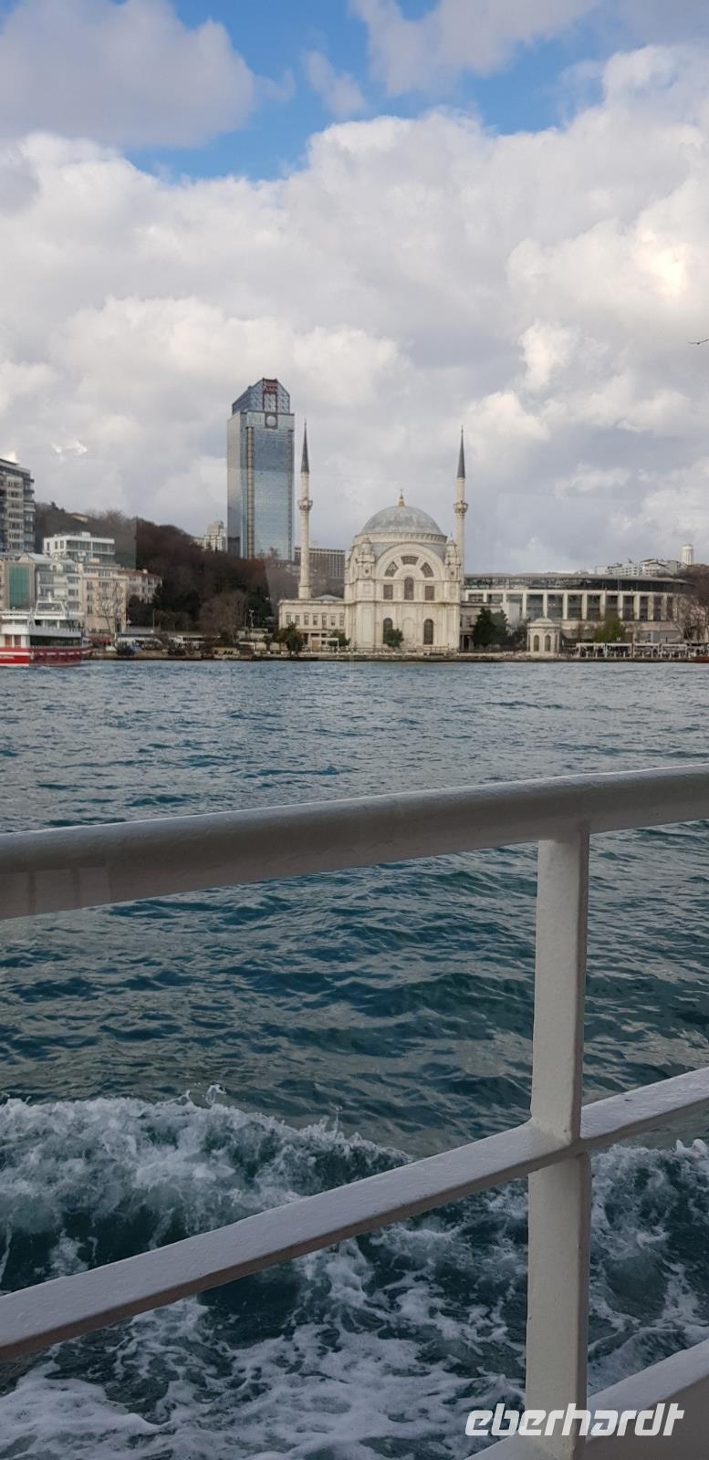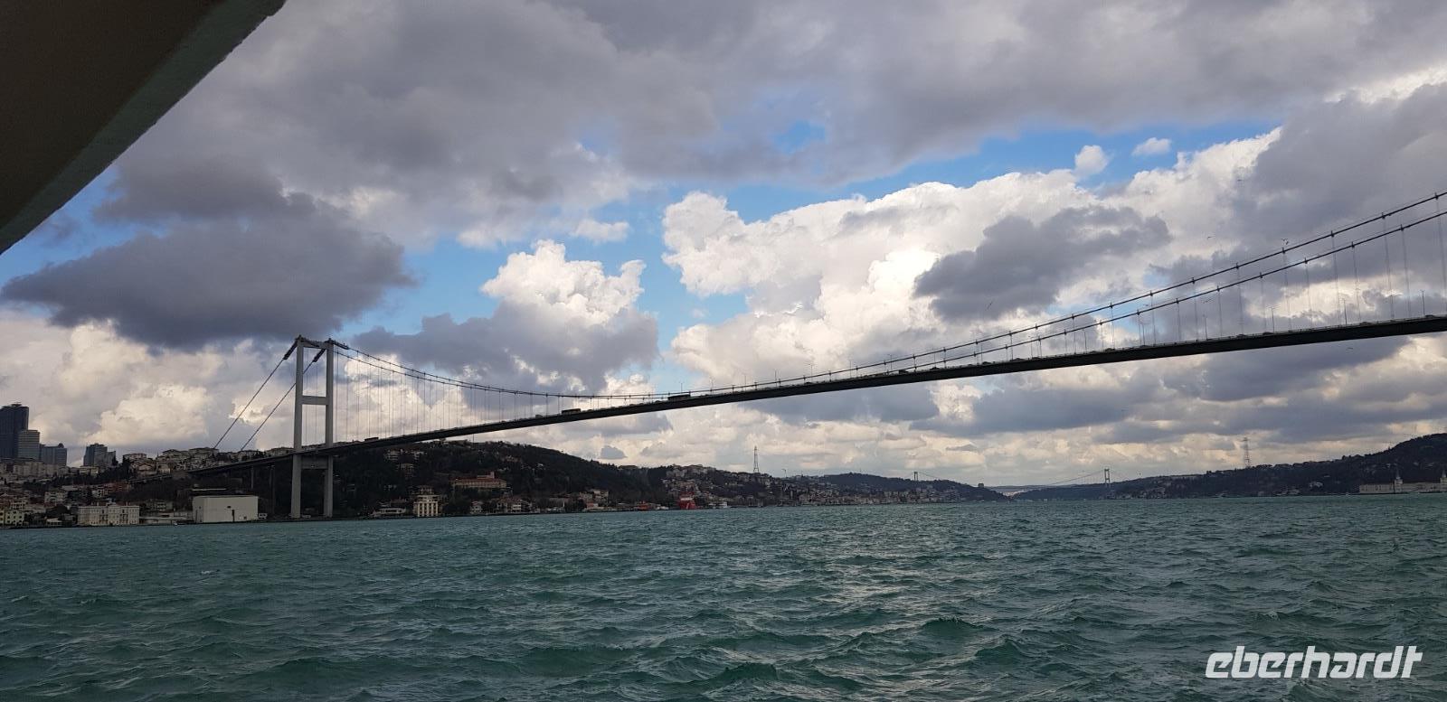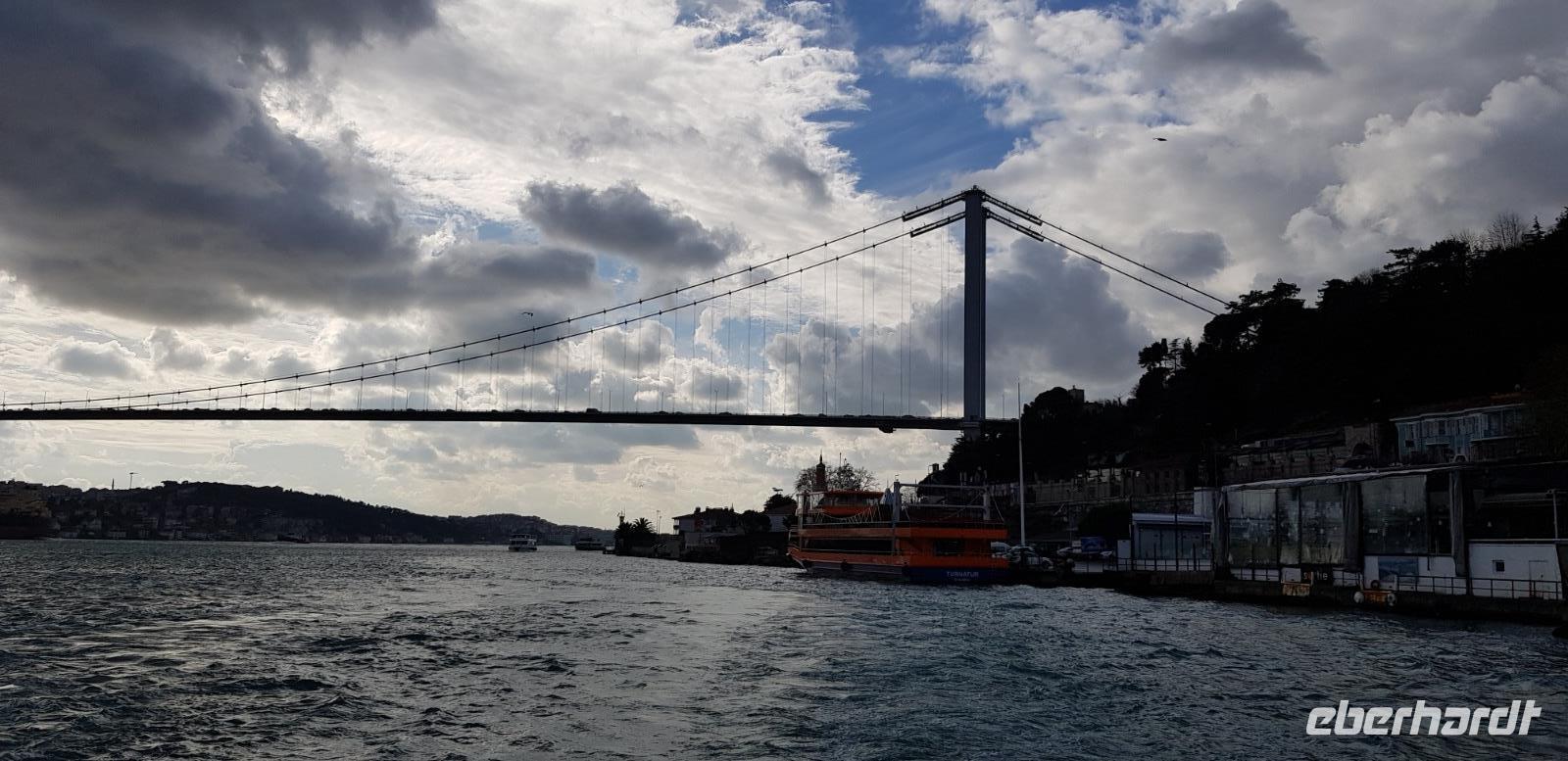 Dann treffen wir unseren Bus, der uns zur Anlegestelle unseres Bootes für die Bosporus Bootsfahrt bringt. Und schon geht es los. Wir sind heute die einzigen Gäste auf dem Boot. Wir legen ab und starten zu unserer Bootsfahrt. Inzwischen haben sich die Wolken etwas verzogen und die Sonne scheint auch mal. So sieht alles noch viel schöner aus. Wir sehen vom Bosporus aus moderne Architektur, historische Sehenswürdigkeiten, schicke Villen und Ferienhäuser, Fischerdörfer und die grünen Uferhänge. Sie sind jetzt zu dieser Jahreszeit etwas weniger grün, wir können ihre volle Schönheit aber ahnen. Und Serdar gibt uns über das Bordmikrofon die entsprechenden Erläuterungen dazu - einfach Spitze. Und wir fahren unter mehreren Brücken, die sich über den Bosporus spannen, hindurch. Kurz vor der neuesten Brücke wendet unser Boot und wir fahren zu unserem Anleger kurz hinter der Galata Brücke zurück. In wenigen Minuten kommt unser Bus und holt uns ab.
