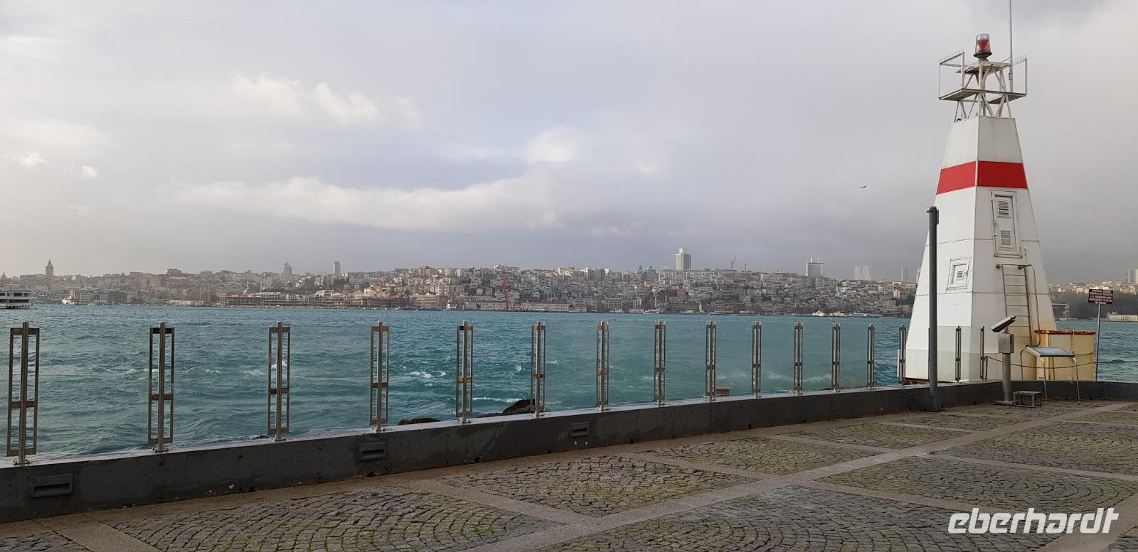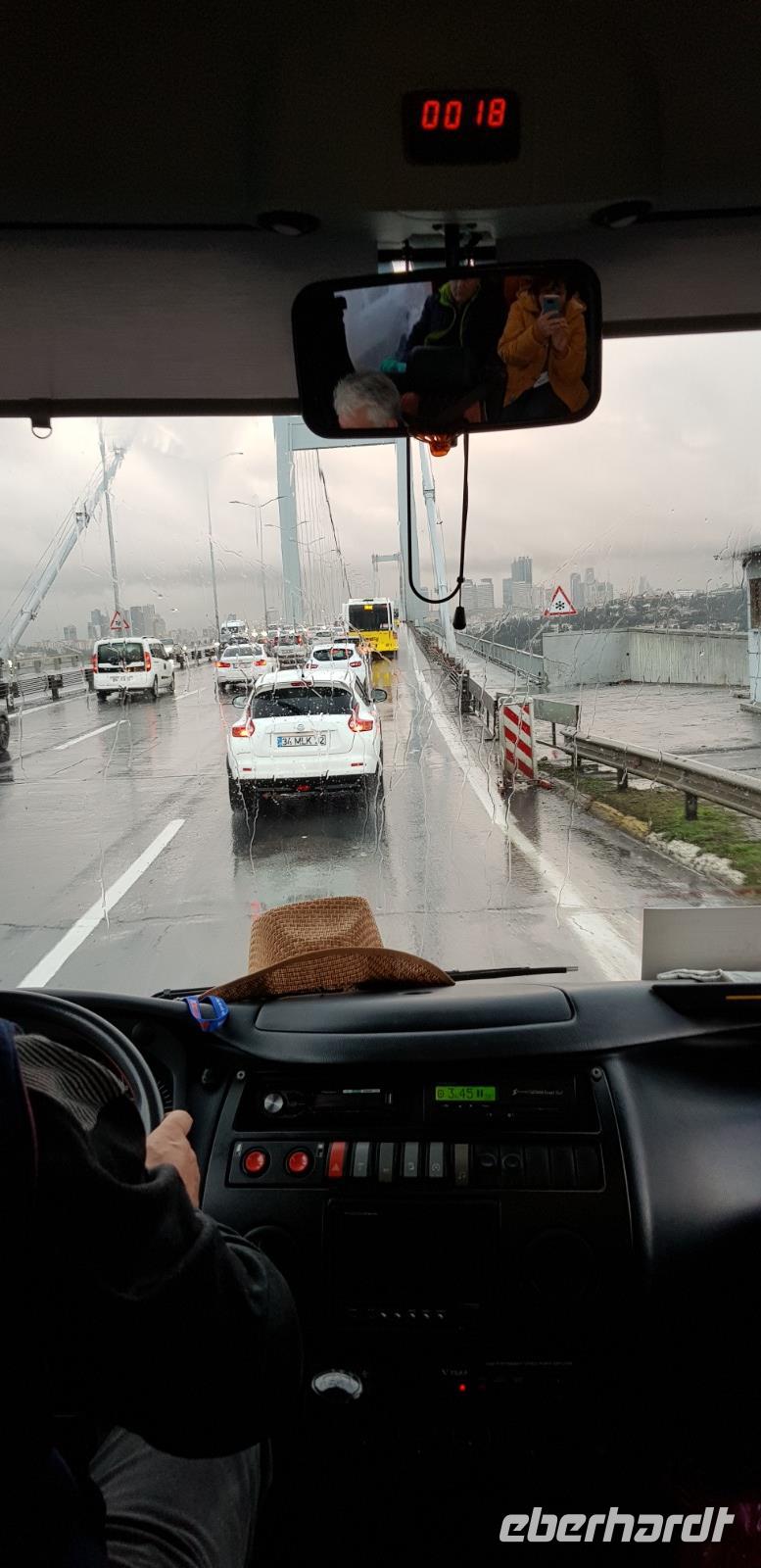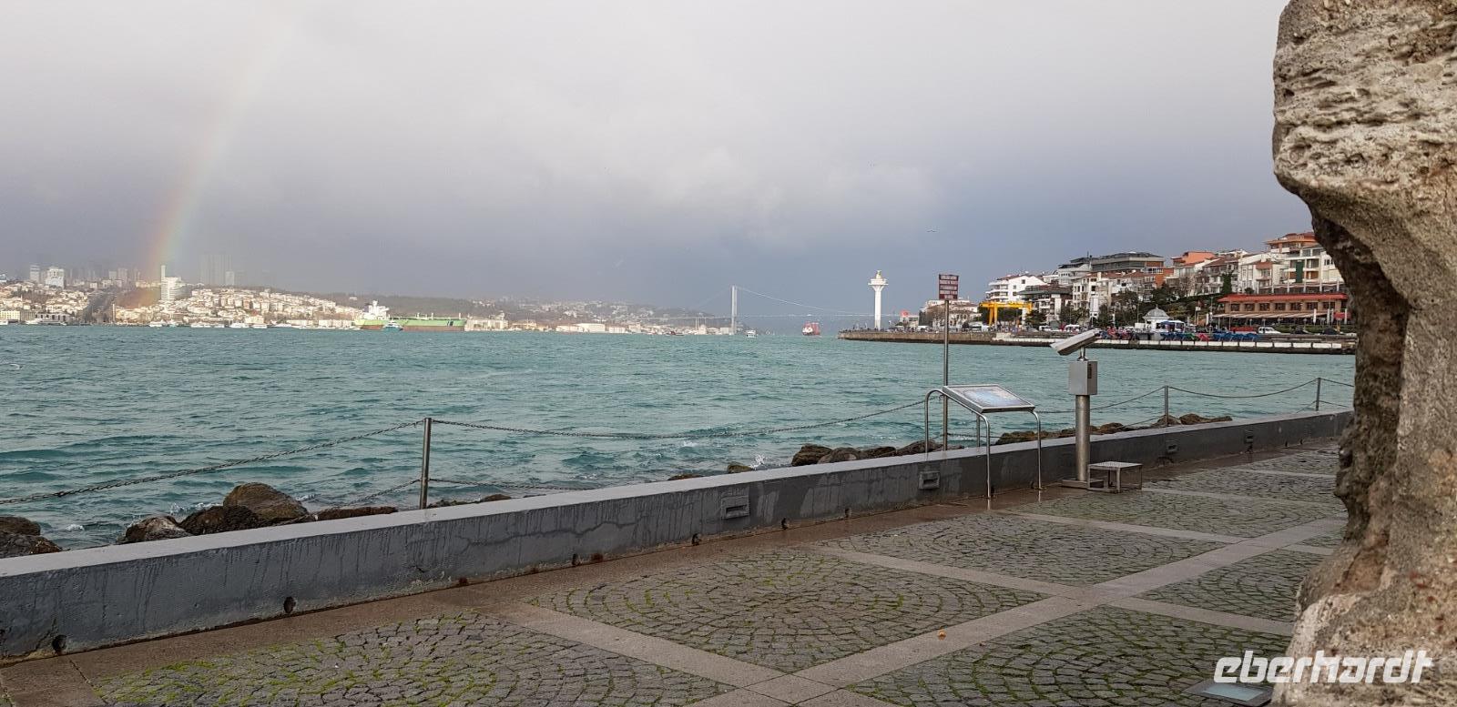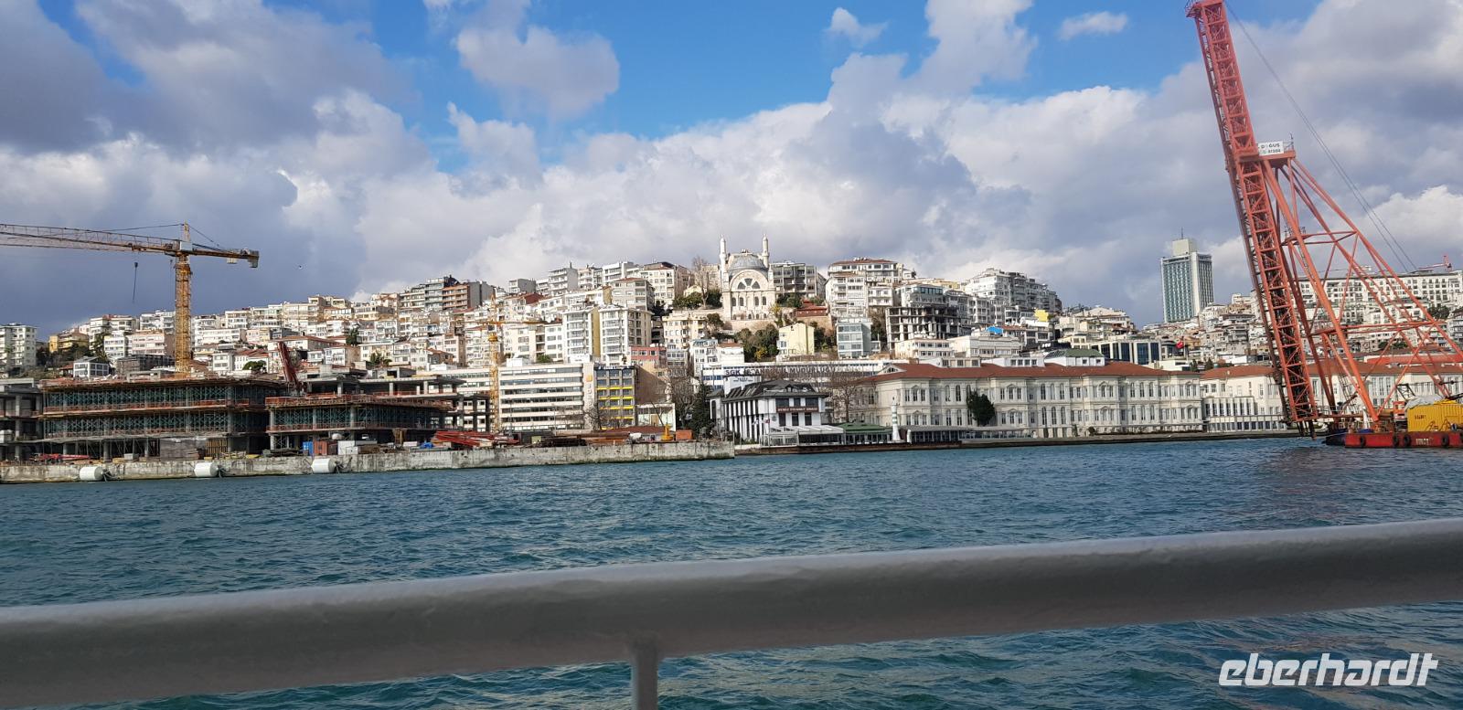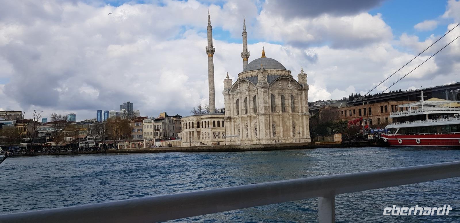 Dann treffen wir unseren Bus, der uns zur Anlegestelle unseres Bootes für die Bosporus Bootsfahrt bringt. Und schon geht es los. Wir sind heute die einzigen Gäste auf dem Boot. Wir legen ab und starten zu unserer Bootsfahrt. Inzwischen haben sich die Wolken etwas verzogen und die Sonne scheint auch mal. So sieht alles noch viel schöner aus. Wir sehen vom Bosporus aus moderne Architektur, historische Sehenswürdigkeiten, schicke Villen und Ferienhäuser, Fischerdörfer und die grünen Uferhänge. Sie sind jetzt zu dieser Jahreszeit etwas weniger grün, wir können ihre volle Schönheit aber ahnen. Und Serdar gibt uns über das Bordmikrofon die entsprechenden Erläuterungen dazu - einfach Spitze. Und wir fahren unter mehreren Brücken, die sich über den Bosporus spannen, hindurch. Kurz vor der neuesten Brücke wendet unser Boot und wir fahren zu unserem Anleger kurz hinter der Galata Brücke zurück. In wenigen Minuten kommt unser Bus und holt uns ab.