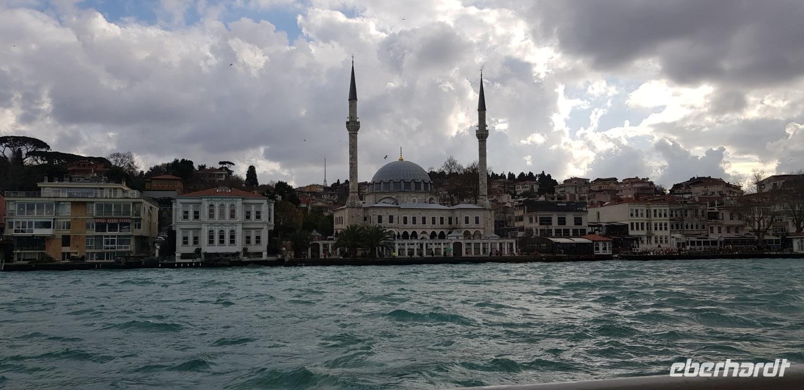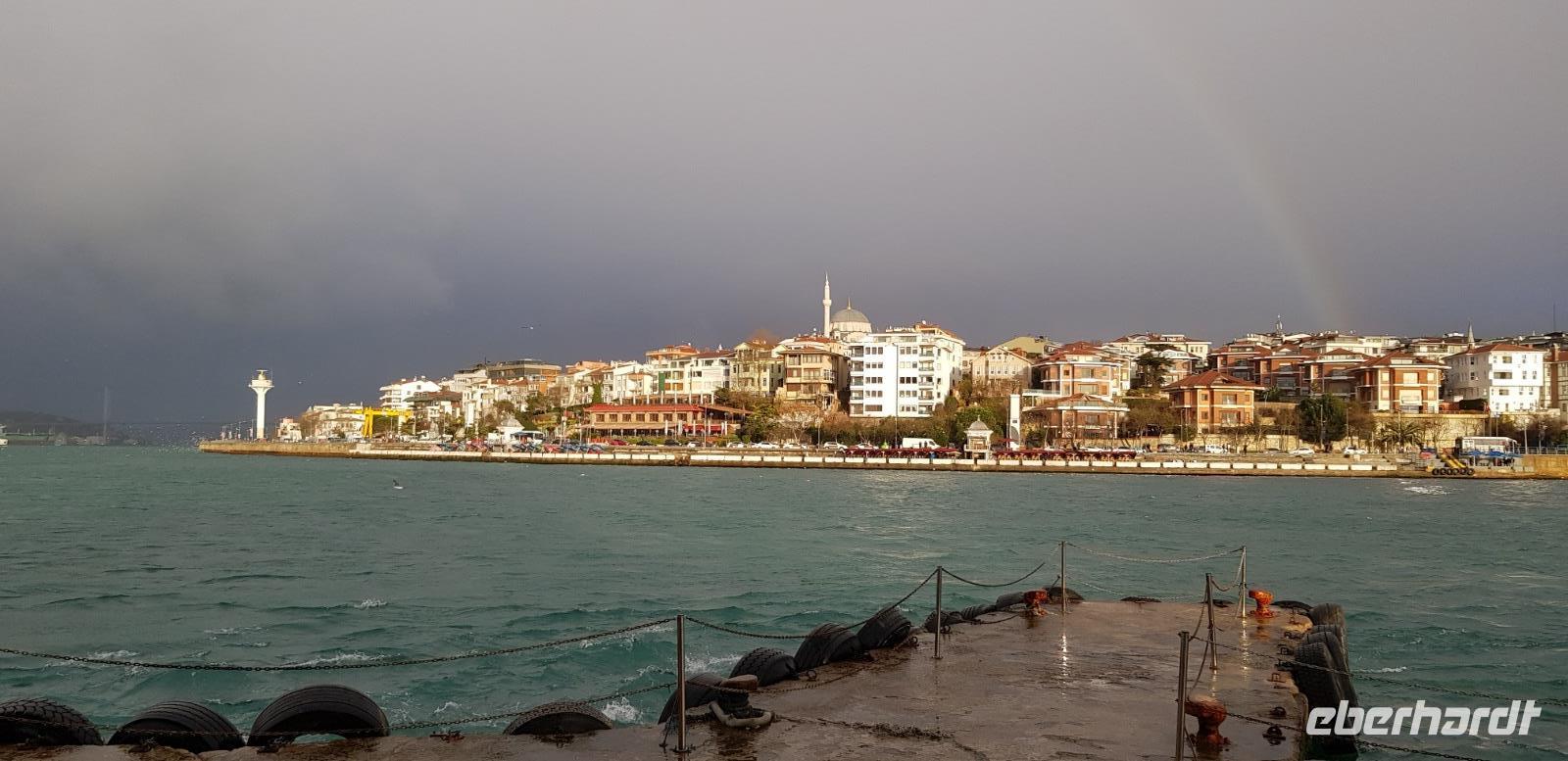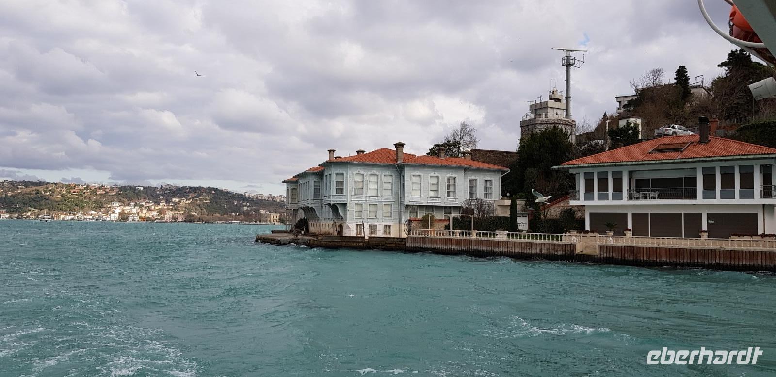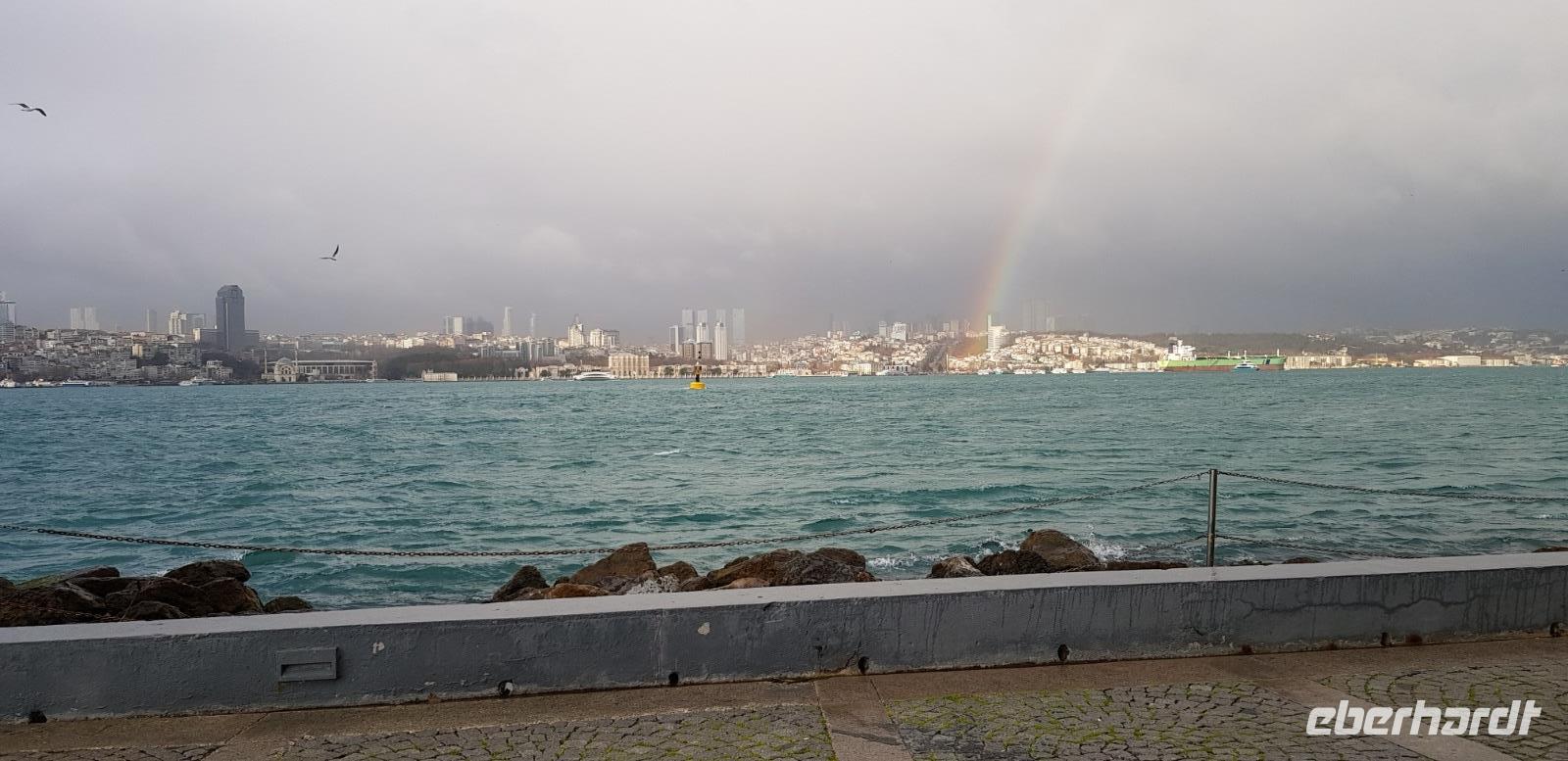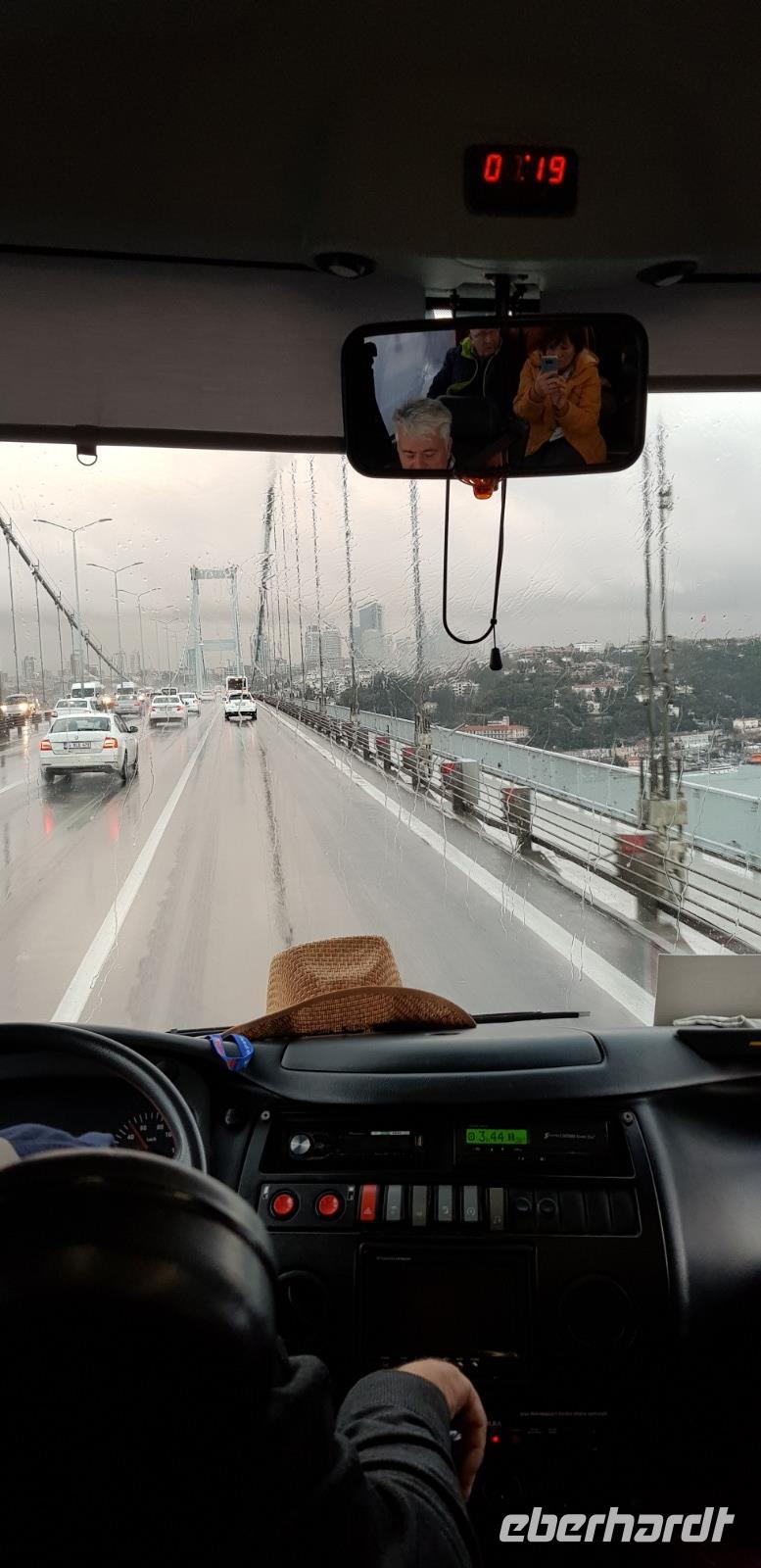 Dann treffen wir unseren Bus, der uns zur Anlegestelle unseres Bootes für die Bosporus Bootsfahrt bringt. Und schon geht es los. Wir sind heute die einzigen Gäste auf dem Boot. Wir legen ab und starten zu unserer Bootsfahrt. Inzwischen haben sich die Wolken etwas verzogen und die Sonne scheint auch mal. So sieht alles noch viel schöner aus. Wir sehen vom Bosporus aus moderne Architektur, historische Sehenswürdigkeiten, schicke Villen und Ferienhäuser, Fischerdörfer und die grünen Uferhänge. Sie sind jetzt zu dieser Jahreszeit etwas weniger grün, wir können ihre volle Schönheit aber ahnen. Und Serdar gibt uns über das Bordmikrofon die entsprechenden Erläuterungen dazu - einfach Spitze. Und wir fahren unter mehreren Brücken, die sich über den Bosporus spannen, hindurch. Kurz vor der neuesten Brücke wendet unser Boot und wir fahren zu unserem Anleger kurz hinter der Galata Brücke zurück. In wenigen Minuten kommt unser Bus und holt uns ab.