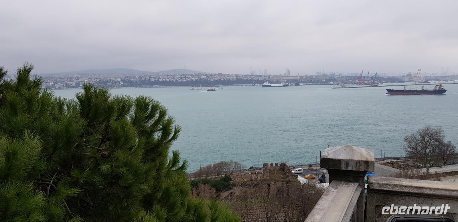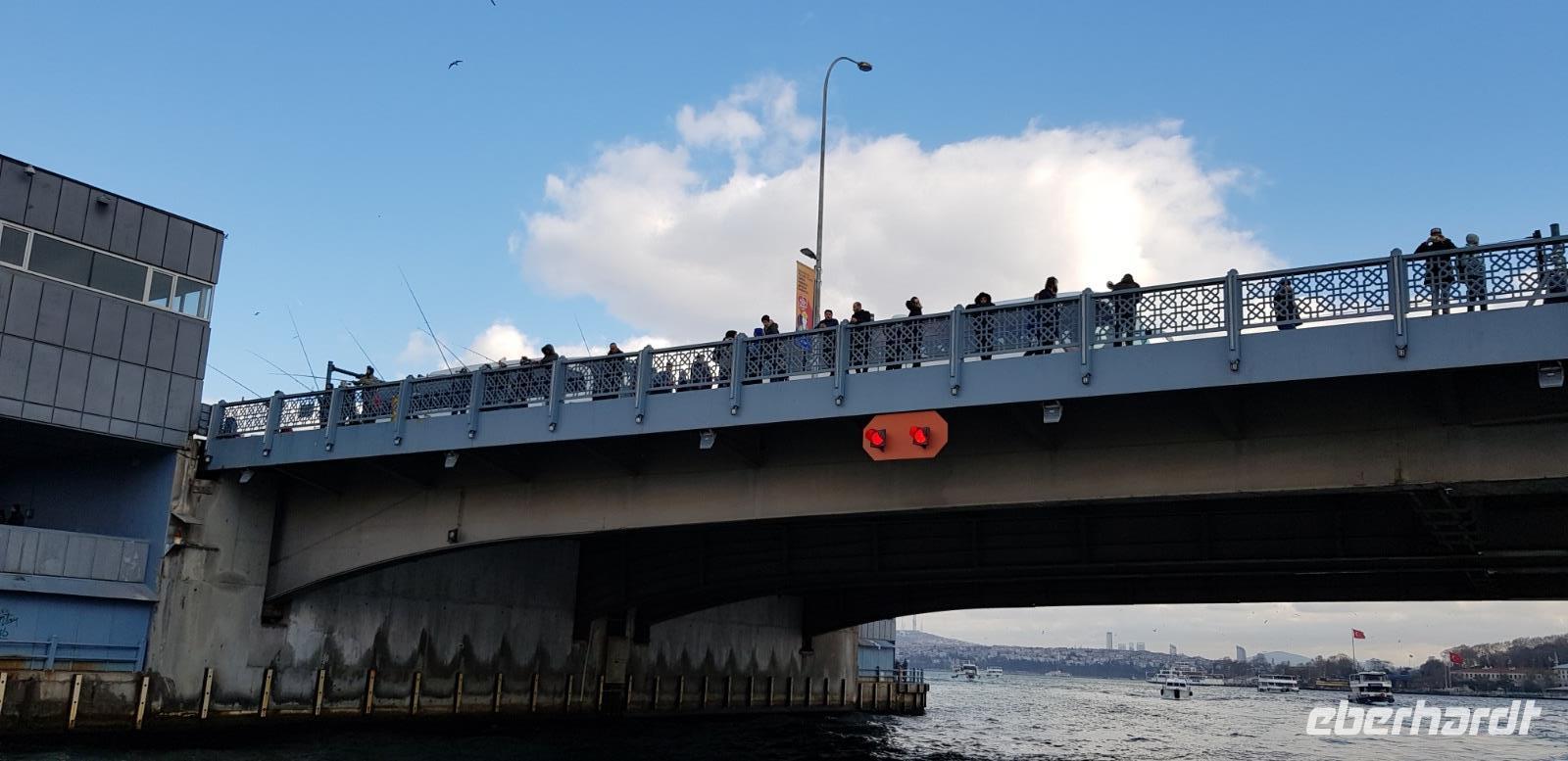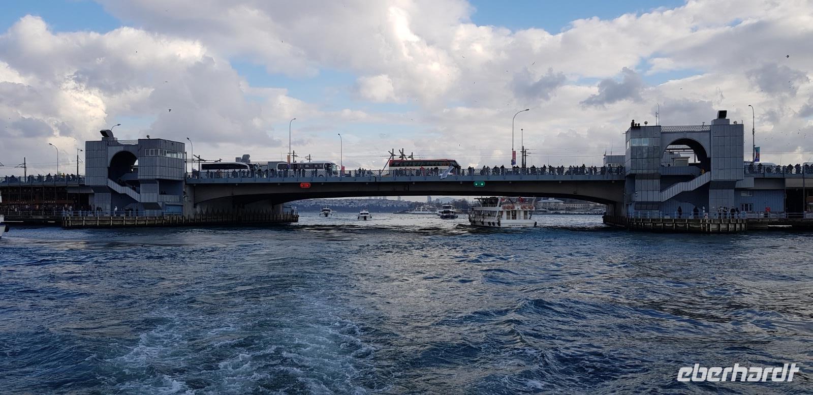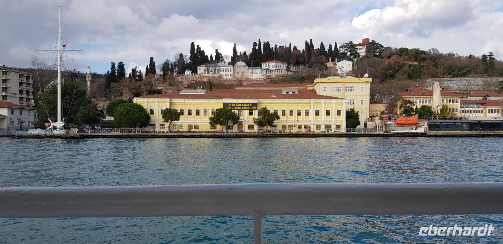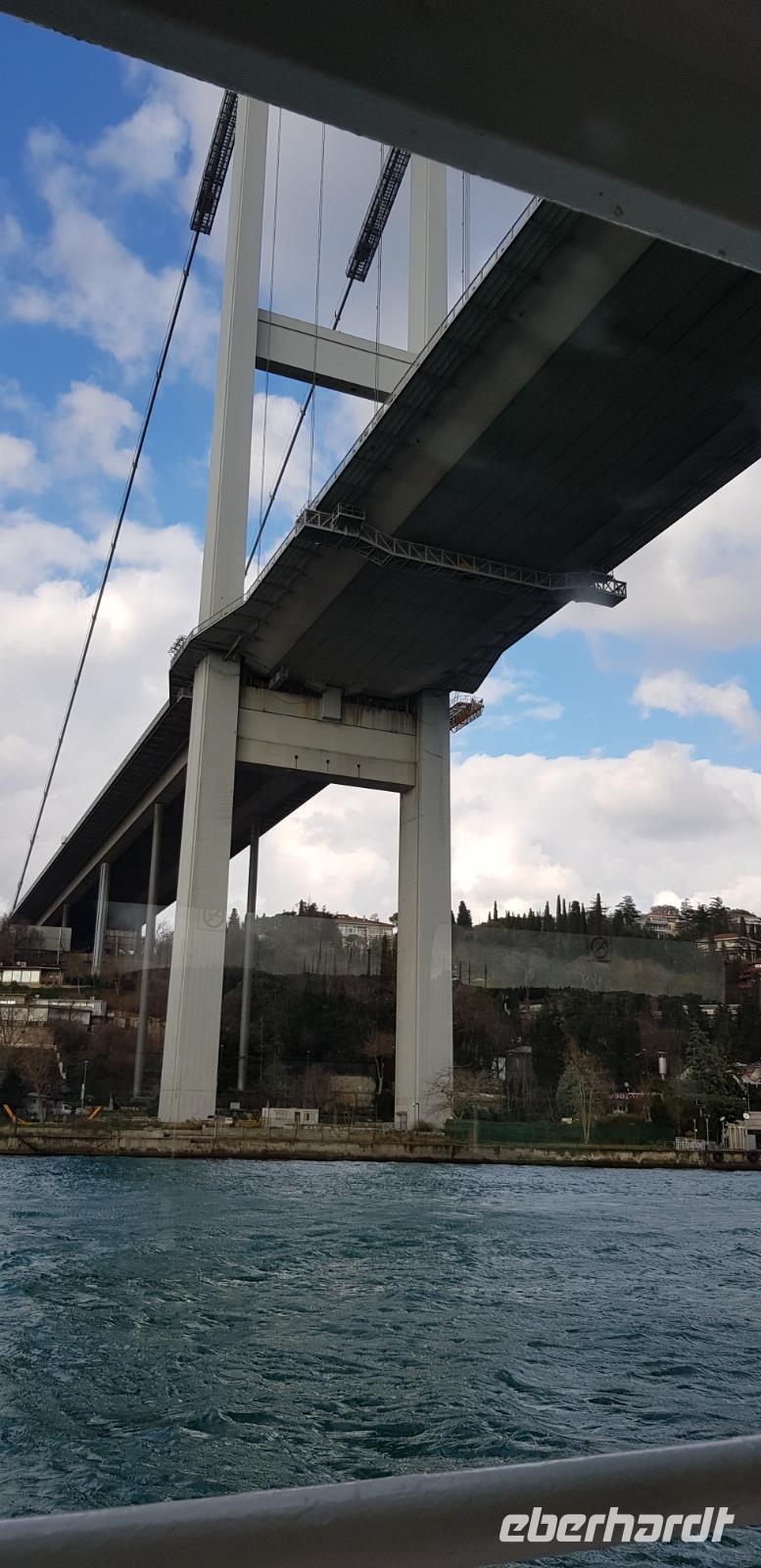 Dann treffen wir unseren Bus, der uns zur Anlegestelle unseres Bootes für die Bosporus Bootsfahrt bringt. Und schon geht es los. Wir sind heute die einzigen Gäste auf dem Boot. Wir legen ab und starten zu unserer Bootsfahrt. Inzwischen haben sich die Wolken etwas verzogen und die Sonne scheint auch mal. So sieht alles noch viel schöner aus. Wir sehen vom Bosporus aus moderne Architektur, historische Sehenswürdigkeiten, schicke Villen und Ferienhäuser, Fischerdörfer und die grünen Uferhänge. Sie sind jetzt zu dieser Jahreszeit etwas weniger grün, wir können ihre volle Schönheit aber ahnen. Und Serdar gibt uns über das Bordmikrofon die entsprechenden Erläuterungen dazu - einfach Spitze. Und wir fahren unter mehreren Brücken, die sich über den Bosporus spannen, hindurch. Kurz vor der neuesten Brücke wendet unser Boot und wir fahren zu unserem Anleger kurz hinter der Galata Brücke zurück. In wenigen Minuten kommt unser Bus und holt uns ab.