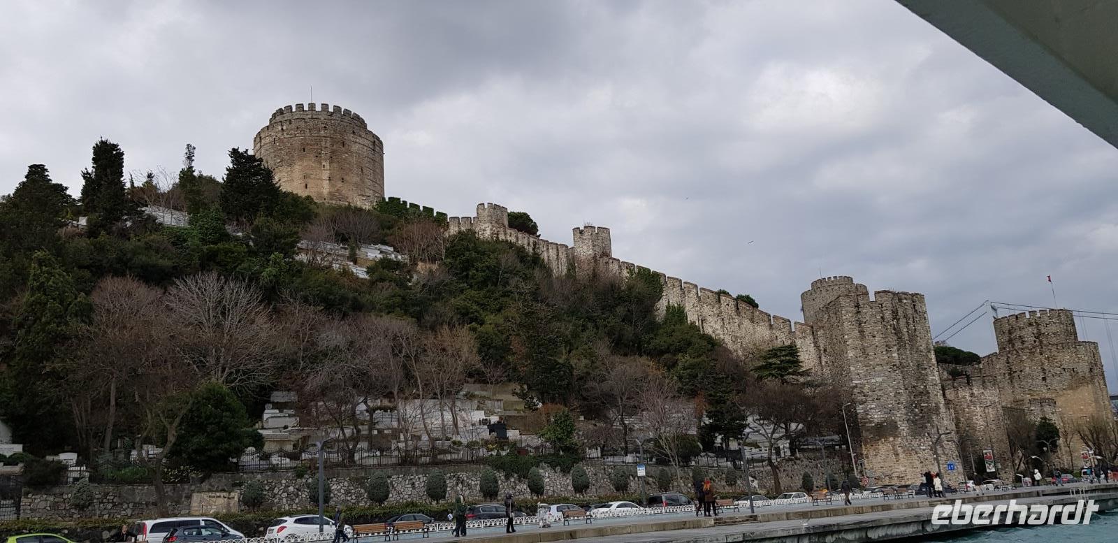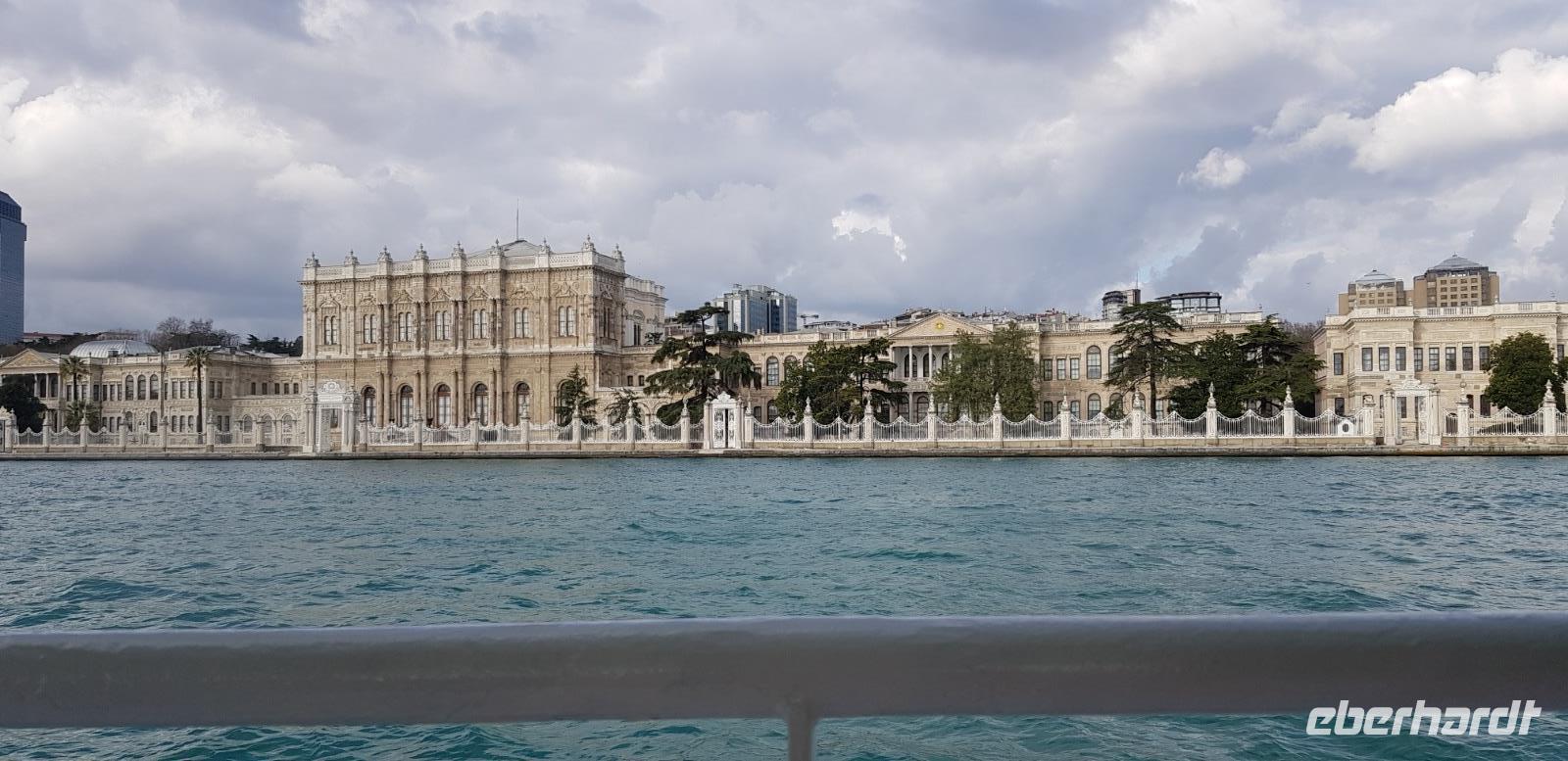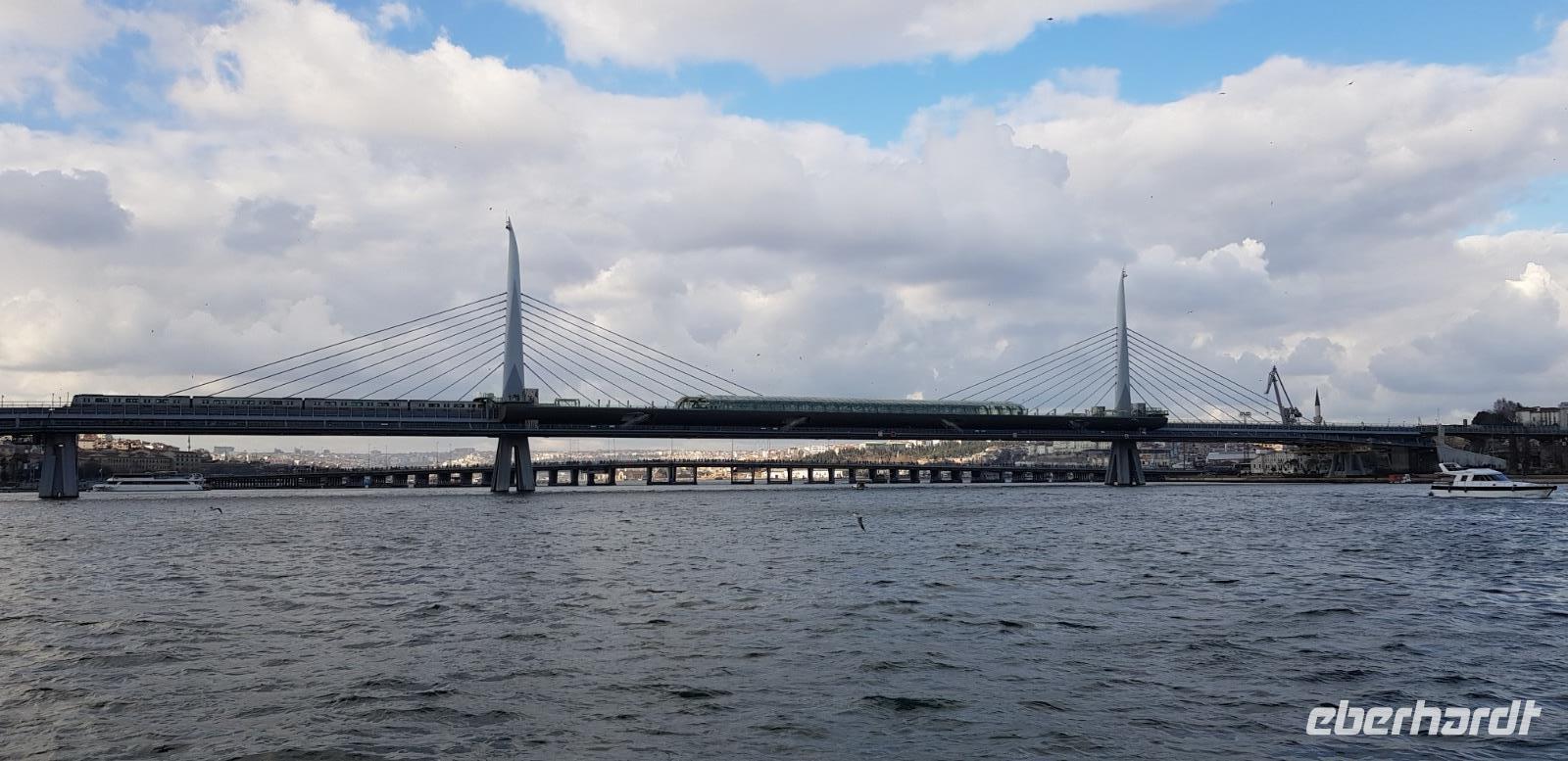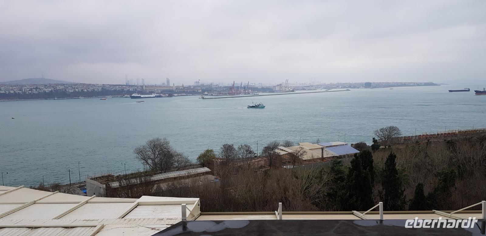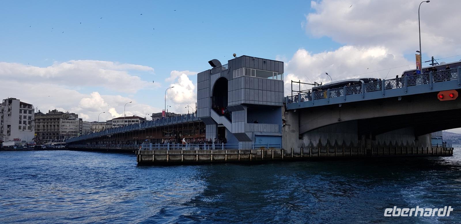 Dann treffen wir unseren Bus, der uns zur Anlegestelle unseres Bootes für die Bosporus Bootsfahrt bringt. Und schon geht es los. Wir sind heute die einzigen Gäste auf dem Boot. Wir legen ab und starten zu unserer Bootsfahrt. Inzwischen haben sich die Wolken etwas verzogen und die Sonne scheint auch mal. So sieht alles noch viel schöner aus. Wir sehen vom Bosporus aus moderne Architektur, historische Sehenswürdigkeiten, schicke Villen und Ferienhäuser, Fischerdörfer und die grünen Uferhänge. Sie sind jetzt zu dieser Jahreszeit etwas weniger grün, wir können ihre volle Schönheit aber ahnen. Und Serdar gibt uns über das Bordmikrofon die entsprechenden Erläuterungen dazu - einfach Spitze. Und wir fahren unter mehreren Brücken, die sich über den Bosporus spannen, hindurch. Kurz vor der neuesten Brücke wendet unser Boot und wir fahren zu unserem Anleger kurz hinter der Galata Brücke zurück. In wenigen Minuten kommt unser Bus und holt uns ab.