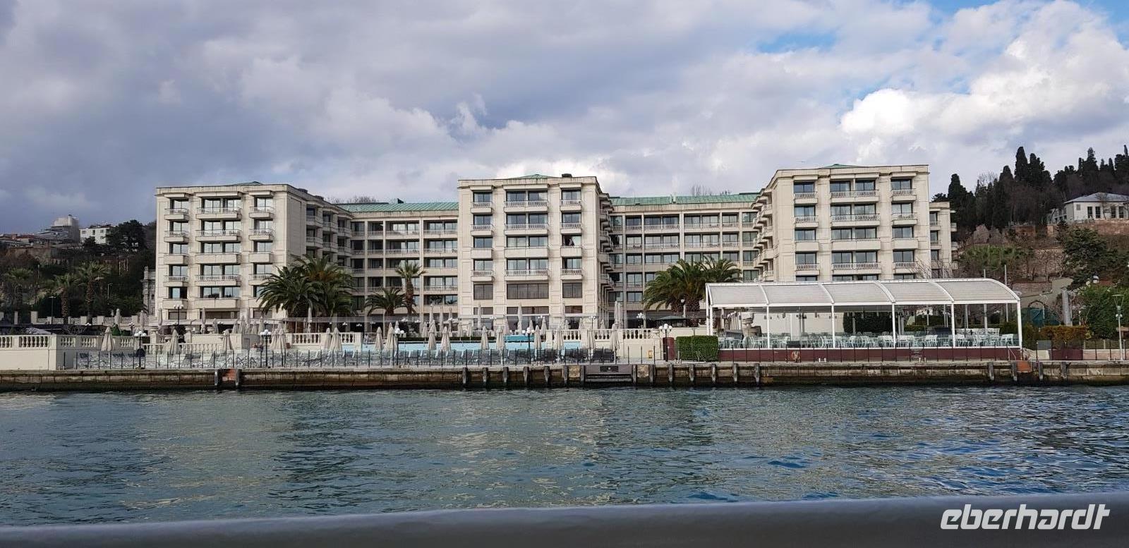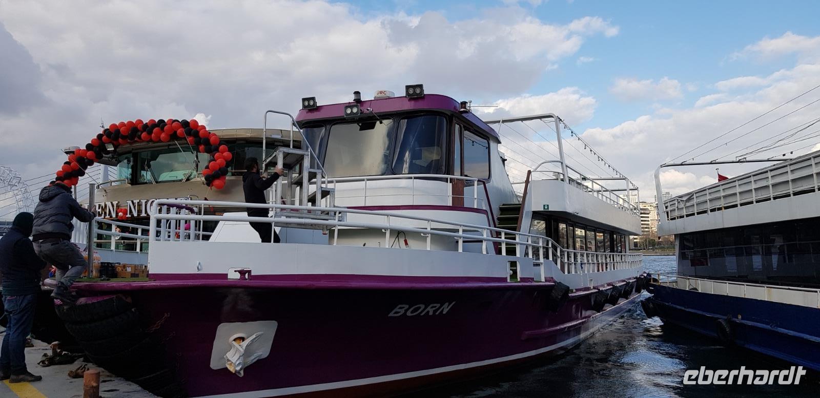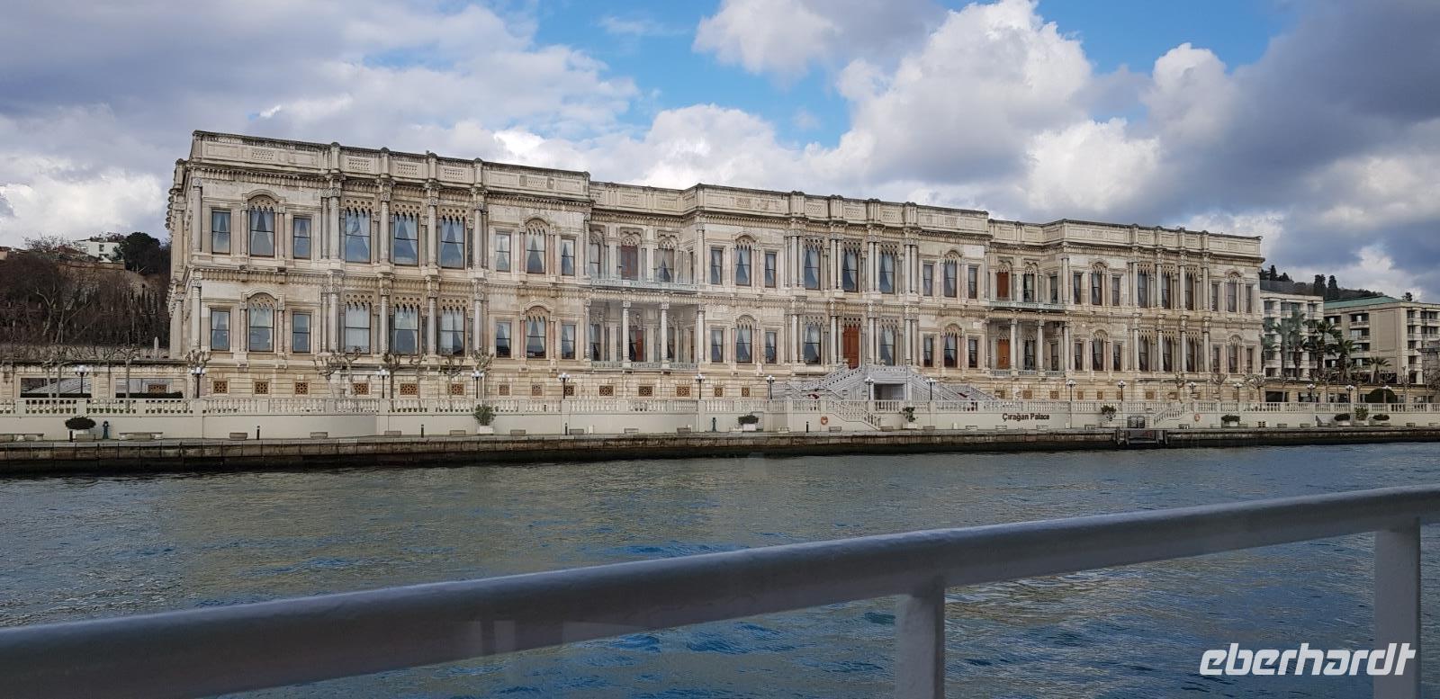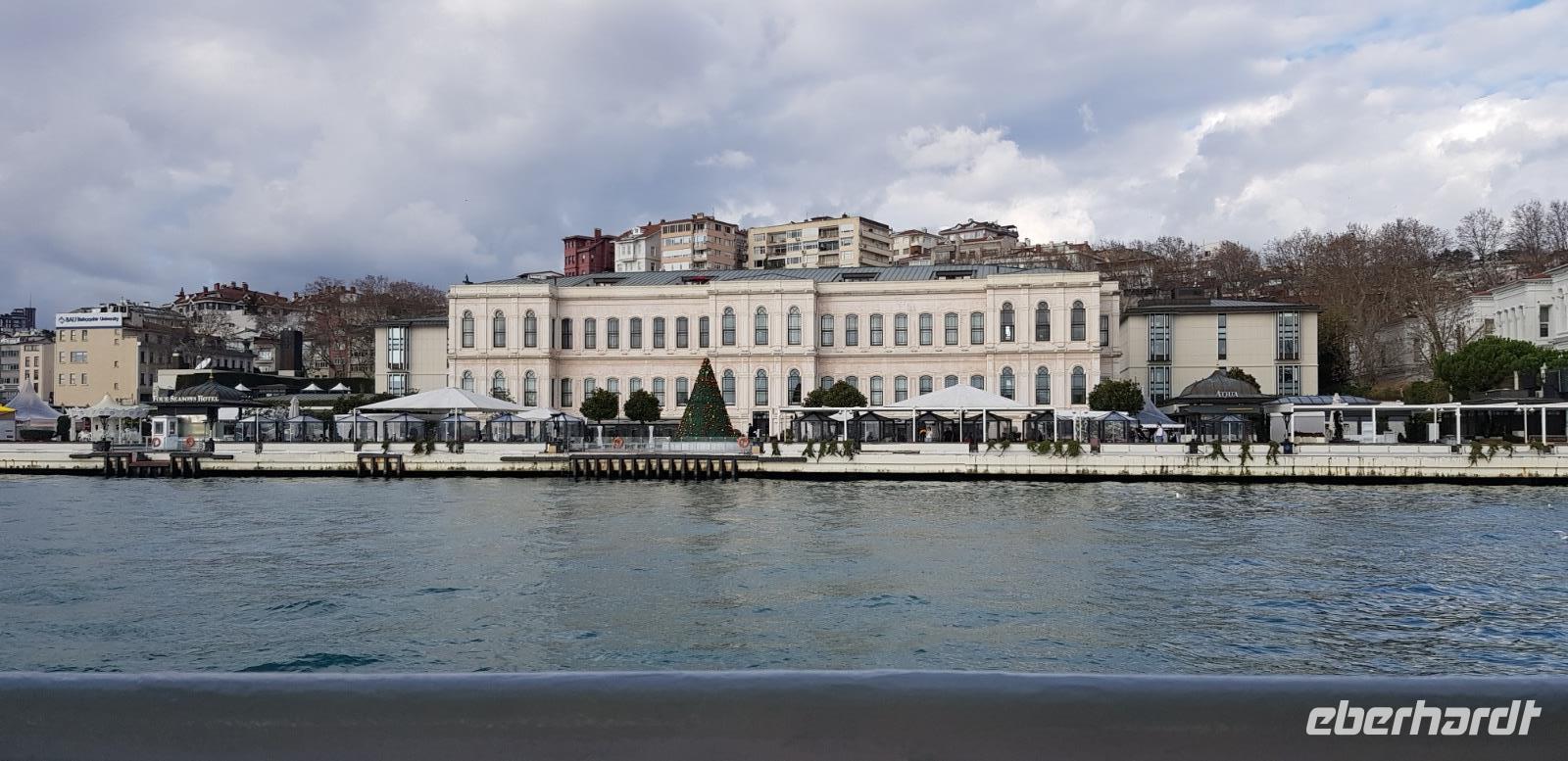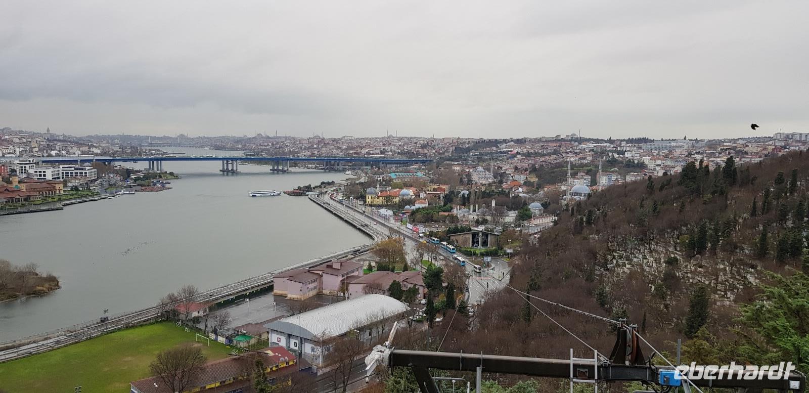 Dann treffen wir unseren Bus, der uns zur Anlegestelle unseres Bootes für die Bosporus Bootsfahrt bringt. Und schon geht es los. Wir sind heute die einzigen Gäste auf dem Boot. Wir legen ab und starten zu unserer Bootsfahrt. Inzwischen haben sich die Wolken etwas verzogen und die Sonne scheint auch mal. So sieht alles noch viel schöner aus. Wir sehen vom Bosporus aus moderne Architektur, historische Sehenswürdigkeiten, schicke Villen und Ferienhäuser, Fischerdörfer und die grünen Uferhänge. Sie sind jetzt zu dieser Jahreszeit etwas weniger grün, wir können ihre volle Schönheit aber ahnen. Und Serdar gibt uns über das Bordmikrofon die entsprechenden Erläuterungen dazu - einfach Spitze. Und wir fahren unter mehreren Brücken, die sich über den Bosporus spannen, hindurch. Kurz vor der neuesten Brücke wendet unser Boot und wir fahren zu unserem Anleger kurz hinter der Galata Brücke zurück. In wenigen Minuten kommt unser Bus und holt uns ab.