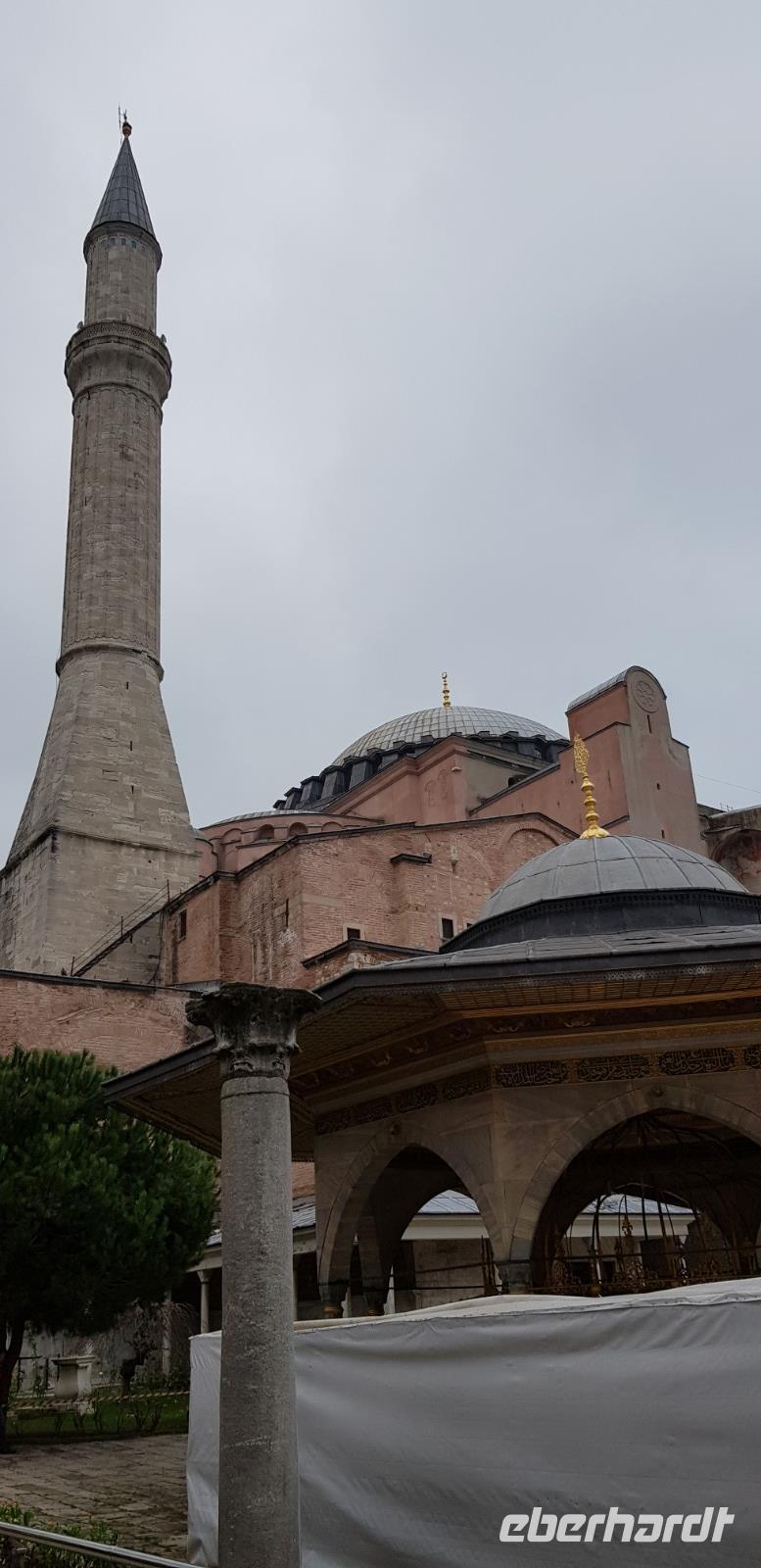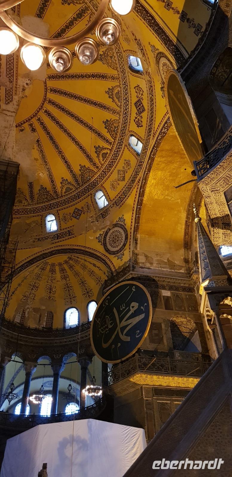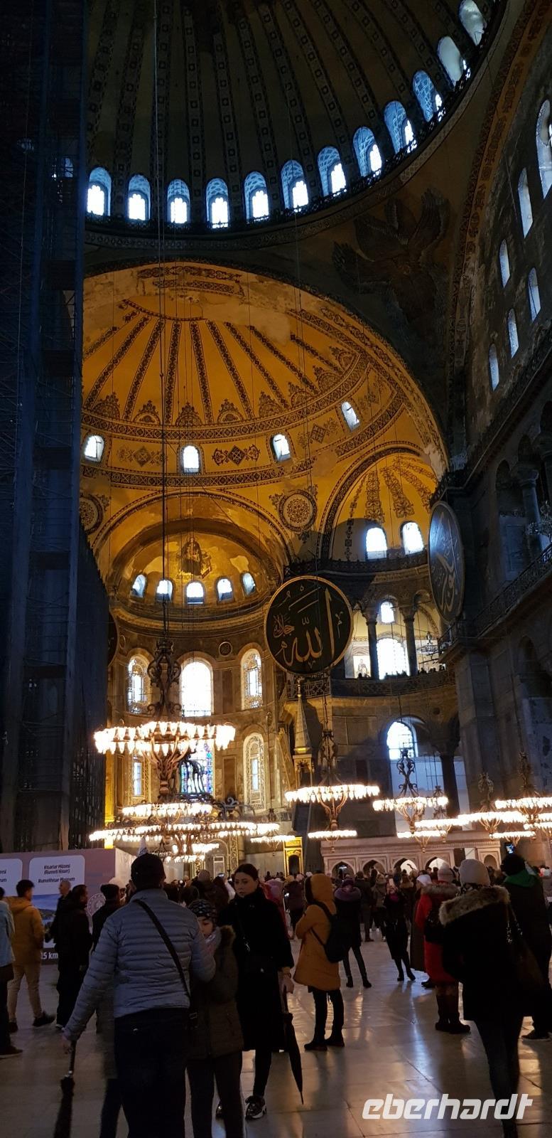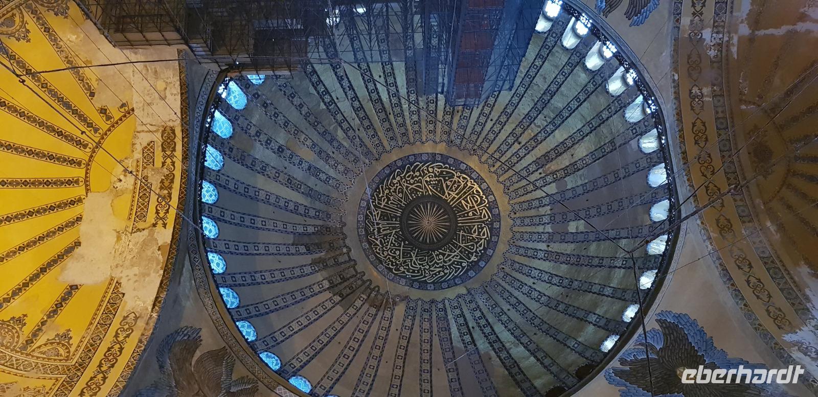 Dann geht es wieder zurück zur Hagia Sophia. Der Ansturm hat sich gelegt, so dass wir nun die Hagia Sophia in Ruhe besichtigen können. Die Hagia Sophia "Kirche der Weisheit" ist ca. 1400 Jahre alt. Sie wurde im 6.Jh als Kirche gebaut und war zu damaliger Zeit die größte Kirche des Christentums. Später wurden die vier Minarette angebaut. Nach der Eroberung Konstantinopels wurde sie 1453 zur Moschee des Sultans erklärt und seit 1935 ist sie Museum. Die Zeit als Moschee prägt die innere Ausstattung. In den Vorräumen können aber auch noch wundervolle christliche Mosaike aus byzantinischen Zeiten betrachtet werden. Das architektonisch Besondere der Hagia Sophia ist die scheinbar freischwebende riesige Kuppel.