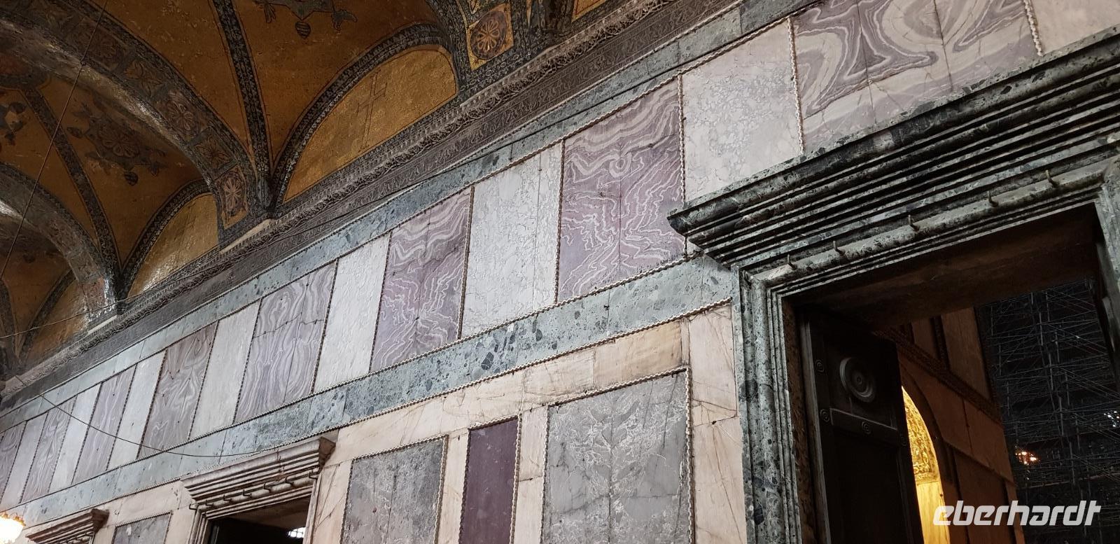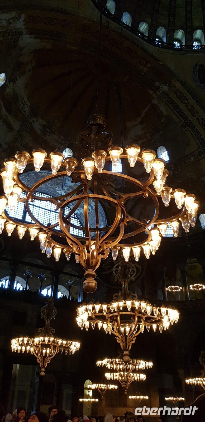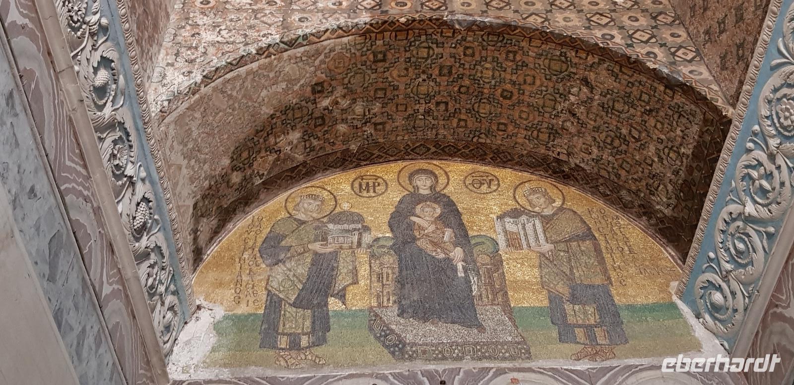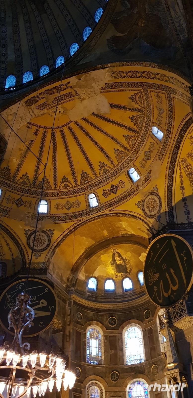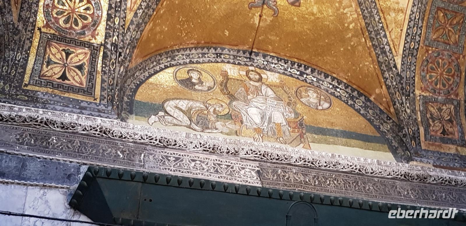 Dann geht es wieder zurück zur Hagia Sophia. Der Ansturm hat sich gelegt, so dass wir nun die Hagia Sophia in Ruhe besichtigen können. Die Hagia Sophia "Kirche der Weisheit" ist ca. 1400 Jahre alt. Sie wurde im 6.Jh als Kirche gebaut und war zu damaliger Zeit die größte Kirche des Christentums. Später wurden die vier Minarette angebaut. Nach der Eroberung Konstantinopels wurde sie 1453 zur Moschee des Sultans erklärt und seit 1935 ist sie Museum. Die Zeit als Moschee prägt die innere Ausstattung. In den Vorräumen können aber auch noch wundervolle christliche Mosaike aus byzantinischen Zeiten betrachtet werden. Das architektonisch Besondere der Hagia Sophia ist die scheinbar freischwebende riesige Kuppel.