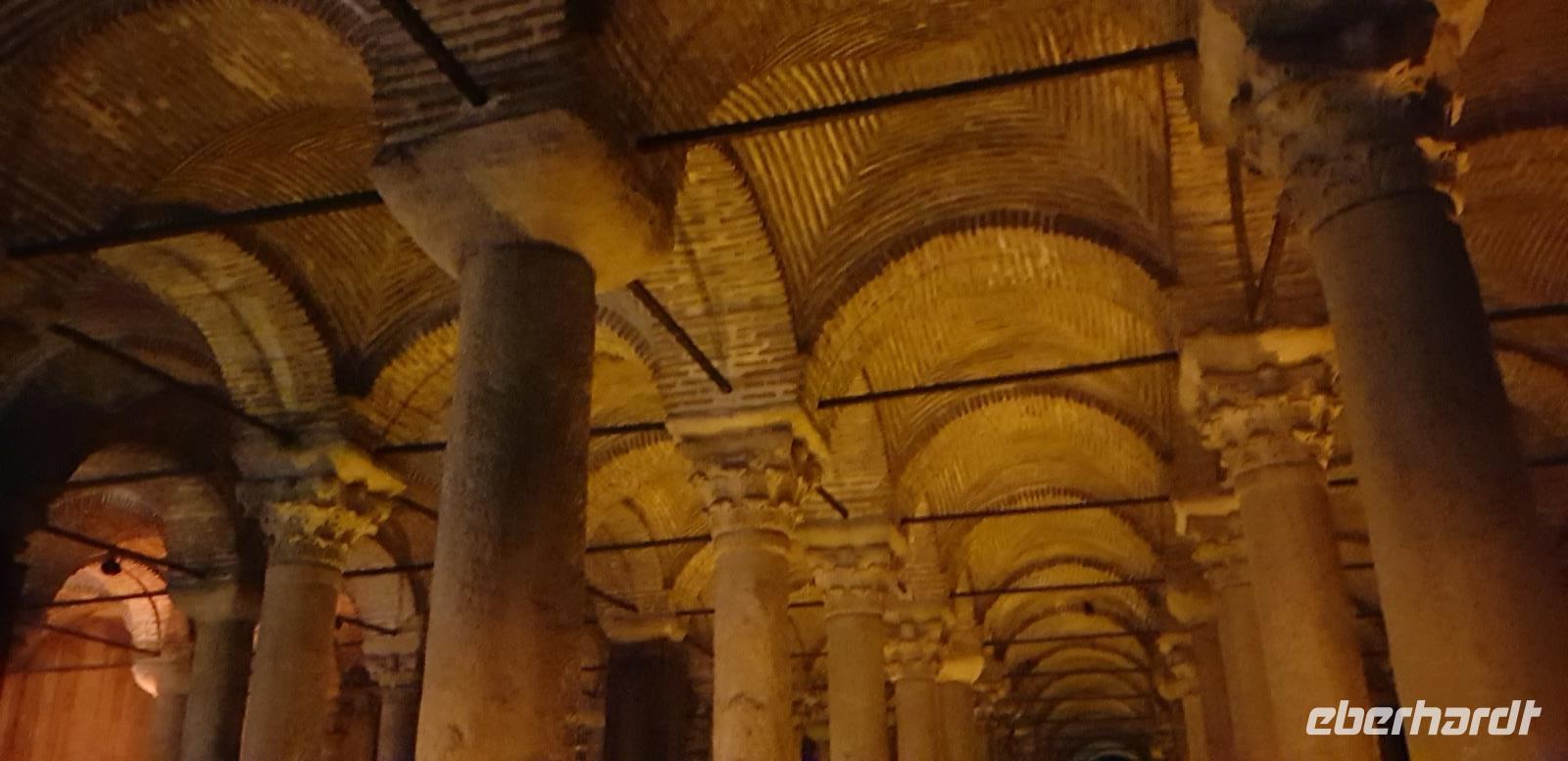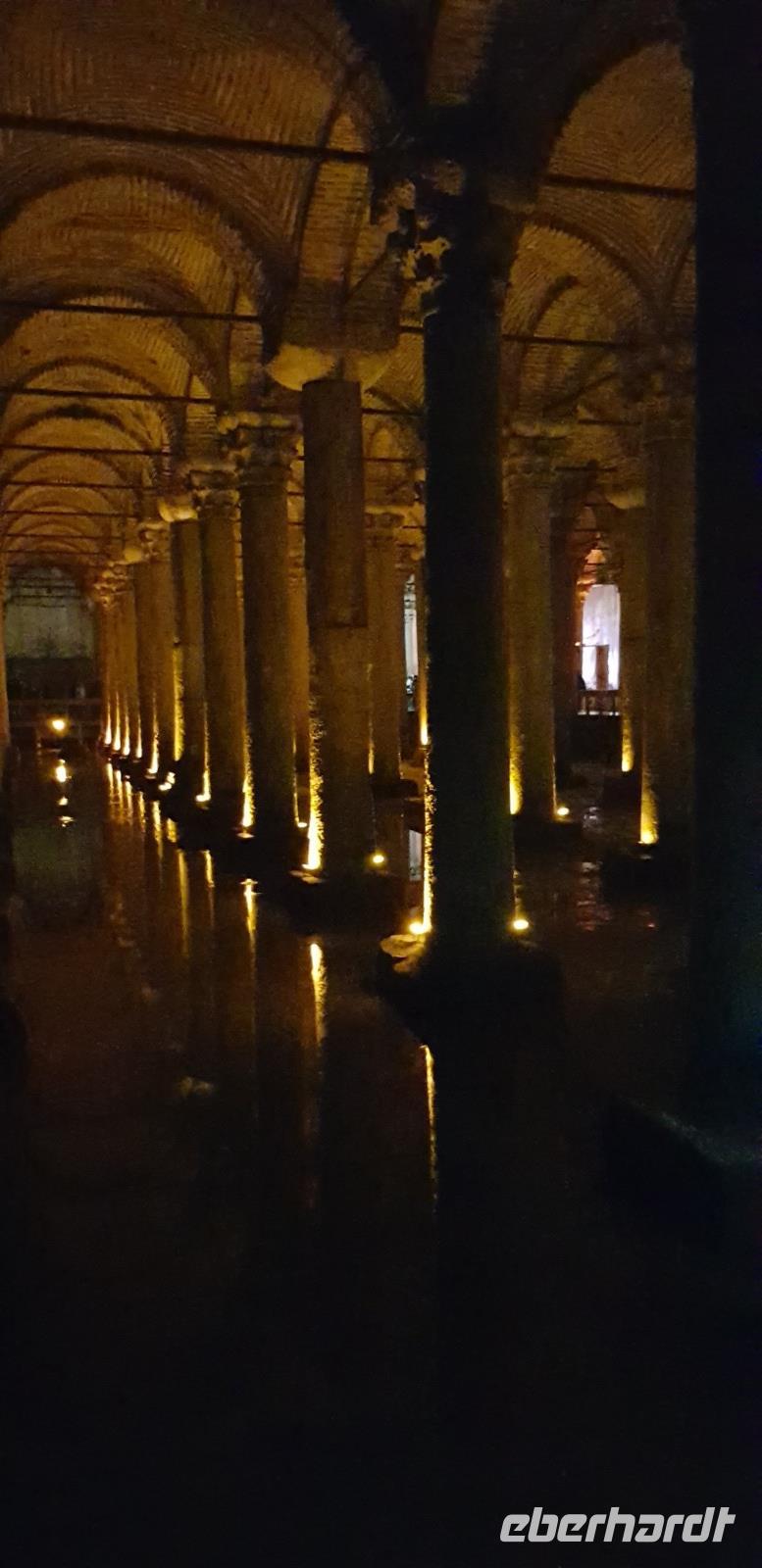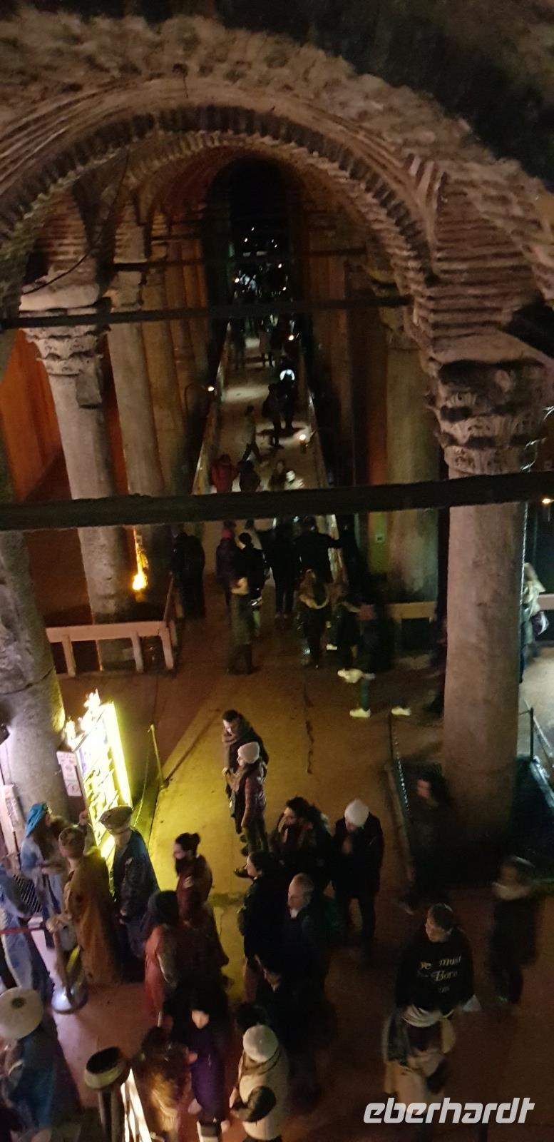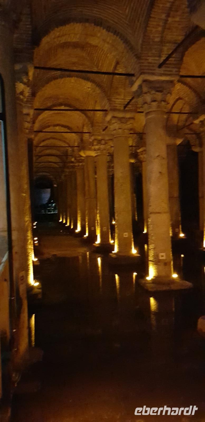 Zum Abschluss unseres Rundganges besuchen wir noch die Yerebatan Zisterne. Sie befindet sich unmittelbar gegenüber der Hagia Sophia. Im alten Byzanz diente sie der Stadt für die Wasserversorgung. Wenn man hinunter steigt, steht man plötzlich in einem riesigen unterirdischen Raum. Noch immer ist Wasser in der Zisterne. Auf Stegen kann man aber in der Zisterne spazieren. Einige hundert Säulen stützen die Decke. Die Zisterne wird auch "versunkenes Schloss" genannt.