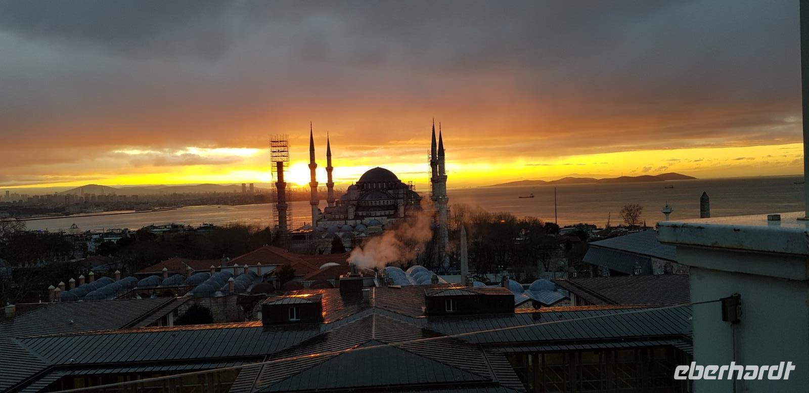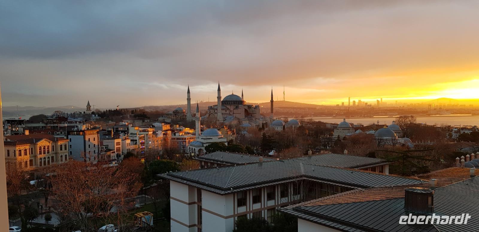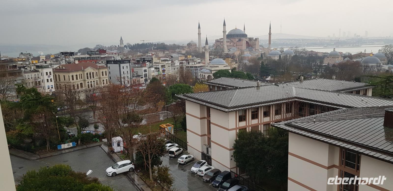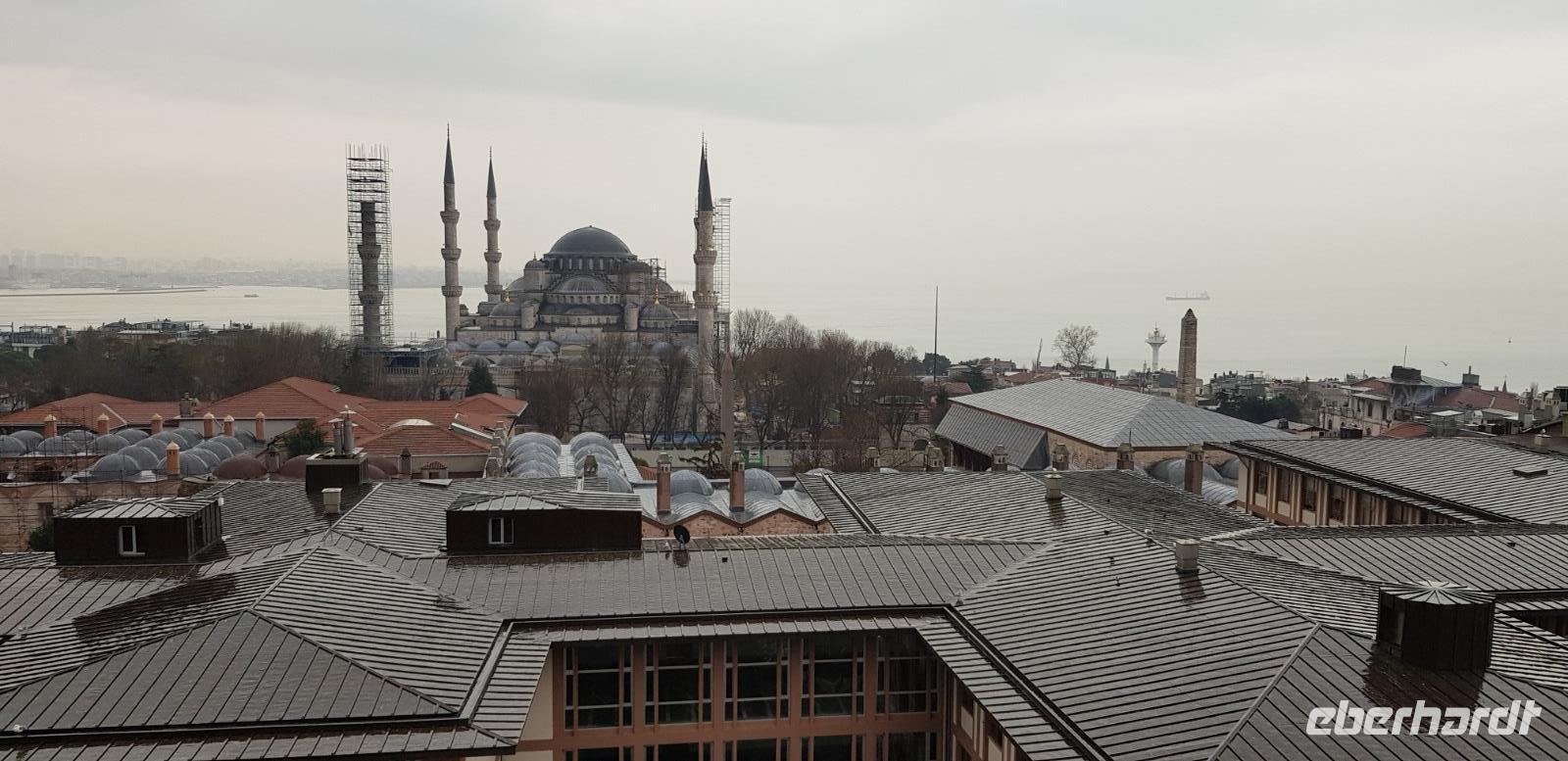 Ab 7.30 Uhr können wir uns bei einem reichhaltigen Frühstück in der sechsten Etage unseres Hotels für den Tag stärken. Vom Restaurant und der dazugehörigen Terrasse aus bietet sich ein atemberaubender Blick über die Stadt mit der Blauen Moschee und der Hagia Sophia zum Bosporus und auch zum Marmara Meer, selbst im Morgengrauen und etwas regnerischem Wetter wie heute. Da schmeckt das Frühstück gleich nochmal so gut.