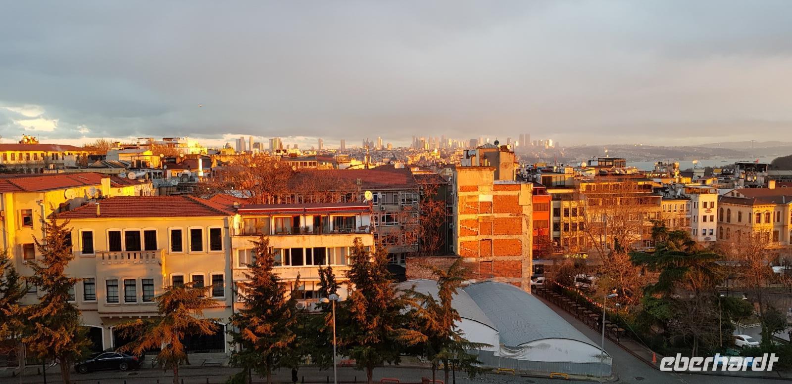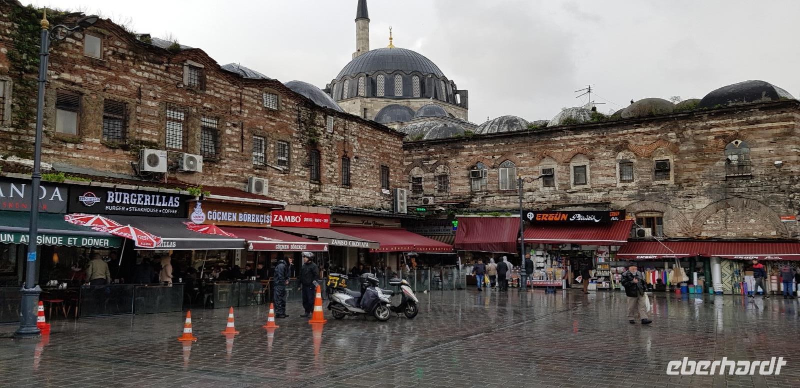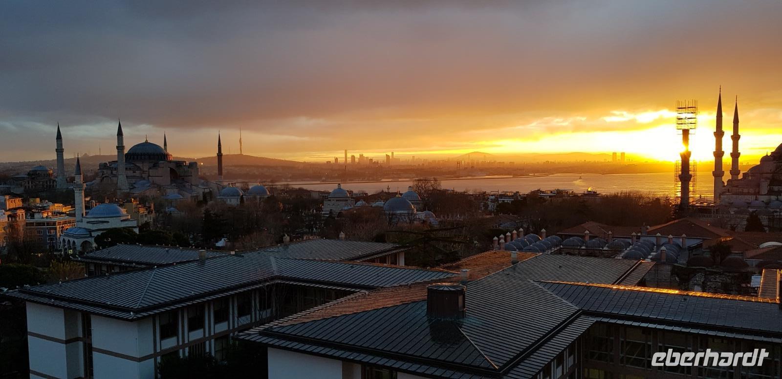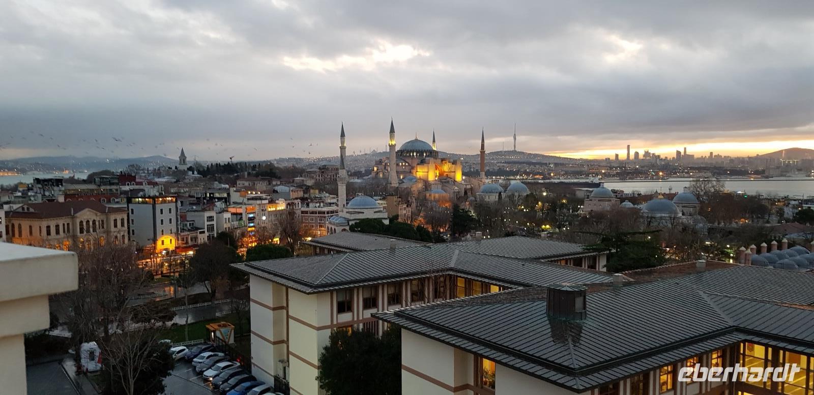 Ab 7.30 Uhr können wir uns bei einem reichhaltigen Frühstück in der sechsten Etage unseres Hotels für den Tag stärken. Vom Restaurant und der dazugehörigen Terrasse aus bietet sich ein atemberaubender Blick über die Stadt mit der Blauen Moschee und der Hagia Sophia zum Bosporus und auch zum Marmara Meer, selbst im Morgengrauen und etwas regnerischem Wetter wie heute. Da schmeckt das Frühstück gleich nochmal so gut.
