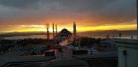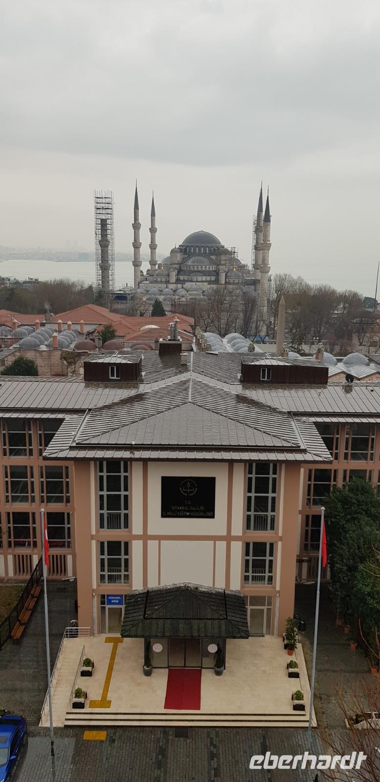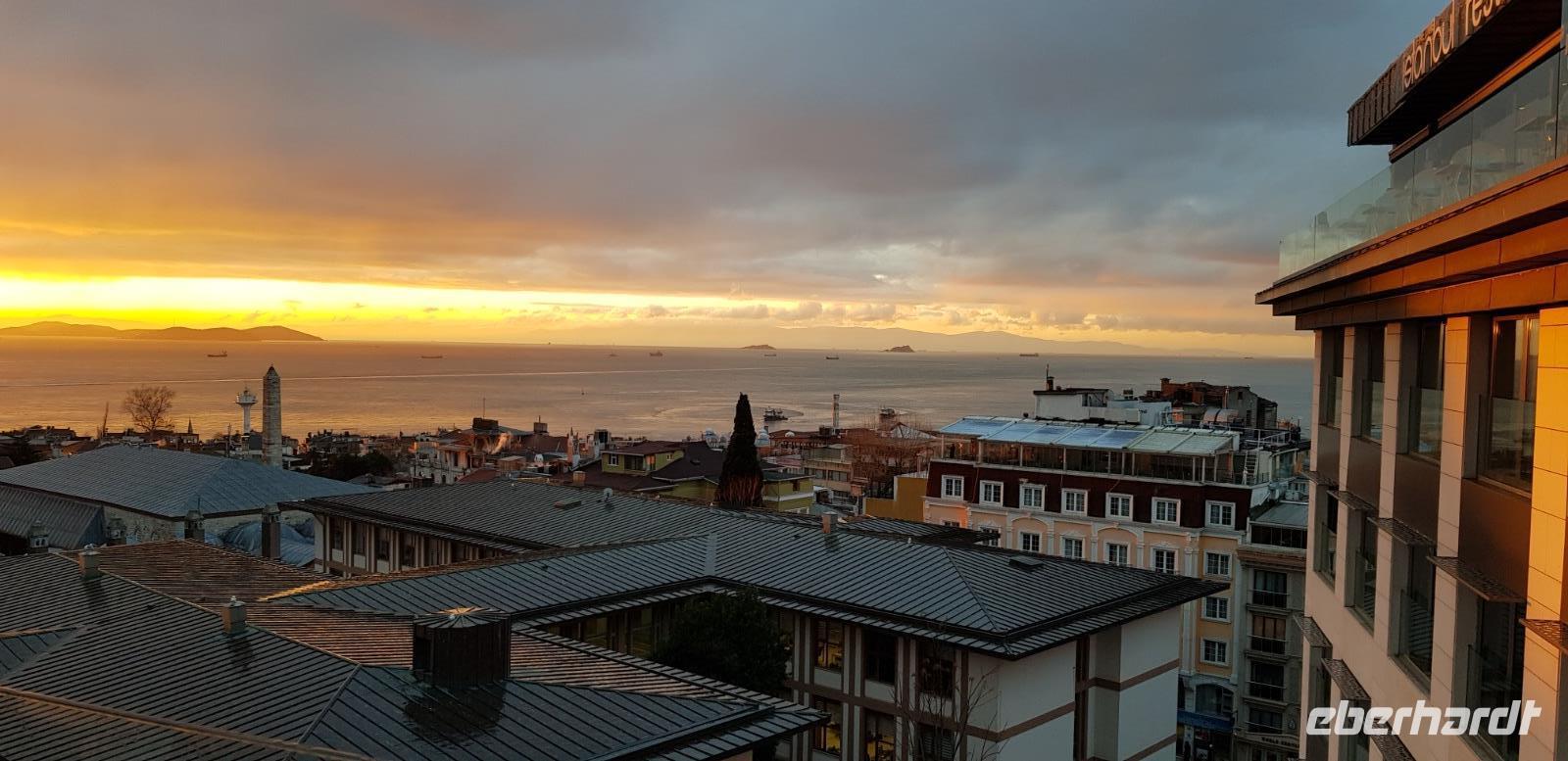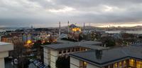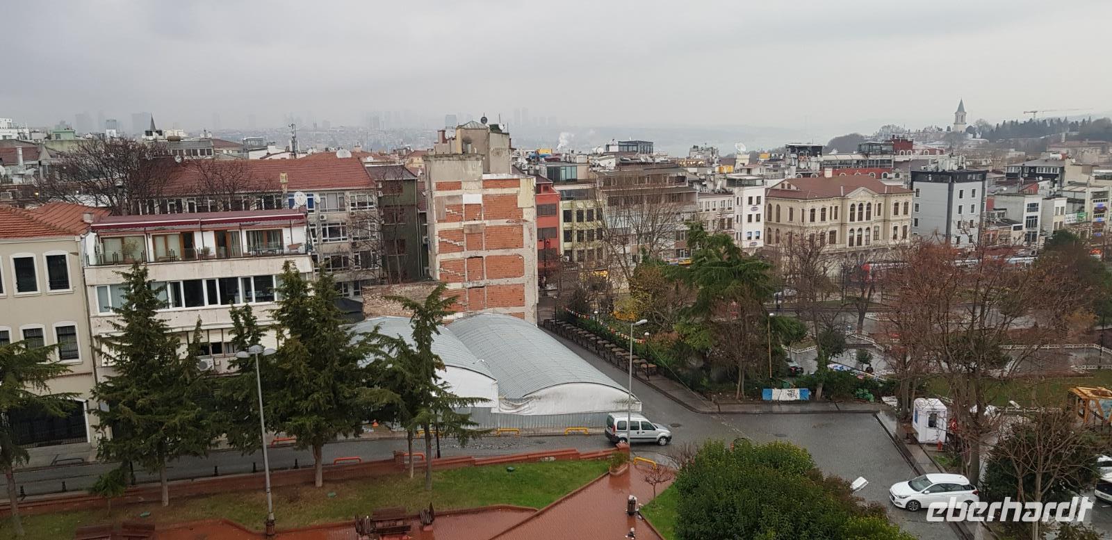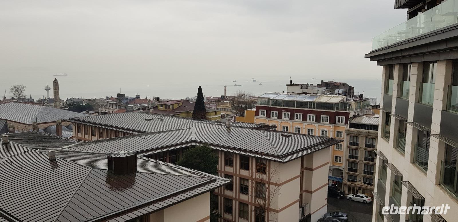 Ab 7.30 Uhr können wir uns bei einem reichhaltigen Frühstück in der sechsten Etage unseres Hotels für den Tag stärken. Vom Restaurant und der dazugehörigen Terrasse aus bietet sich ein atemberaubender Blick über die Stadt mit der Blauen Moschee und der Hagia Sophia zum Bosporus und auch zum Marmara Meer, selbst im Morgengrauen und etwas regnerischem Wetter wie heute. Da schmeckt das Frühstück gleich nochmal so gut.