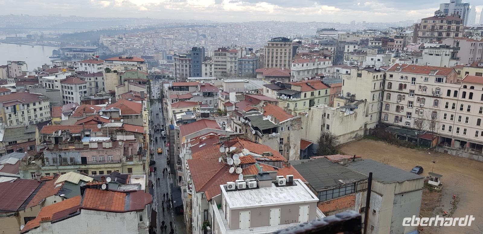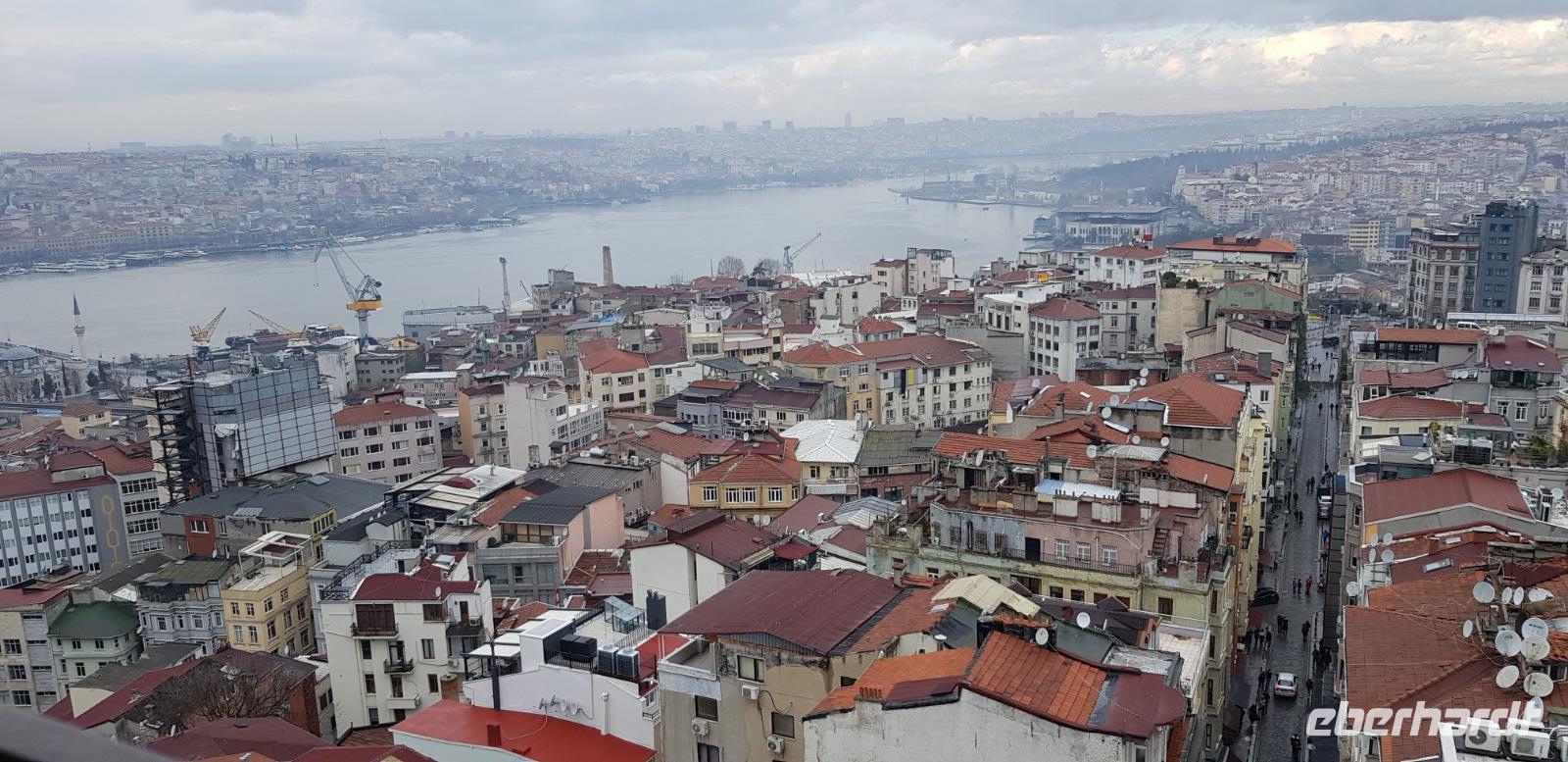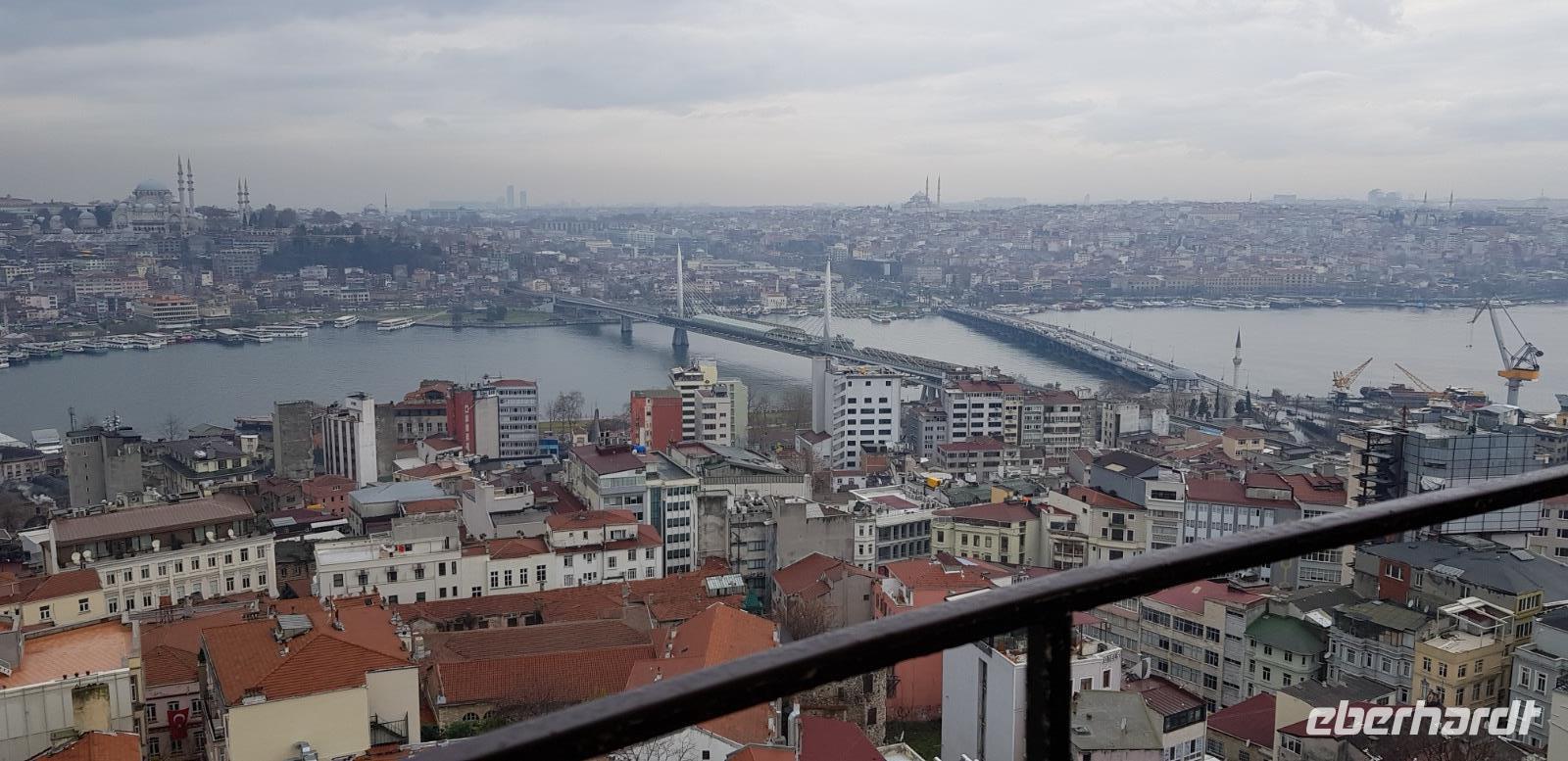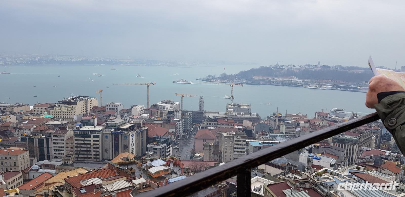 Heute ist auch in Istanbul Feiertag und da ist nicht alles geöffnet, deshalb haben wir unseren Besichtigungsplan etwas geändert. Nach dem gemütlichen Frühstück im Hotel starten wir 11.00 Uhr zu unseren Besichtigungen. Der Bus holt uns ab. Wir fahren über die Galata Brücke zum Galata Turm. Serdar hofft, dass jetzt dort noch nicht so viele Besucher sind, denn die Aussichtsgalerie ist sehr eng und klein und da gibt es dann lange Wartezeiten. Wir sind zum richtigen Zeitpunkt am Turm und können nach einer kurzen Wartezeit auf den Turm hinauf fahren. Von der Aussichtsgalerie aus bietet sich ein toller Blick auf die Stadt. So bekommen wir eine Vorstellung von der Größe der Stadt und der herrlichen Lage. Nachdem wir uns sattgesehen haben fahren wir wieder hinunter und weiter geht es ein Stück zu Fuß durch die engen Gassen des Stadtviertels Karaköy.